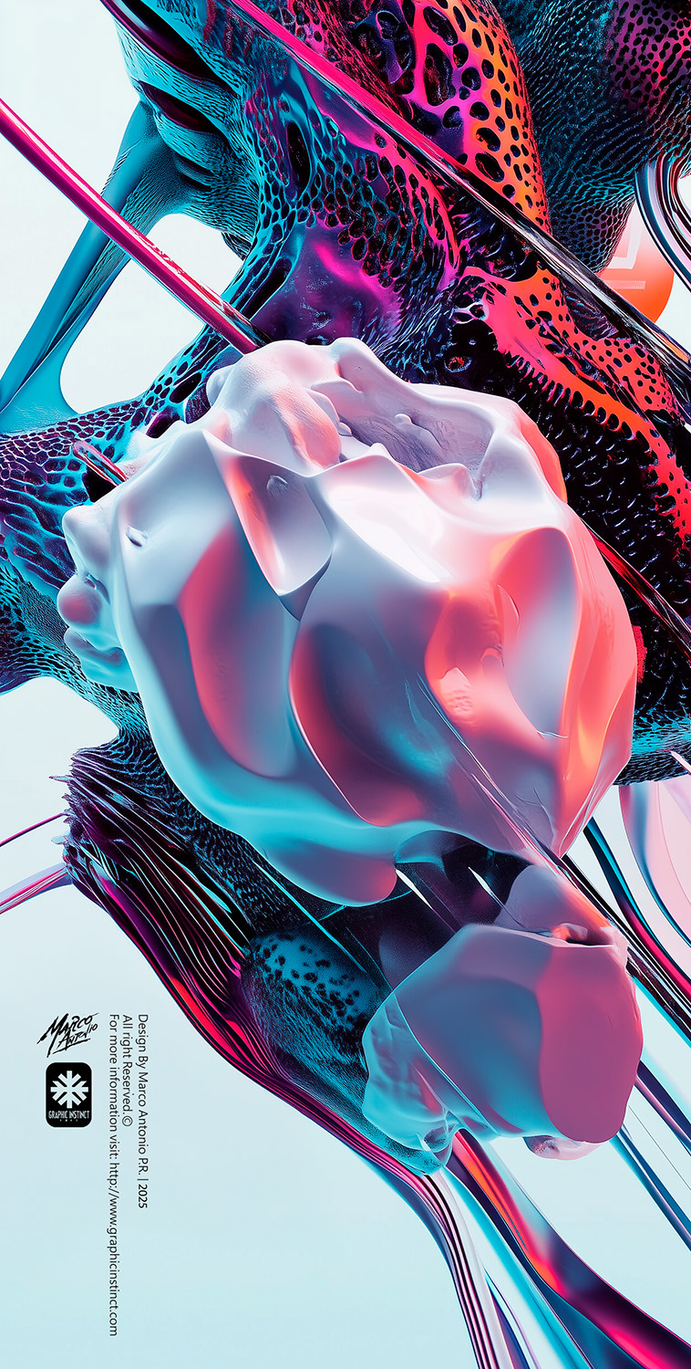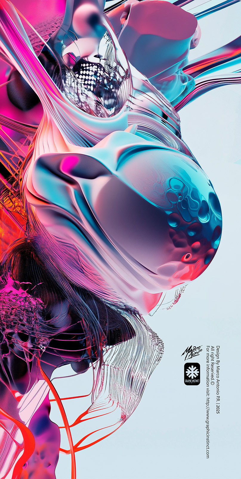 The “3D Dynamics in Mixed Media” series explores the convergence of the digital and the organic, manifesting an aesthetic where three-dimensional dynamism blends with textures and structures typical of contemporary abstraction. Within the context of current digital art, this work aligns with the evolution of generative aesthetics and algorithmic design, following the legacy of artists such as Casey Reas, a pioneer of generative art, Refik Anadol, a master of data integration and digital visualization, and Beeple, who revolutionized the perception of digital art in the realm of crypto art.
