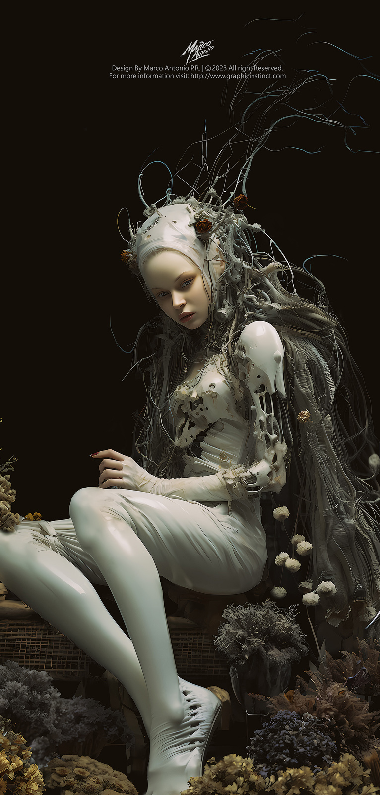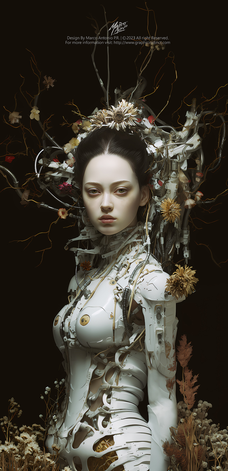 In the center, this imposing cyborg shows that her body is a mosaic between humans and machines. His face is a fragile porcelain mask, which reveals the longing to capture the faded remains of humanity. In his gaze, a faint aura of hope that shines through the desolation.