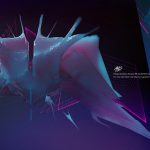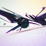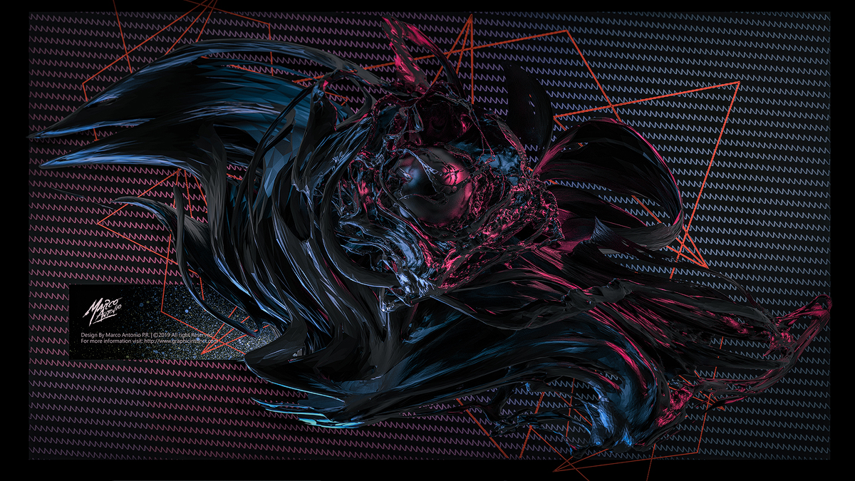 Description: Aggressive design, chaotic shape with saturated contrasting colors in a dark background scene.