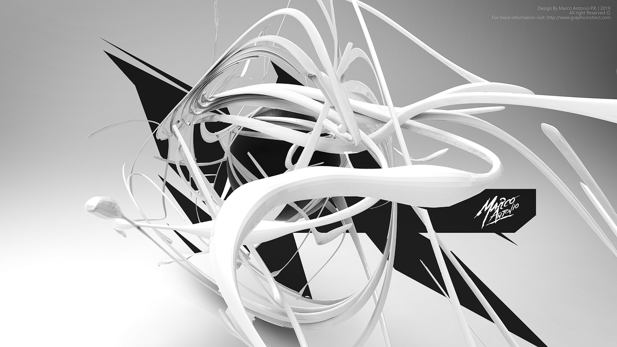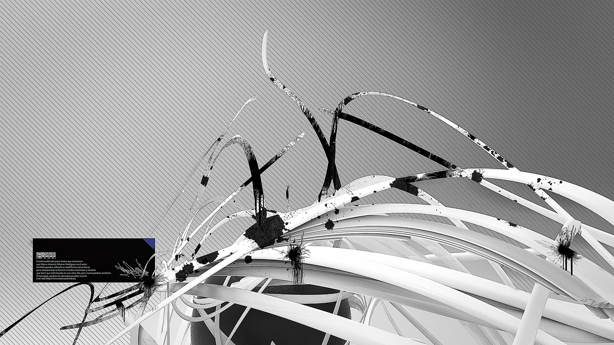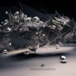 Description: Set of abstract digital illustrations developed in blender. Chaotic 3d shapes on light background. Point of view in perspective.Vector shapes have been added to the illustration to add detail, made in Inkscape and combined in gimp during the composition process.