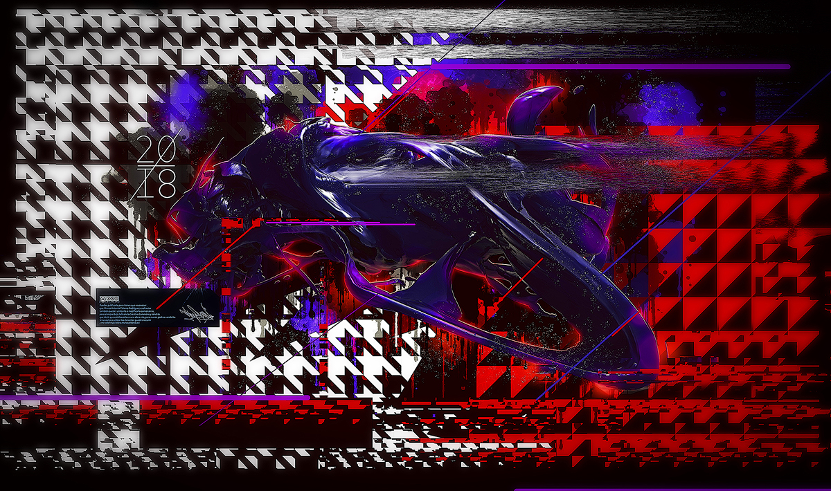 The predominant colors are dark blue/purple for the central figure, intense red for the triangles, and black and white for the background patterns. Magenta and light blue lines and strokes are seen crossing the image, accentuating the sensation of distortion and movement. The presence of the number “2018” in the upper left suggests a dating of the work or a possible coded message. The image conveys a disturbing and oppressive atmosphere, reflecting the theme of media manipulation. The use of digital distortion, the contrast of patterns, and the color palette contribute to creating a striking and disturbing image.