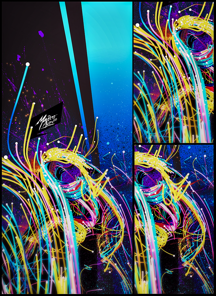 Description: 3d Digital Ilustration. Abstract colorfull composition on dark background; aggressive shapes with contrasting colors.