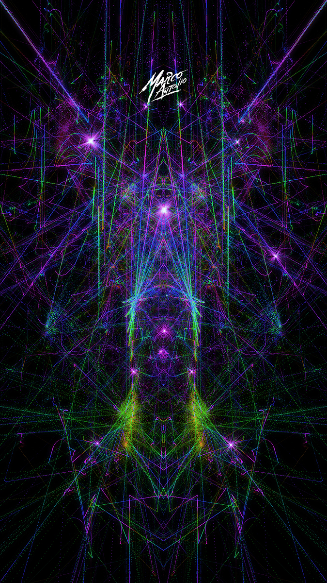 Composition: The composition is symmetrical, with a central vertical axis of symmetry. The image is densely packed with lines and points of light, creating a sense of depth and complexity. The use of color is vibrant, with a predominance of blues, purples, greens, and hints of yellow/gold.