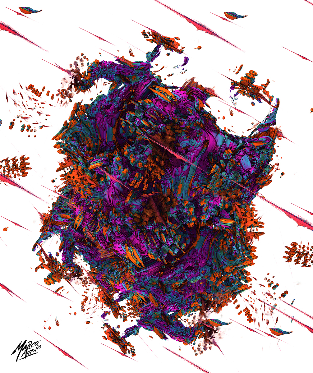- Texture and Form: The intricate textures and complex form of the central mass suggest the use of algorithms or procedural generation techniques. The form seems to be an aggregation of smaller elements, creating a sense of depth and complexity. The texture could be inspired by fractal geometry, which is known for its intricate, self-similar patterns.