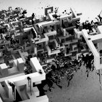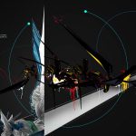 Description: 3d digital illustration. Chaotic composition floating in space. Model and particle system made in blender.