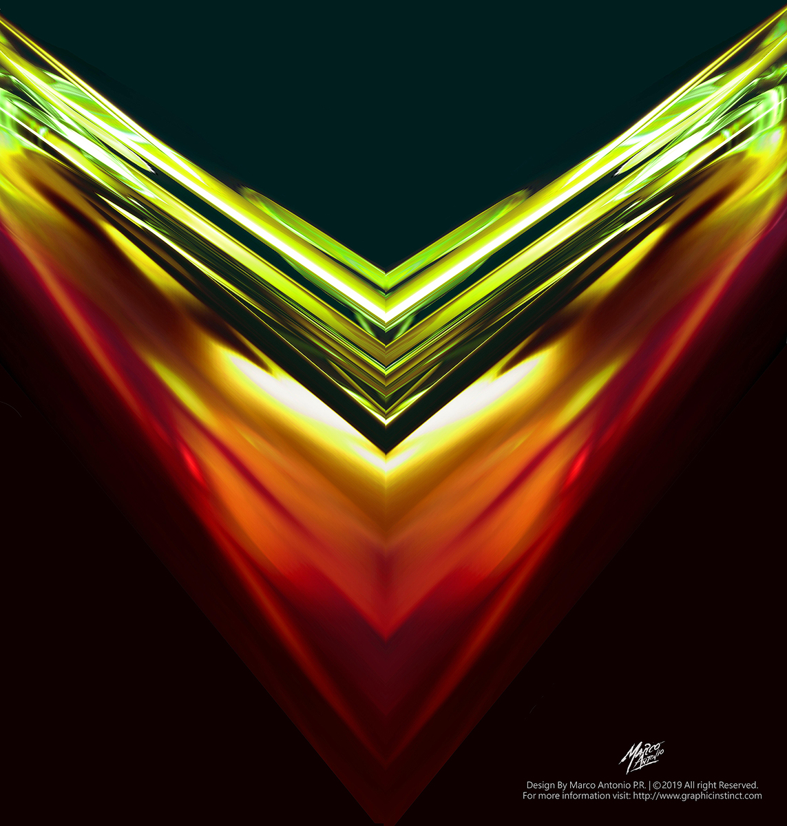 Description: Both works are characterized by the use of dynamic lines and vibrant colors that converge at focal points, creating a sense of movement and energy. The first image (the swirl) presents a centrifugal structure, with lines expanding from the center outwards, suggesting an explosion or emanation. The second image, in the shape of a “V”, shows a centripetal structure, with lines converging towards a central point, creating a sense of concentration or focus.