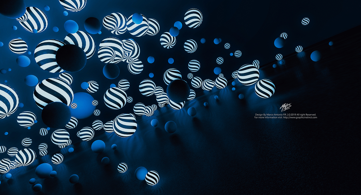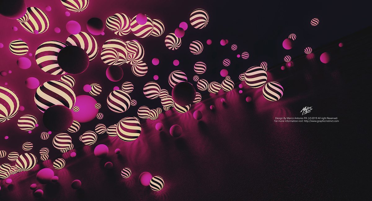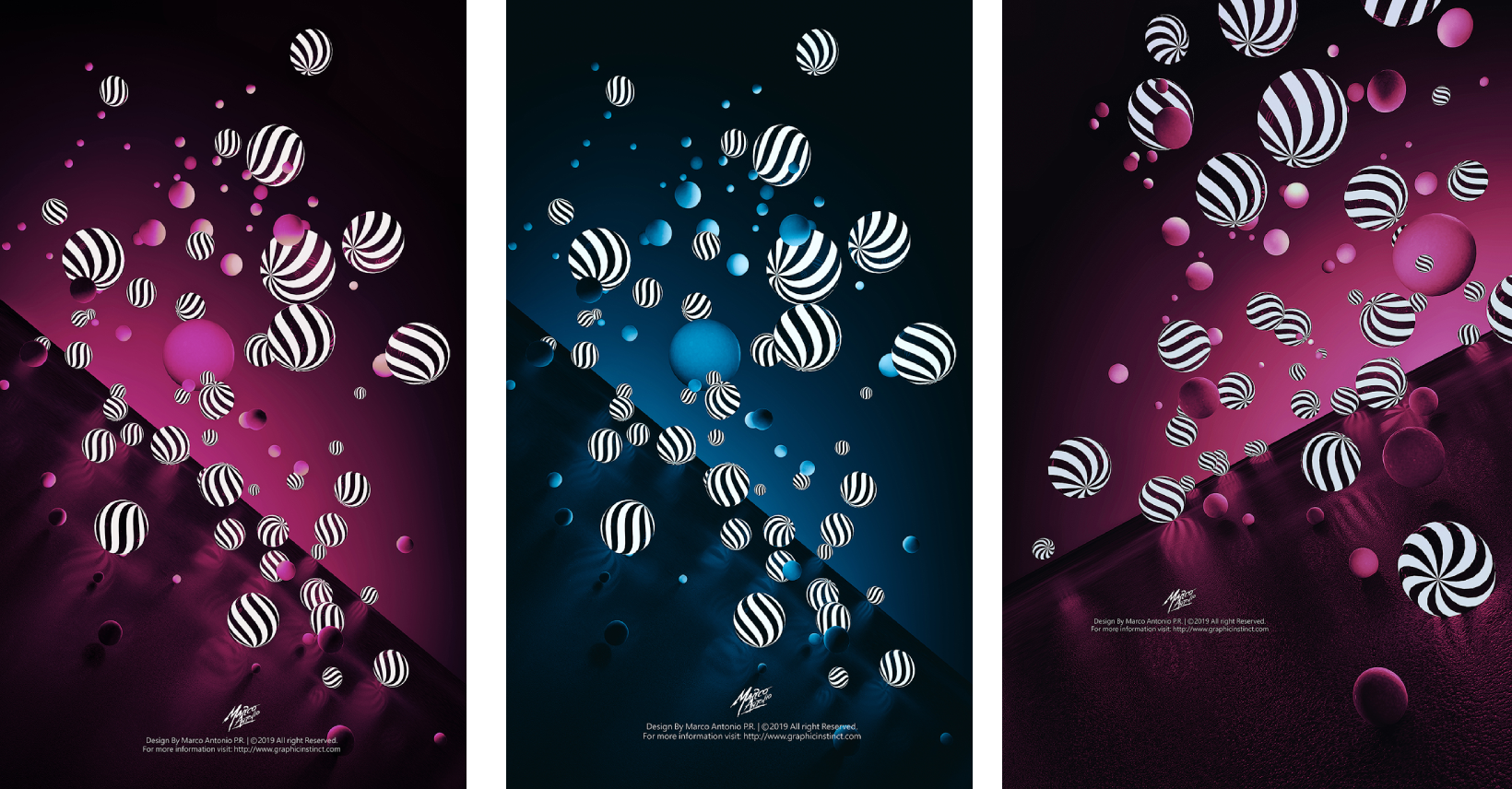 Description: 3d digital illustration, different dark scenes with spheres illuminated in pink and blue tones, made in blender with the cycles rendering engine.