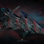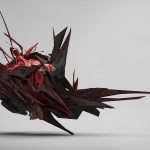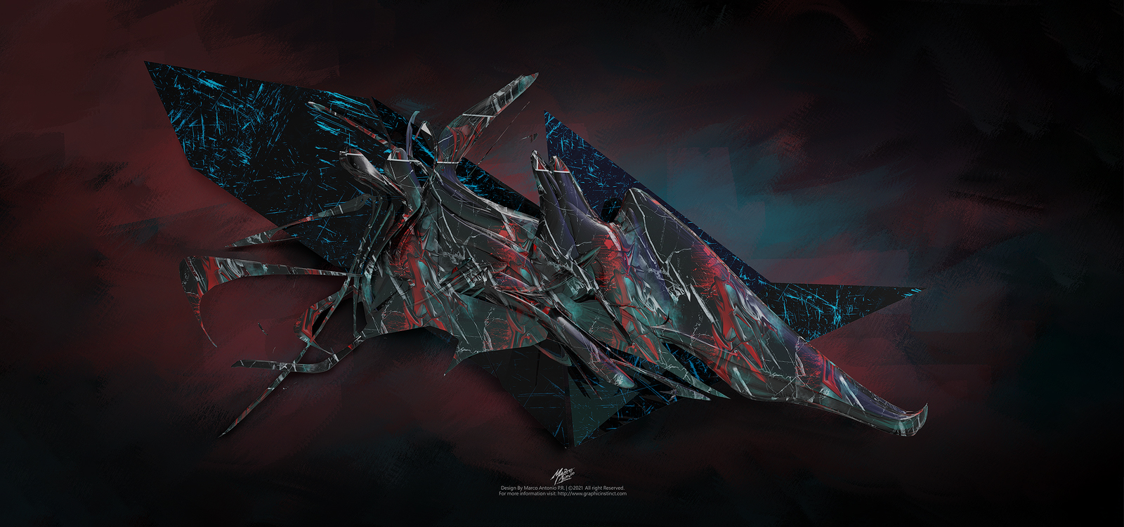 Description: The image presents an abstract and complex form, composed of multiple elements that appear to intertwine and disintegrate simultaneously. Angular and fragmented lines predominate, suggesting a collapsing structure. The color palette focuses on dark tones, with touches of intense red and bright blue that evoke the idea of fire and decomposition. The overall texture is rough and fragmented, with effects of brightness and transparency that add depth to the image. The composition is dynamic and asymmetrical, generating a sense of movement and tension. The work is characterized by a high level of detail and visual complexity that invites contemplation and reflection. Meticulous work on the modulation of light and shadow can be seen, contributing to the sense of volume and three-dimensionality of the central form.
