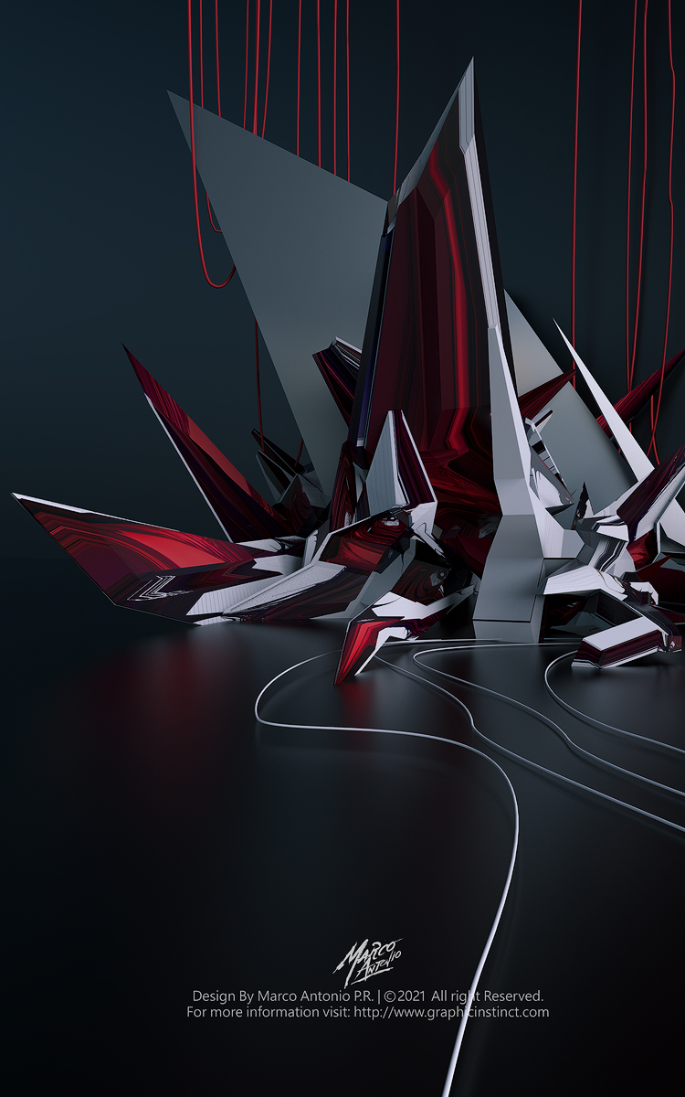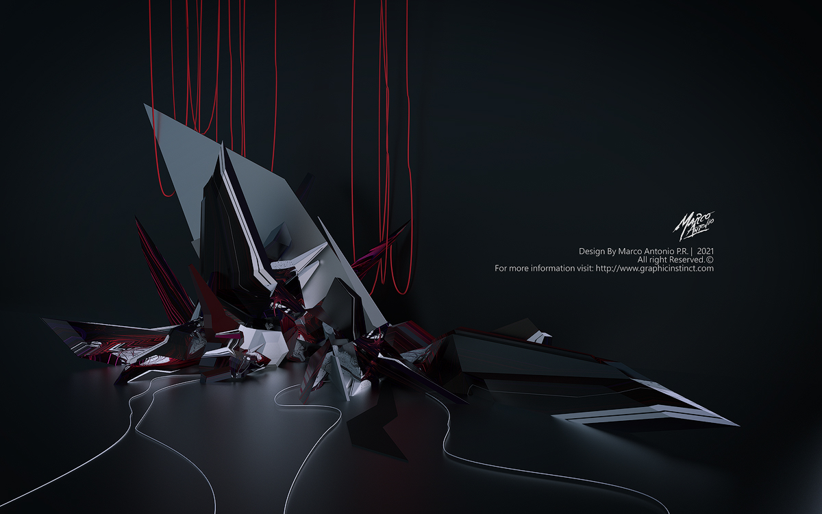 Description: Set of abstract illustrations. Chaotic 3d shape with saturated colors on dark background. Developed in a blender some color and lighting adjustments with gimp.