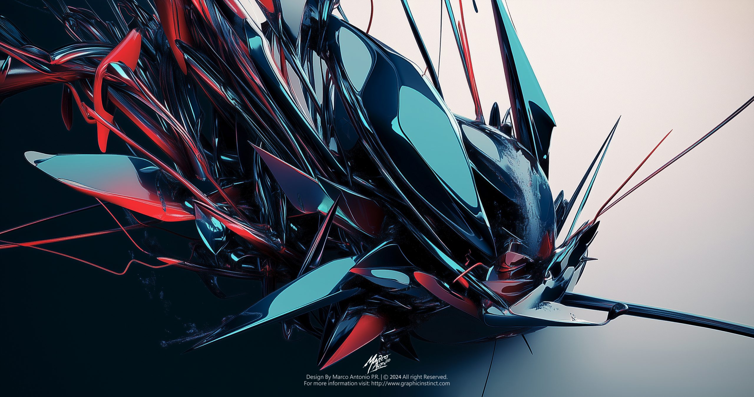 The soft, metallic textures of the main elements resonate with the aesthetics of high-tech digital art, while the sharp, fluid forms allude to biology and mechanization, evoking the explorations of artists such as Naum Gabo and Vladimir Tatlin in using abstract forms to represent complex concepts. The works not only explore formal beauty, but also invite the viewer to consider the tensions between the static and the dynamic, the natural and the synthetic.