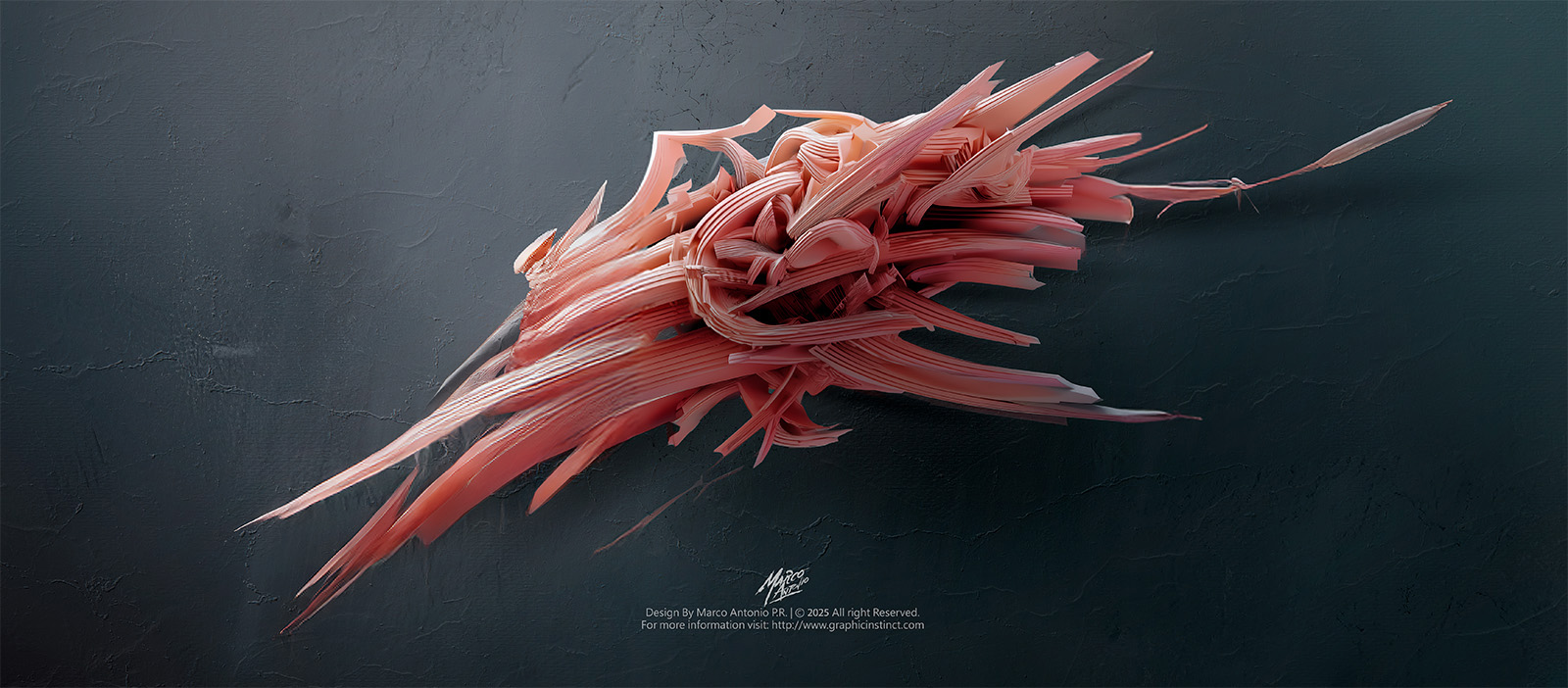 Artistically, the work aligns strongly with biomorphic abstraction, a movement seen in the sculptures of artists like Henry Moore and Jean Arp, who explored organic, non-representational shapes often evoking natural processes. The intricate, almost grotesque detail also brings to mind the uncanny and unsettling organic forms found in Surrealist art, particularly in the works of Yves Tanguy or even the fragmented anatomies of Hans Bellmer. Furthermore, the algorithmic precision and controlled complexity inherent in its digital creation link it to contemporary practices in generative art and computational design, where complex aesthetics are born from code and advanced rendering pipelines. The overall effect is one of meticulously crafted synthetic realism, pushing the boundaries of what is perceived as “natural” in a purely digital domain.