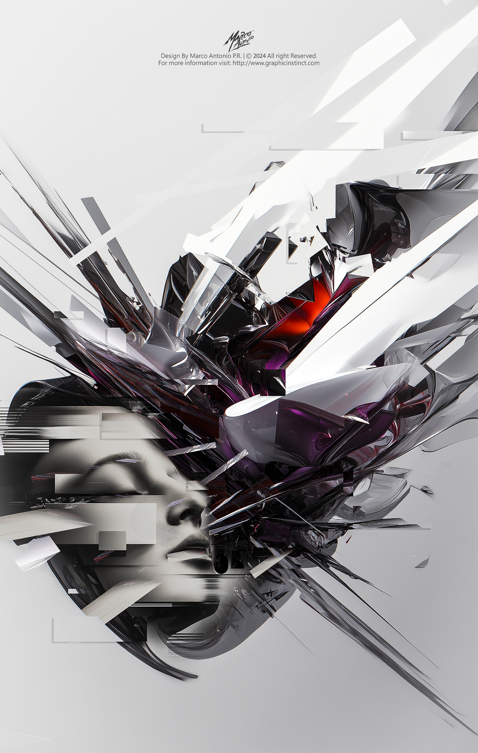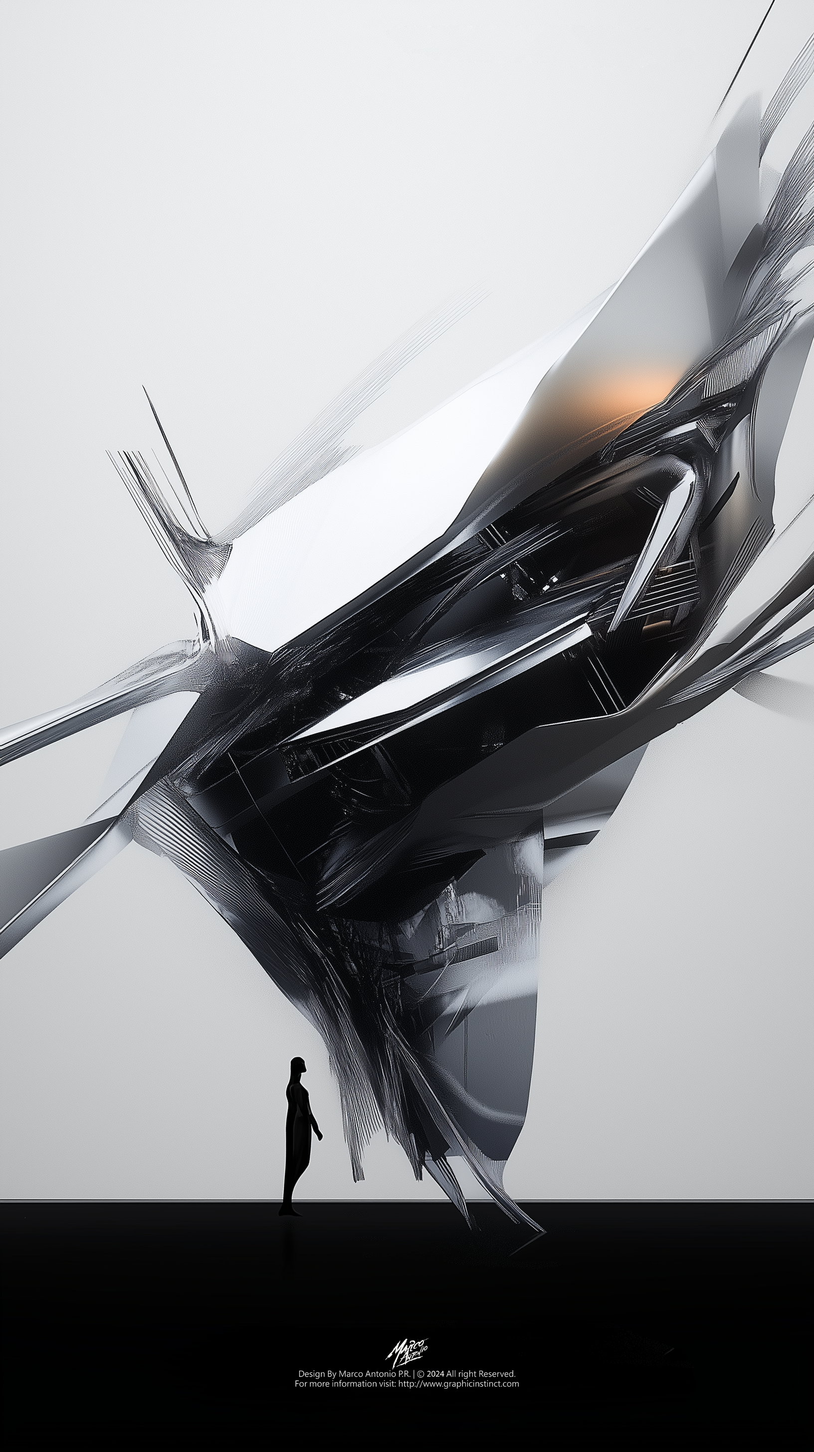 Technical analysis: The series, deeply influenced by constructivism and futurism, presents a visual language that harks back to the work of Zaha Hadid, especially in the use of organic geometries and spatial fluidity. The sharp, fragmented lines recall the work of contemporary digital artists, such as Refik Anadol, who play with the deconstruction of reality and its reconstruction through algorithms. Through the use of layers, transparencies and superimpositions, there is a clear reference to postmodern aesthetics, where the boundaries between art and technology are blurred. The use of a limited colour palette, with a predominance of whites, blacks and metallic tones, suggests an industrial purity that contrasts with flashes of red or green, evoking tension and dynamism.