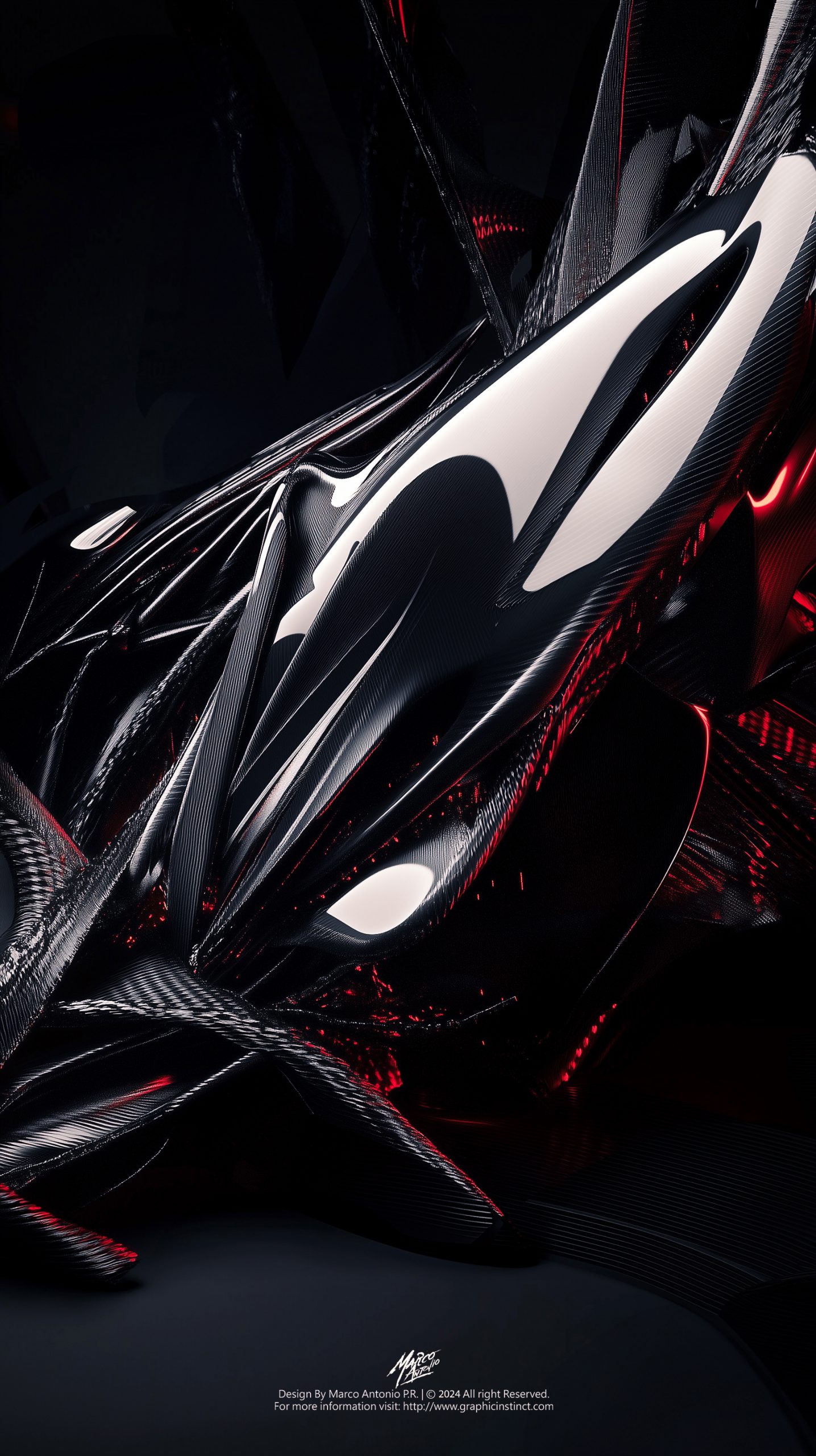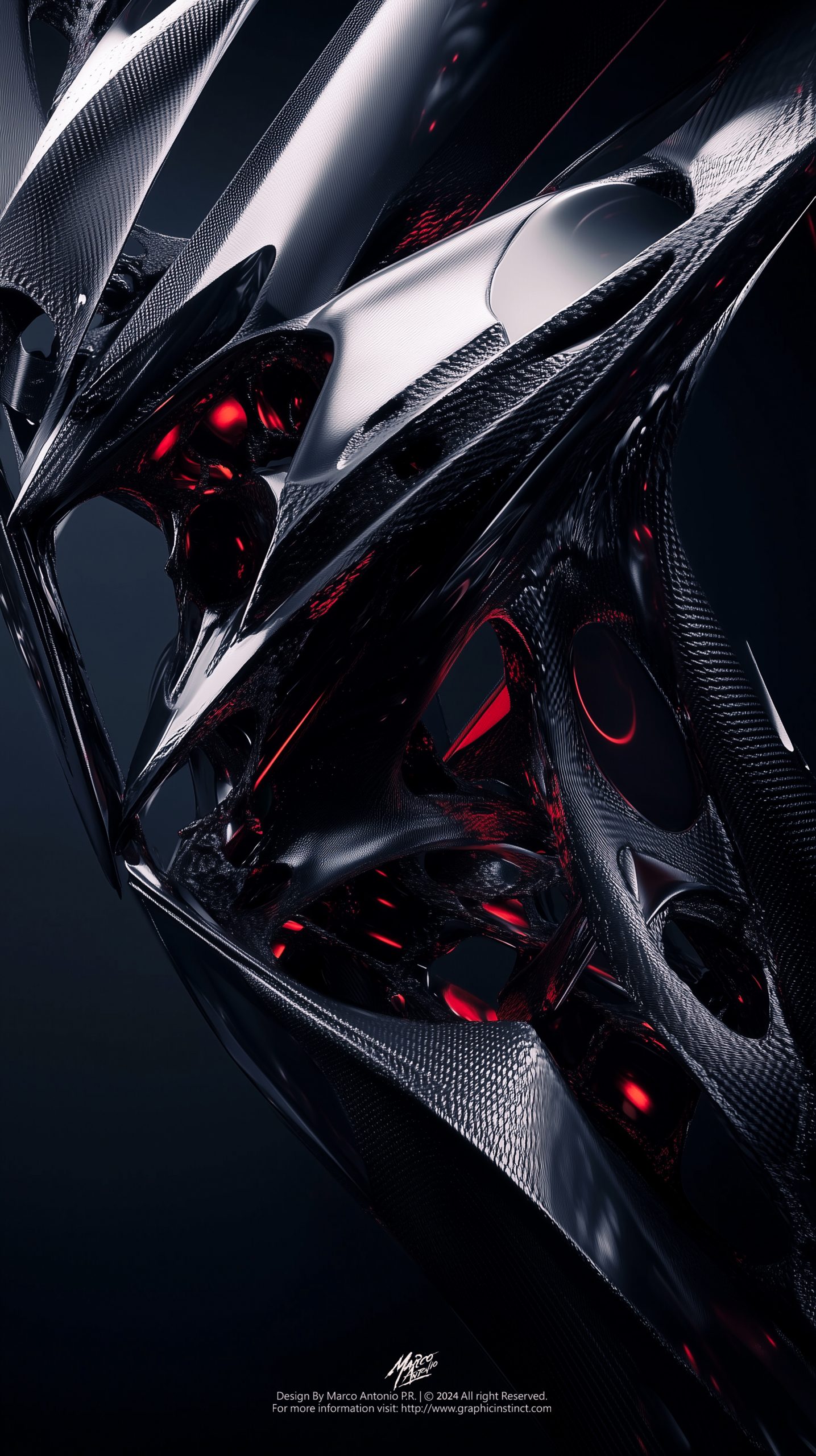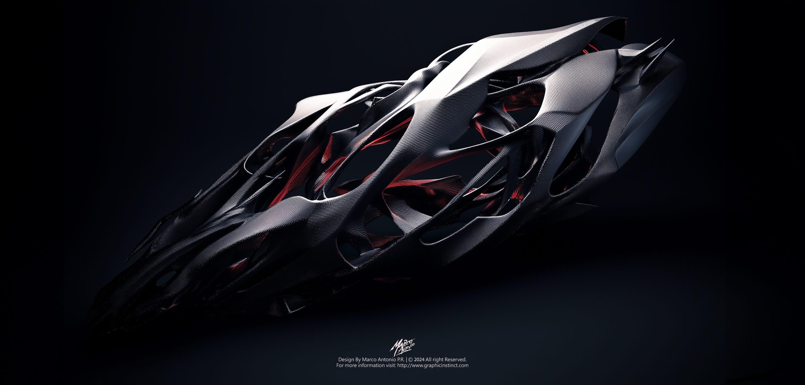 In terms of technique, there is a masterful use of 3D modeling and digital rendering, with a focus on textural detail that simulates materials such as carbon fiber and polished metal. Reflections and shadows are handled with precision, creating a play of light that gives the piece a sense of depth and three-dimensionality.