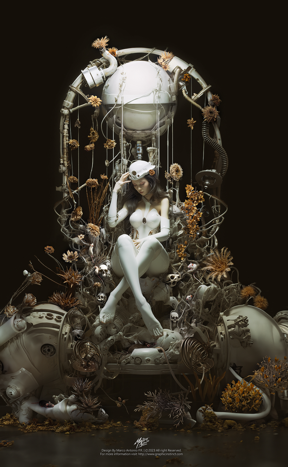 Description: Digital illustration, composition modeled and depth map generated in Blender. With the help of Stable diffusion, the depth map generated is used as a base to render different parts in a guided way. These chunks are composited in Photoshop.