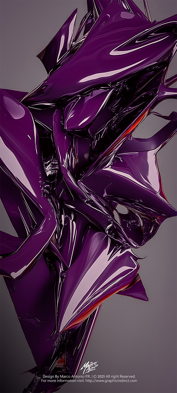 This digital artwork, created by Marco Antonio P.R., is a hyper-realistic rendering executed in a three-dimensional digital space. It leverages ray tracing techniques to achieve a mirror-like reflectivity, emphasizing the sharpness of form and depth of hue. The dominant color, a deep iridescent violet, enhances the tension between soft curvature and geometric aggression.