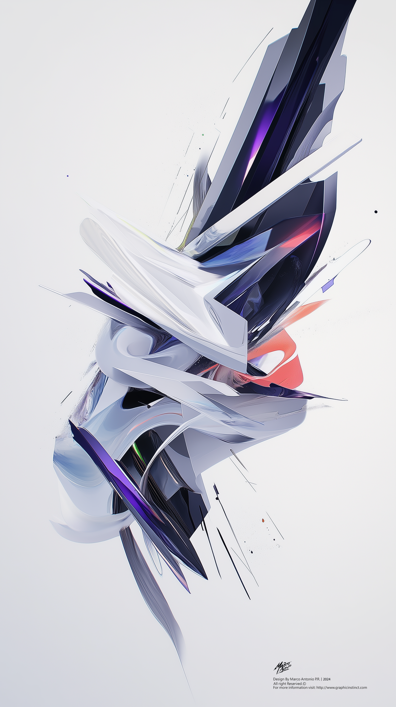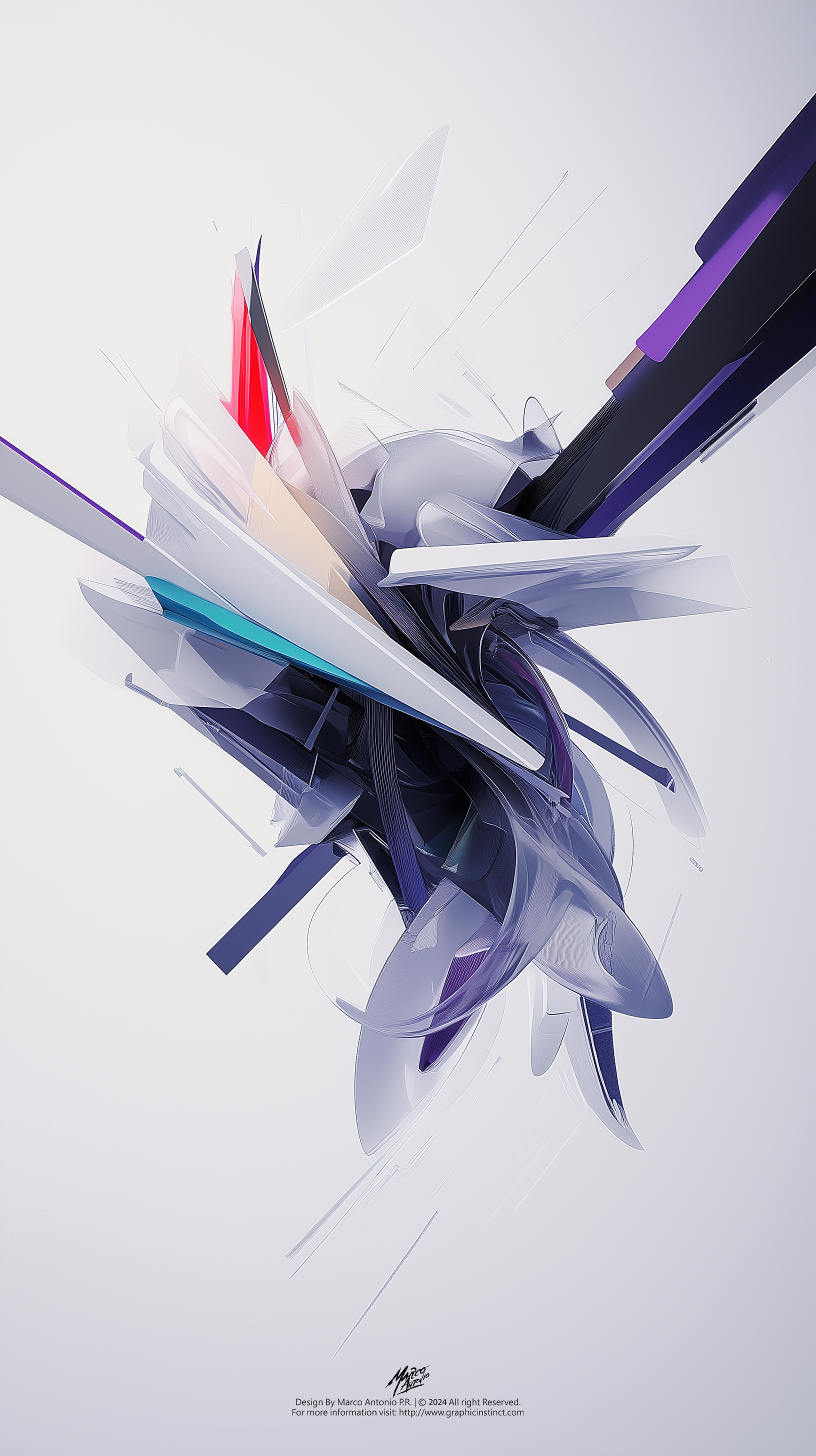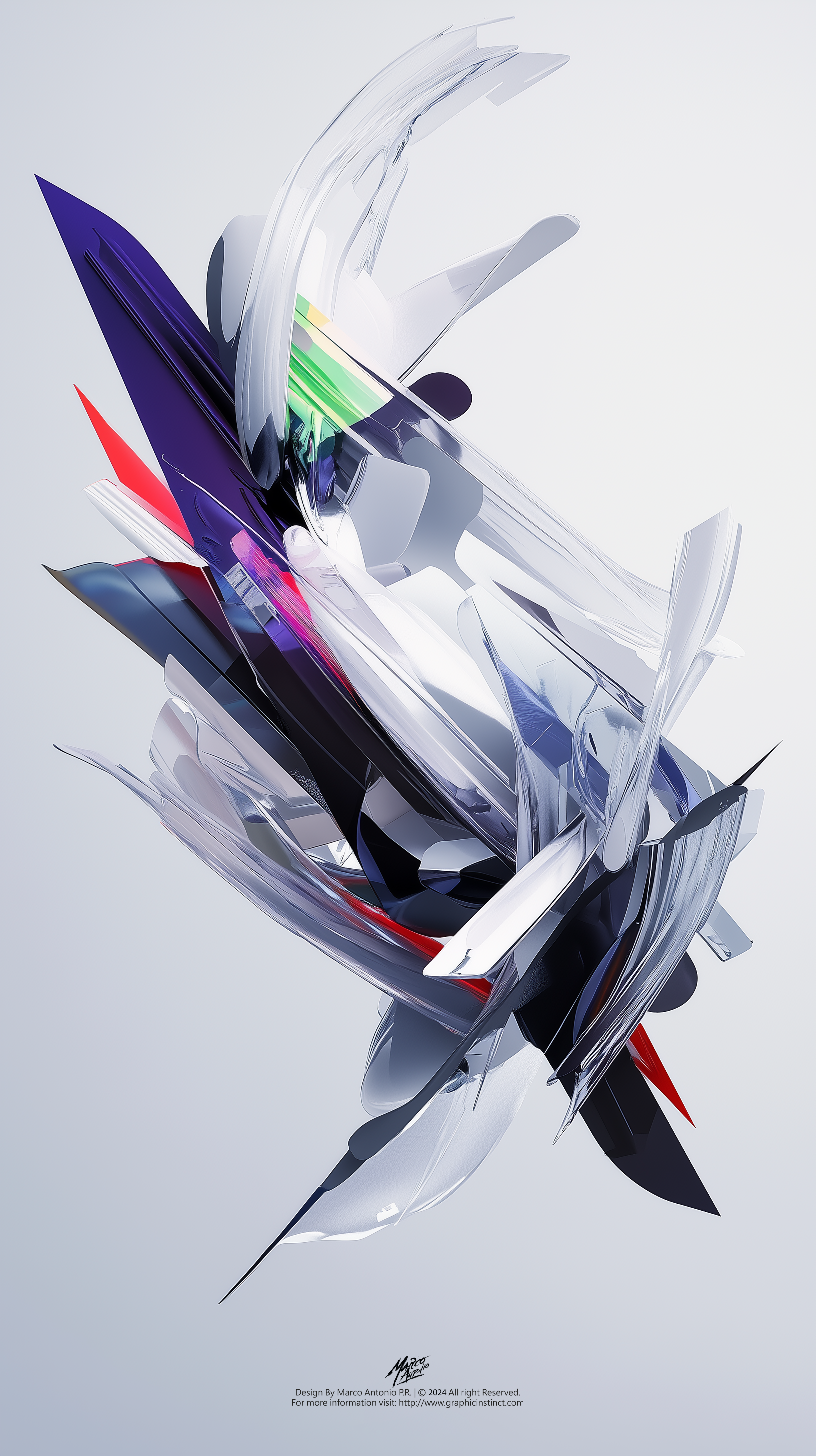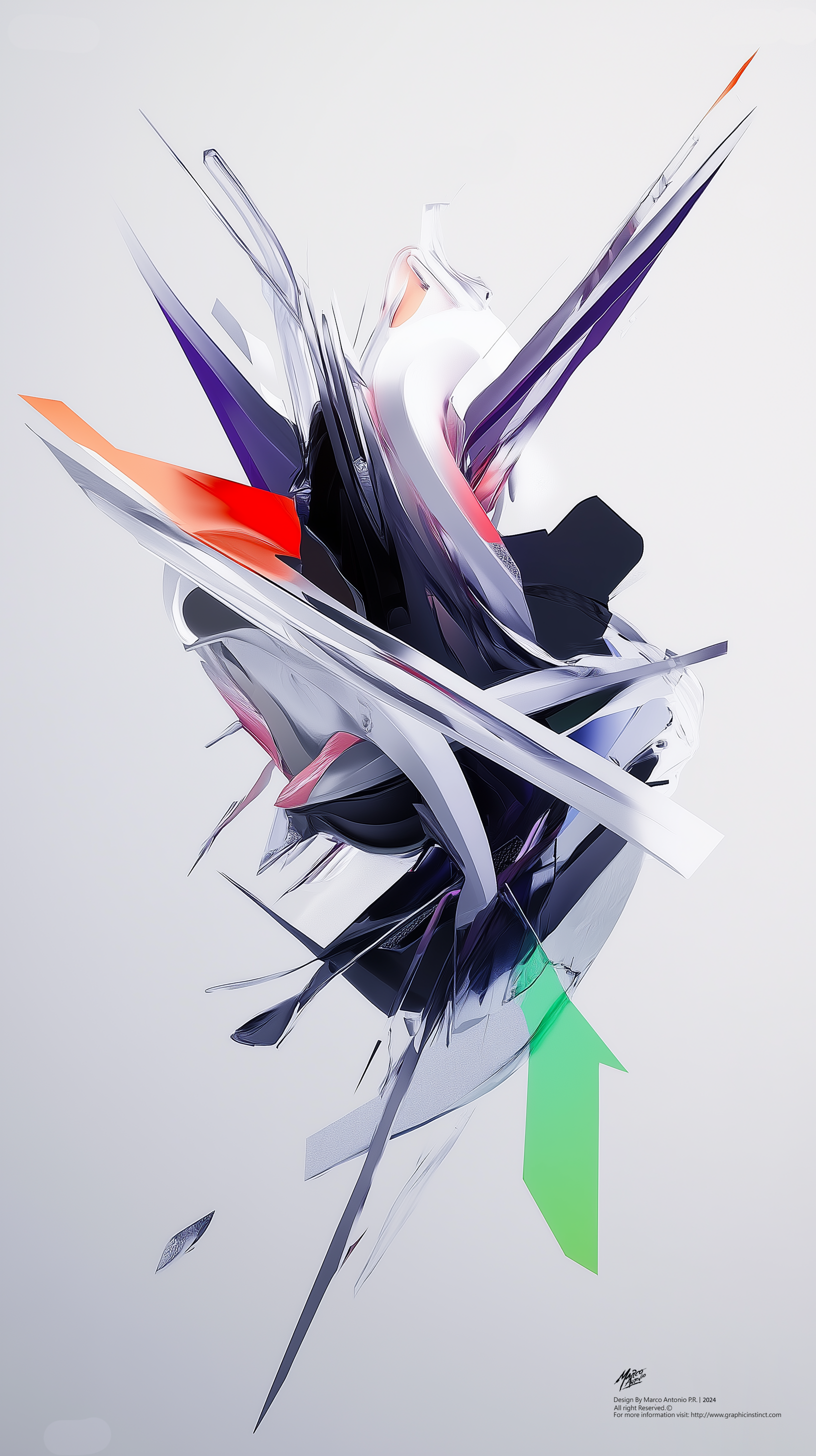 Technical analysis: The composition alludes to the influences of Russian Constructivism, especially in the use of aggressive lines and primary colours, which are here reinterpreted in metallic and luminous tones. Red, orange and green offer a counterpoint to the neutral background palette, which recalls the works of Kazimir Malevich. At the same time, the fractal arrangement and deconstruction of the central object evoke the spirit of parametric architecture, another echo of Zaha Hadid’s school. The integration of forms that dissolve into the void recalls the abstract sculptures of Umberto Boccioni, a tribute to Futurism, where energy and dynamic movement are crucial. Subtle, almost digital shadows and reflections reinforce the contemporary sense of the virtual, also bringing echoes of post-digital aesthetics in visual art.