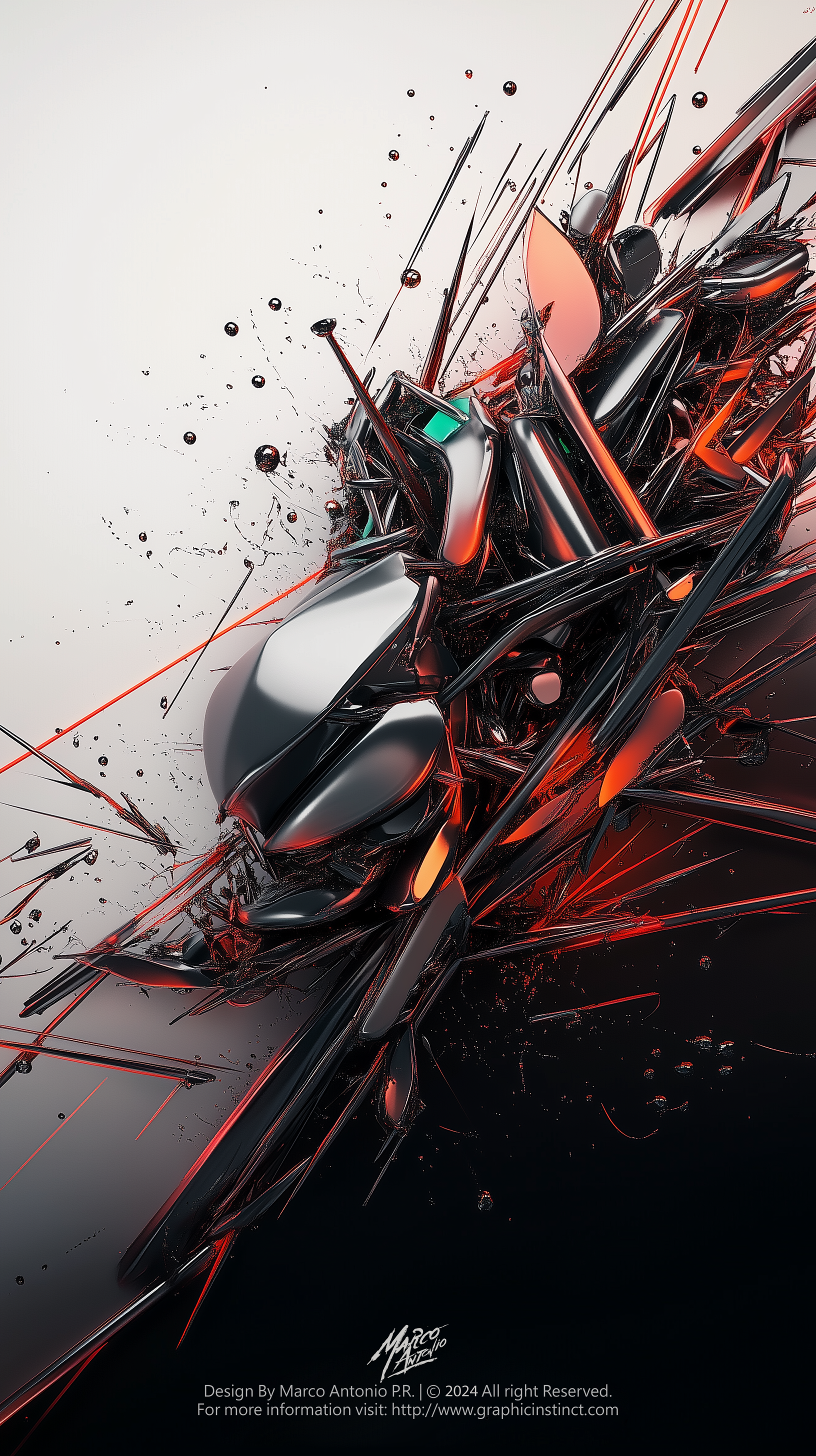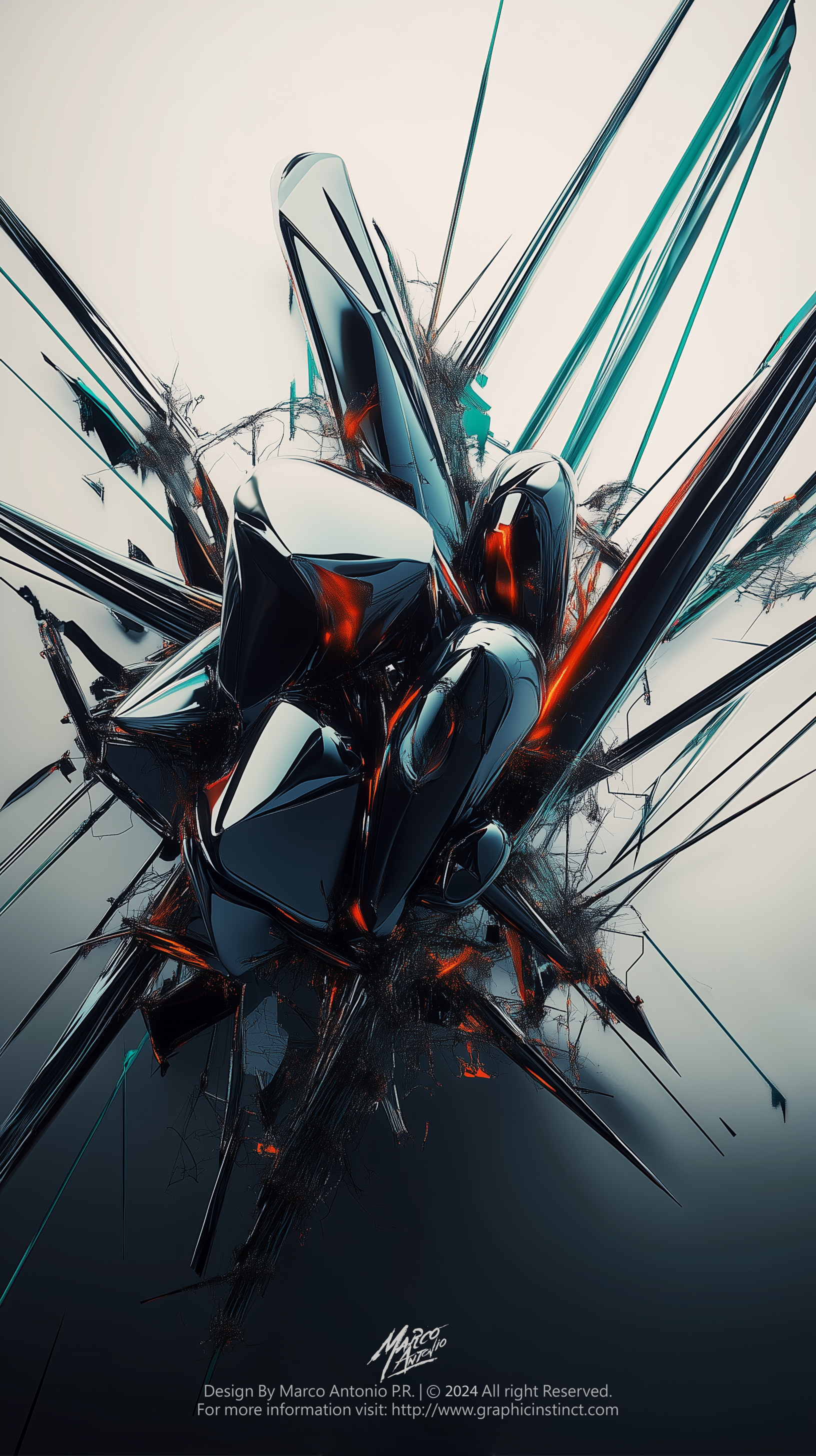 The use of color is meticulous: cold, metallic tones predominate, suggesting modernity and technology, while warm flashes introduce emotional tension, contrasting with mechanical coldness. The texture and reflection of the material recall the polished surfaces of minimalist art, but here they are interrupted by sharp peaks and edges, introducing an element of risk and danger.