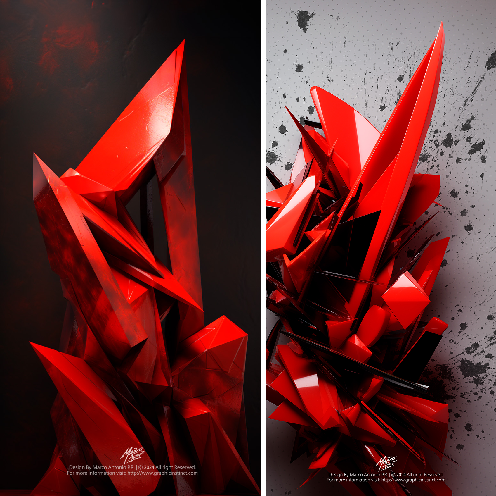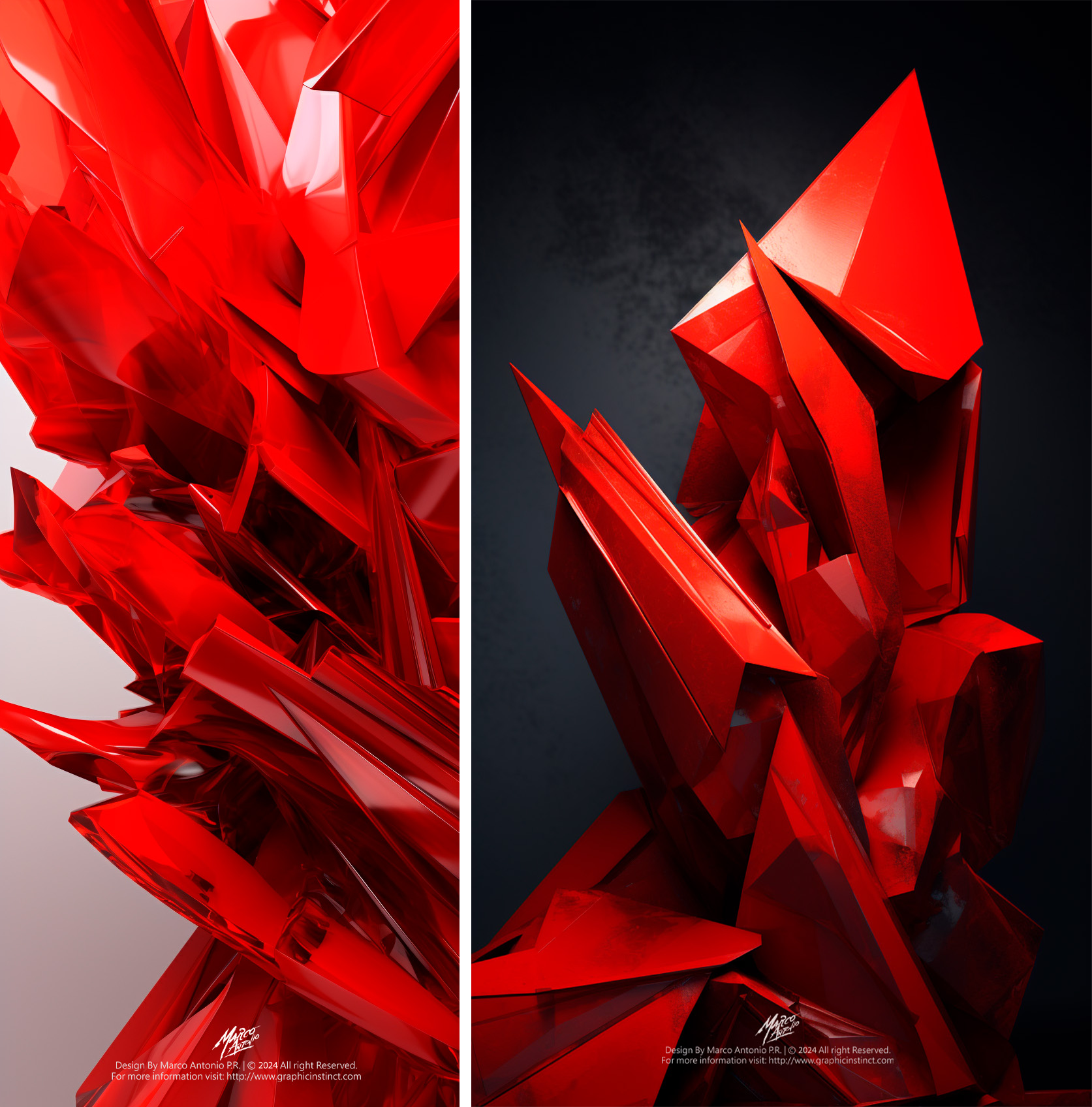 Description & Comments: A series dominated by a deep red color, this series consists of a set of faceted structures that are assembled into a complex, angular composition. The design is highly abstract, evoking images of crystals, fragments, or mineral formations, with smooth, reflective surfaces that capture the light in a dramatic way.
