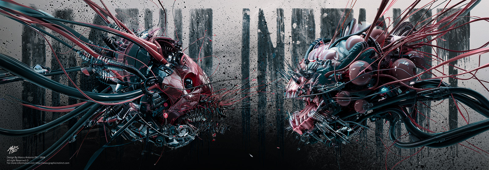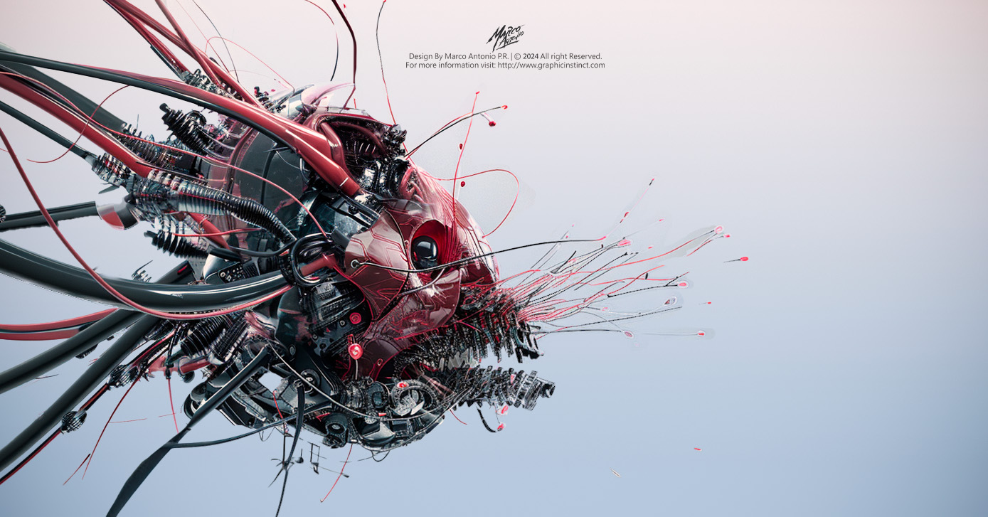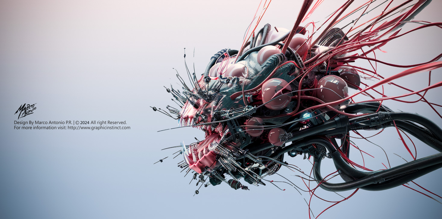 Description: The artist demonstrates a masterful command of digital 3D modeling, employing techniques that highlight both texture and depth. The reflective surfaces and complex layering suggest influences from cyberpunk aesthetics, particularly the works of H.R. Giger, known for his biomechanical designs in Alien. Additionally, the chaotic arrangement of wires and mechanical parts draws parallels to the futurist movement, particularly the works of Umberto Boccioni, with their emphasis on energy, movement, and technology.