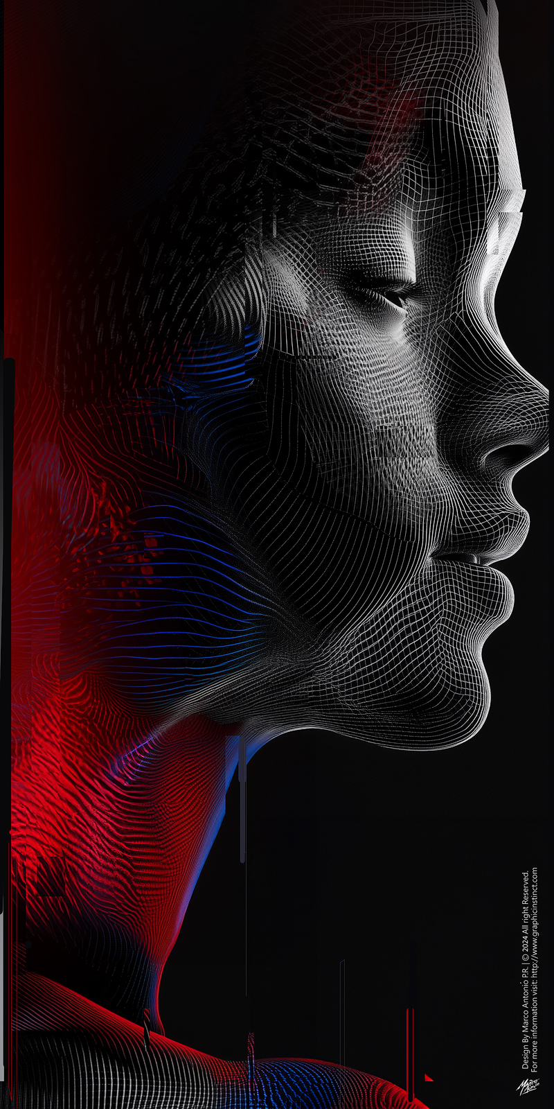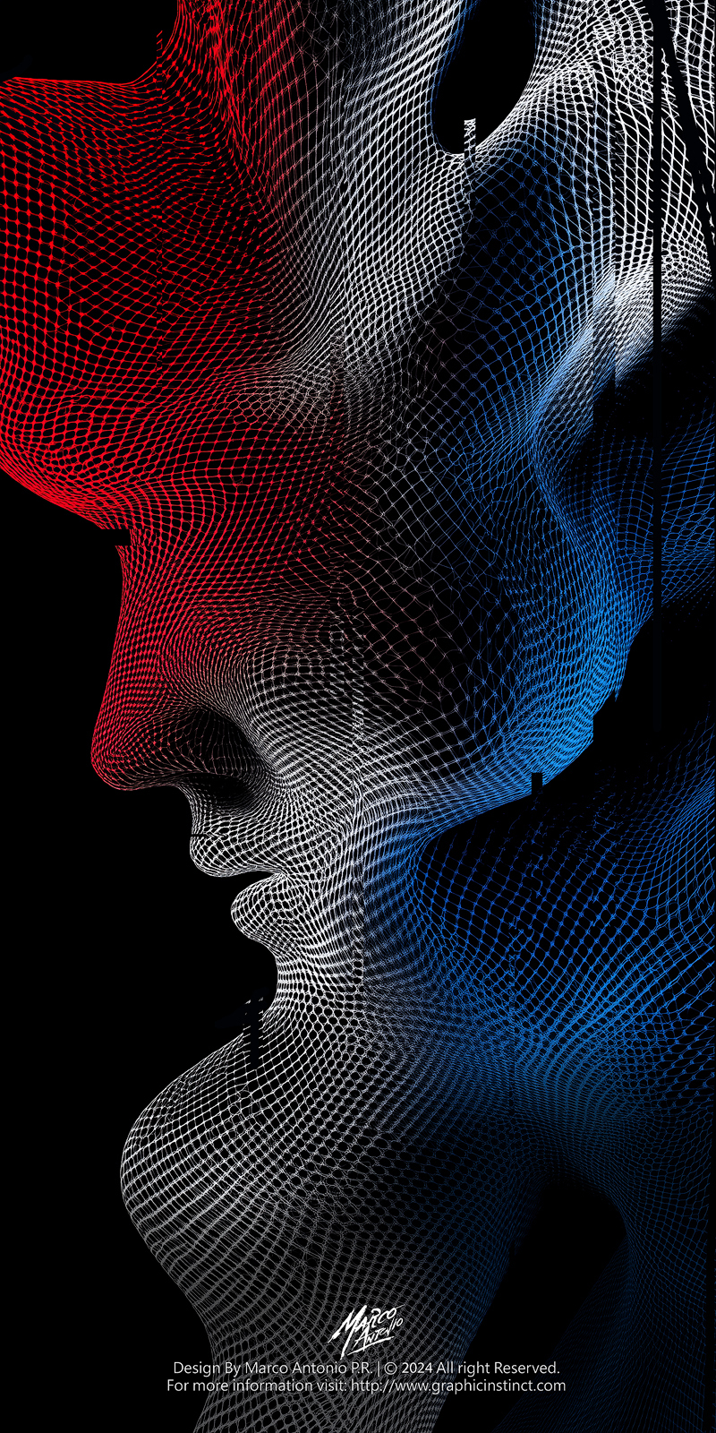 Technical analysis: This digital artwork uses a network of intersecting lines that evoke a futuristic and minimalist aesthetic, in the tradition of avant-garde movements such as Russian Constructivism and Kazimir Malevich’s Suprematism, where geometry and abstraction dominate the visual space. The lines evoke the contours of a human head, in an indirect homage to the exploration of the human body in the Cubism of Pablo Picasso and Georges Braque, where geometric shapes reconstruct the human figure in a disjointed but coherent way. In addition, the use of red, white and blue colors refers to propaganda posters from the early twentieth century, contrasting the concept of identity with references to nationalism and block politics.