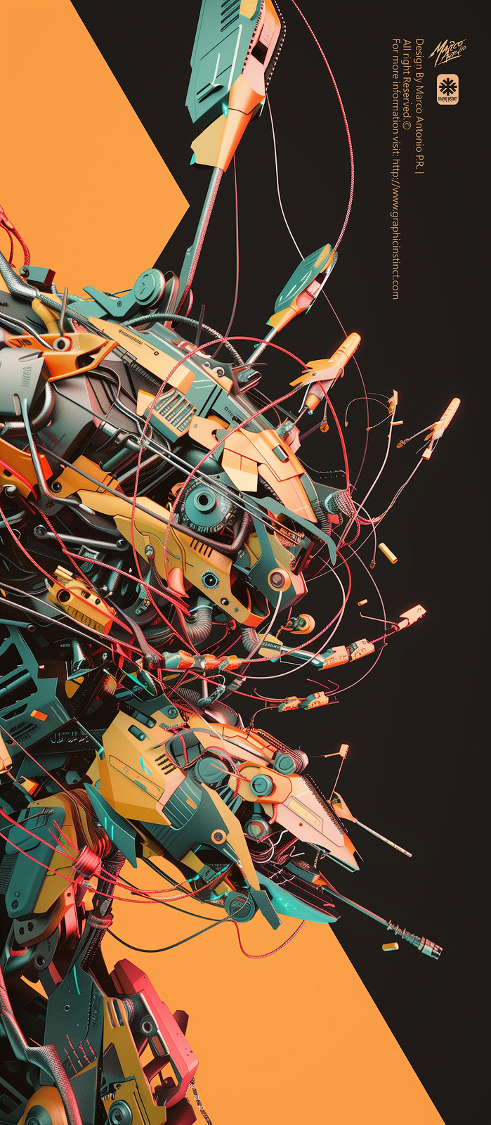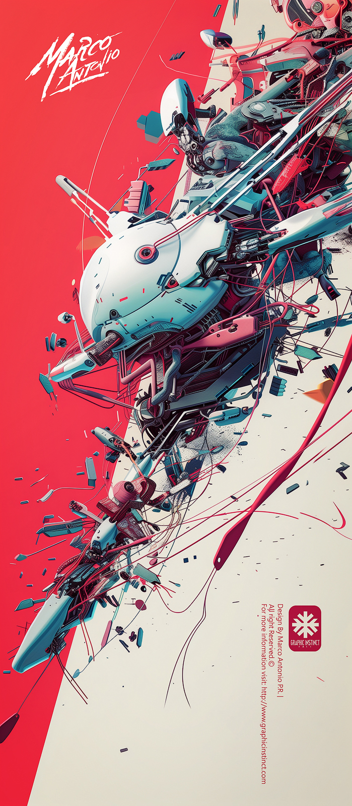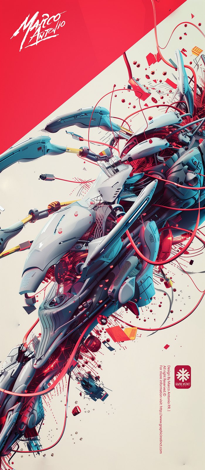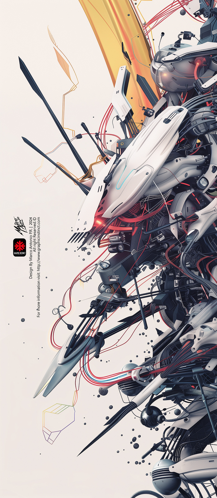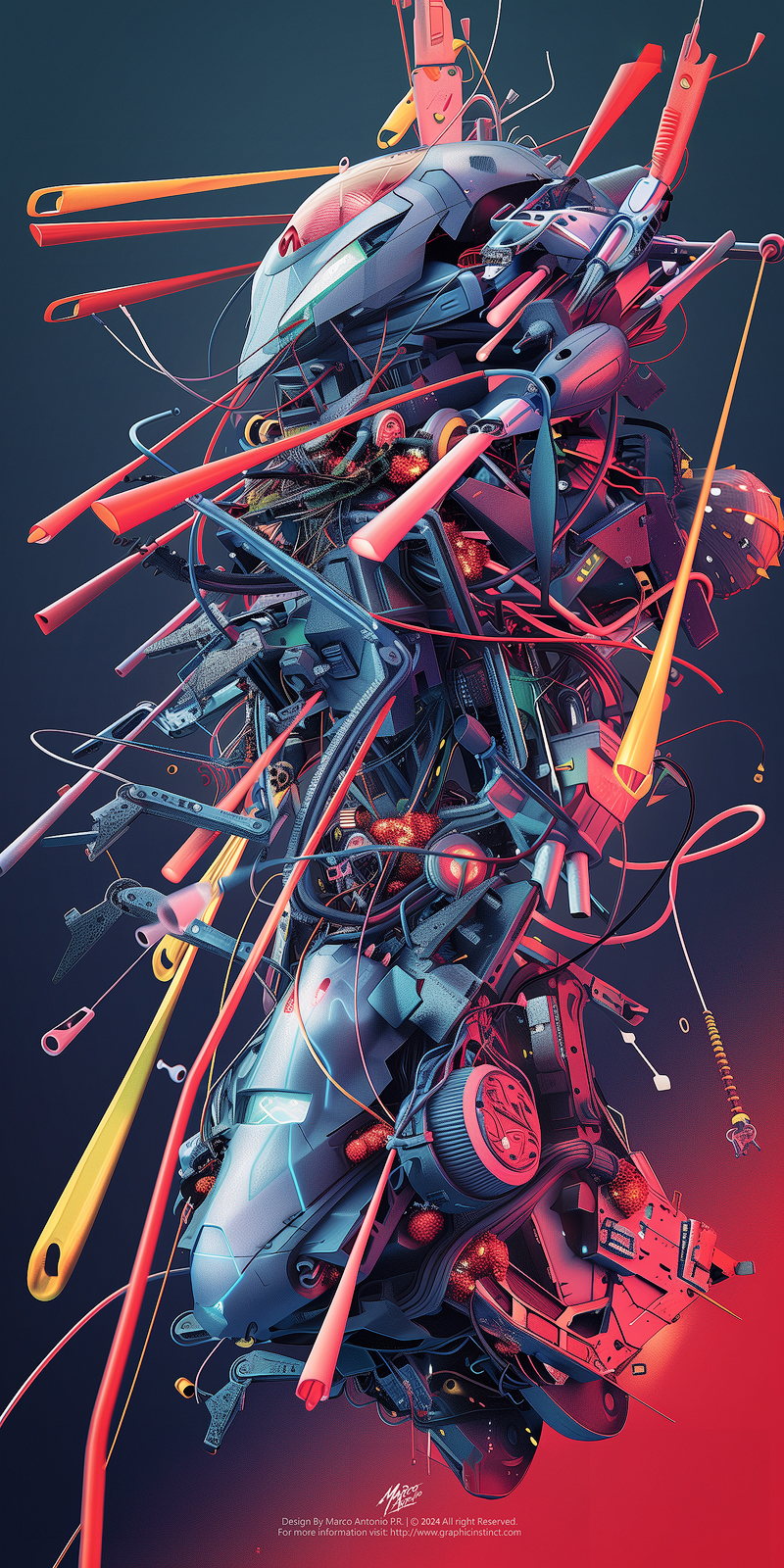 - Composition: The chaotic but harmonious arrangement of the forms is reminiscent of the futurist sculptures of Umberto Boccioni, while the fragmentation and dynamism echo the Russian Constructivist movement. The lines and cables that snake through the images are reminiscent of the mechanical structures of Giacomo Balla, with a clear influence of contemporary Cyberpunk.