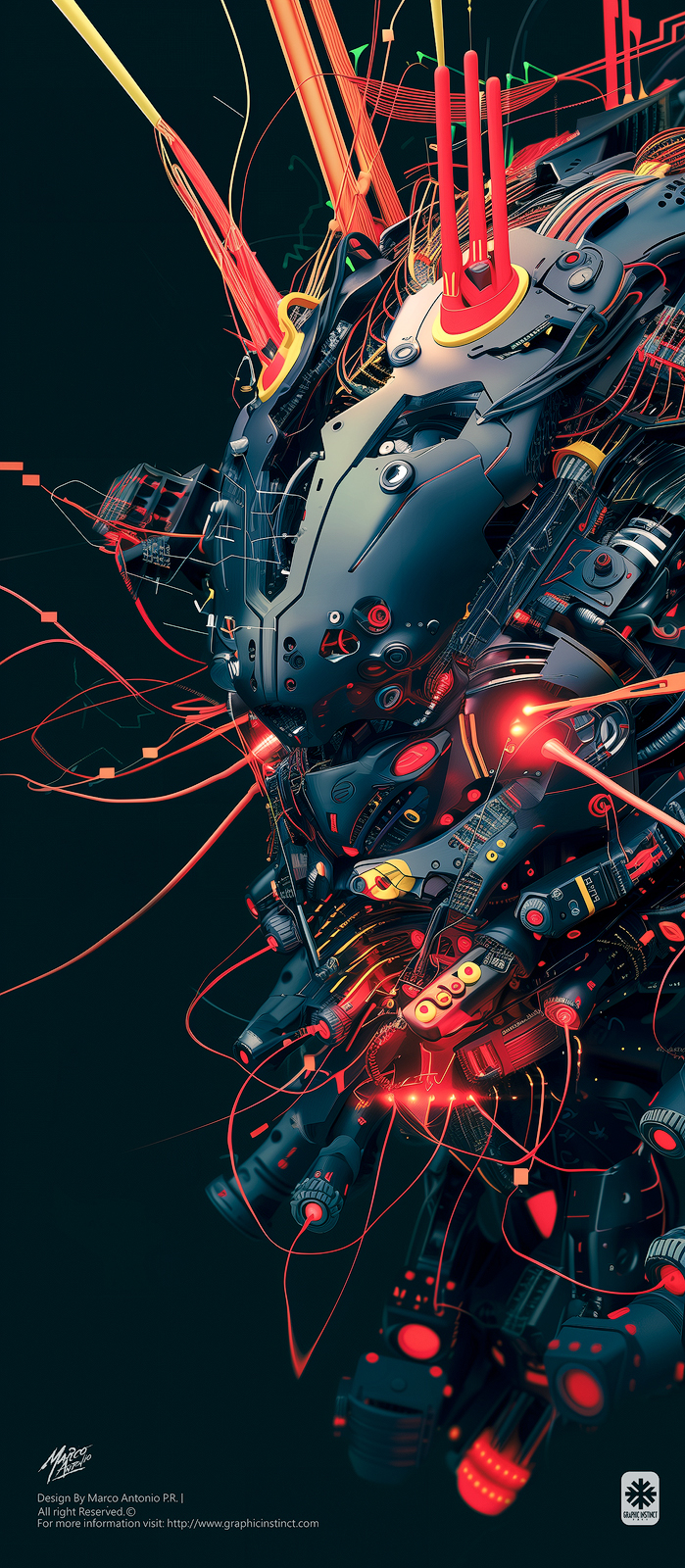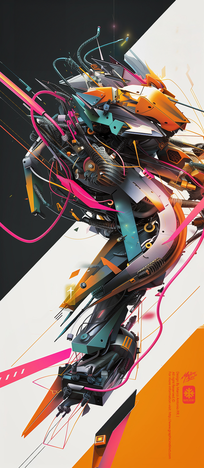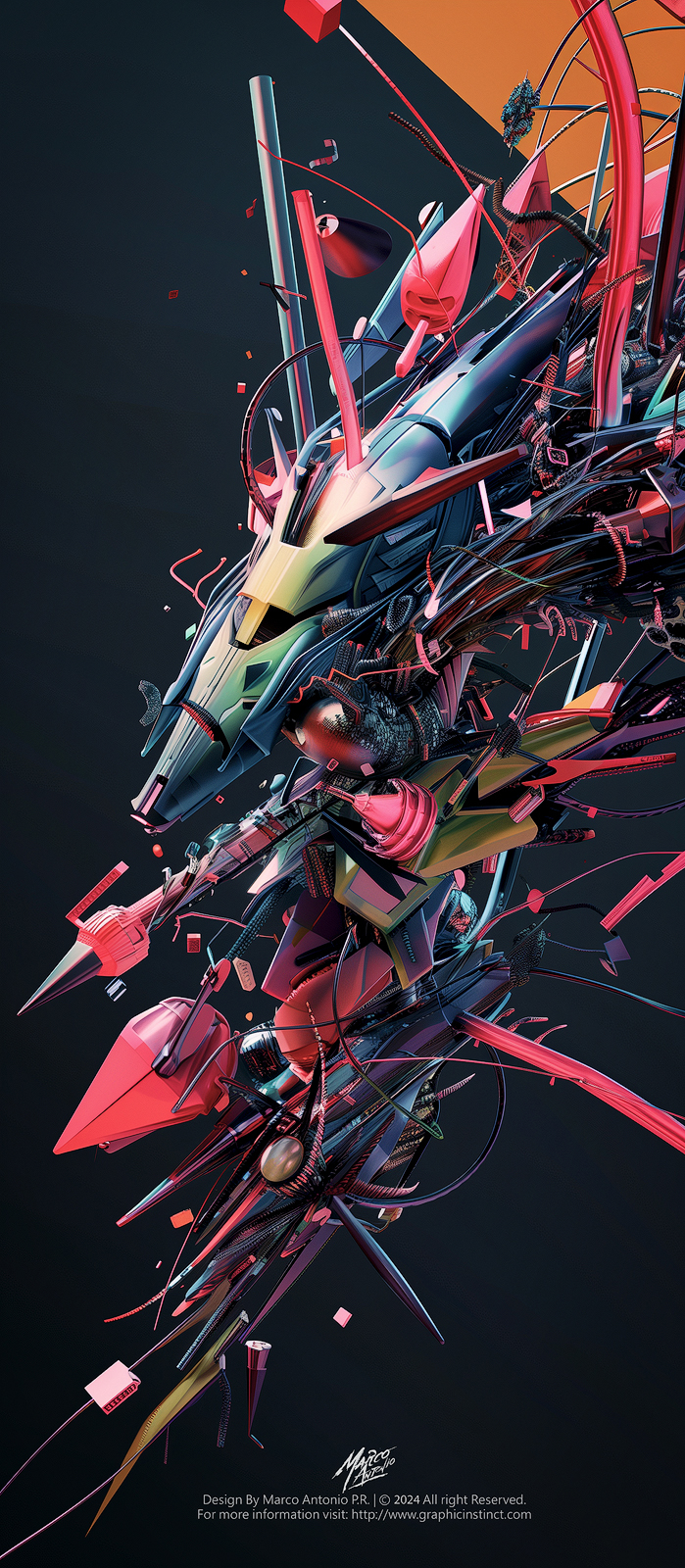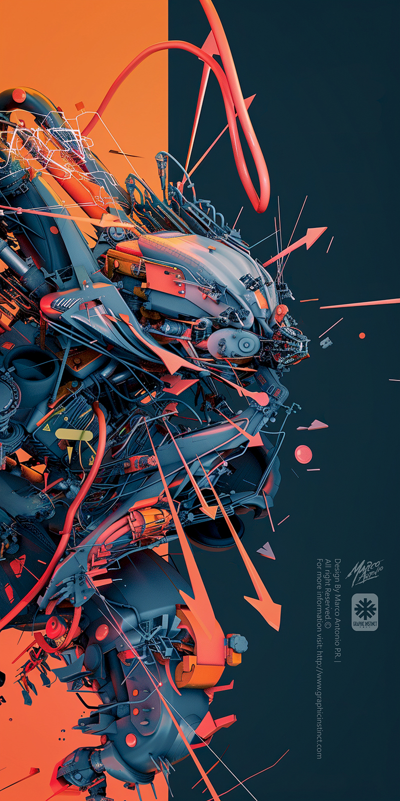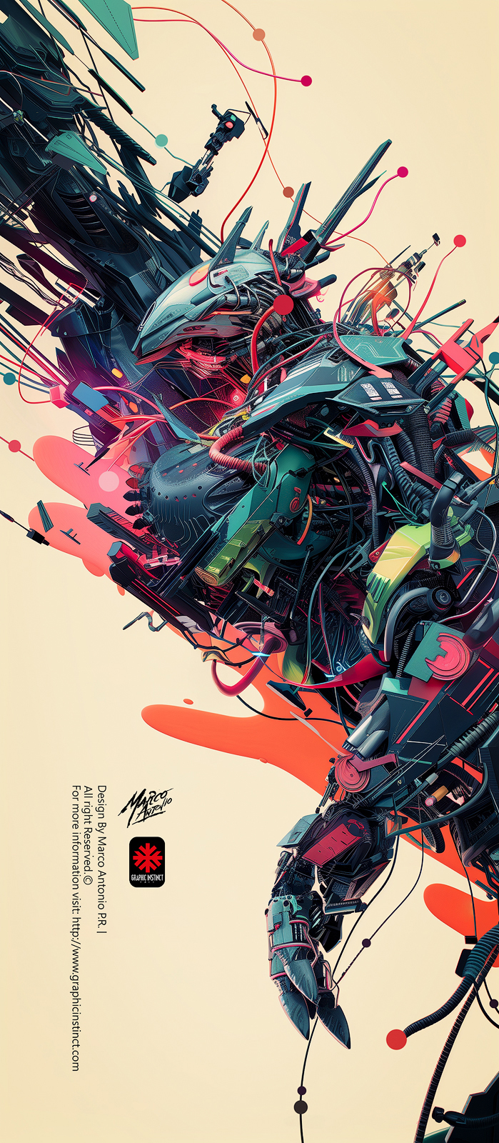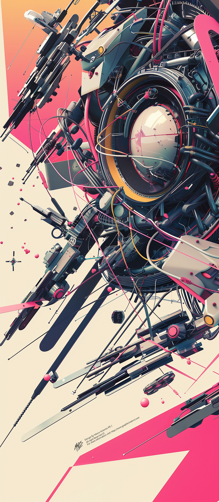 - Composition: The chaotic but harmonious arrangement of the forms is reminiscent of the futurist sculptures of Umberto Boccioni, while the fragmentation and dynamism echo the Russian Constructivist movement. The lines and cables that snake through the images are reminiscent of the mechanical structures of Giacomo Balla, with a clear influence of contemporary Cyberpunk.
