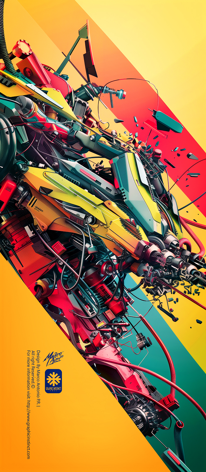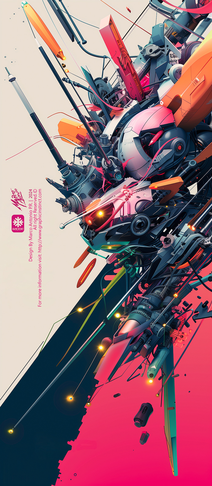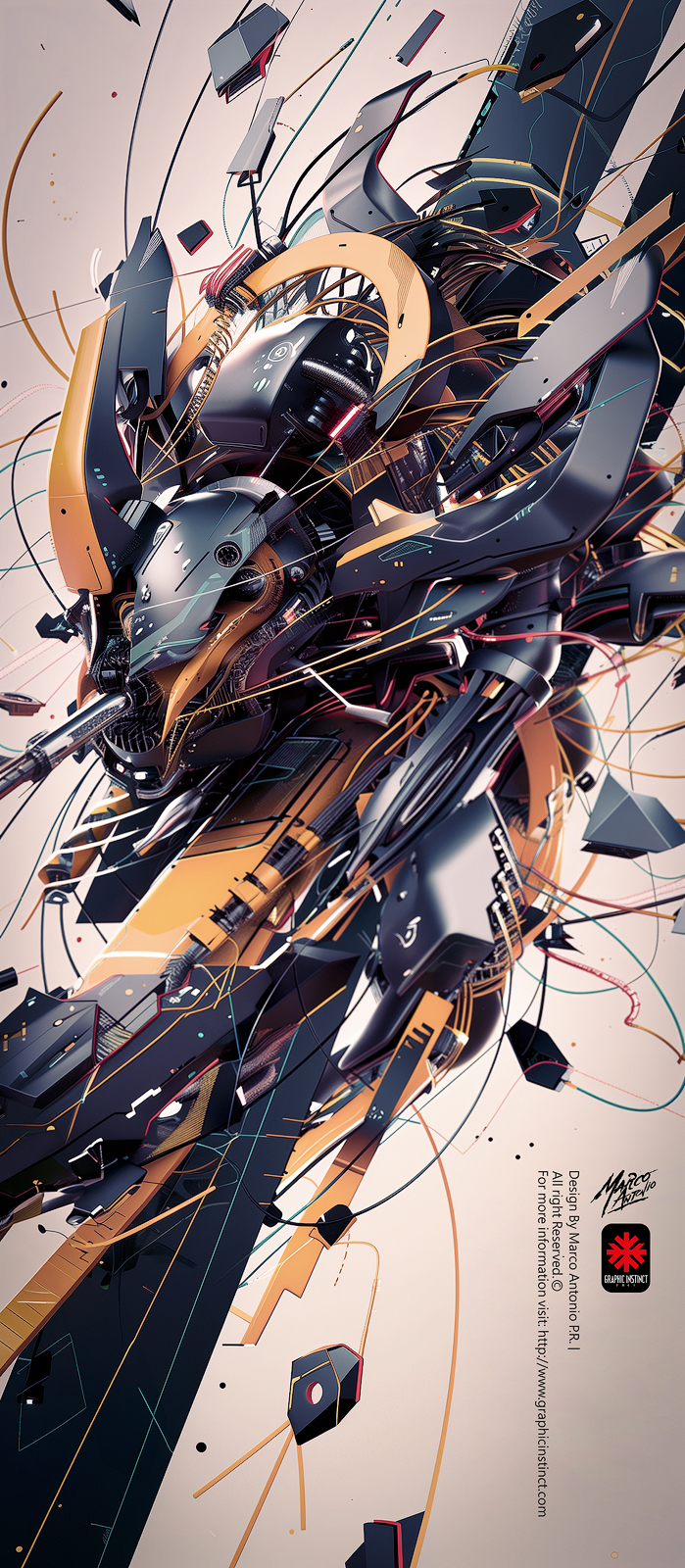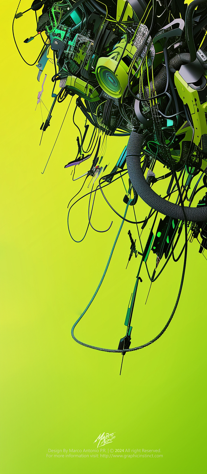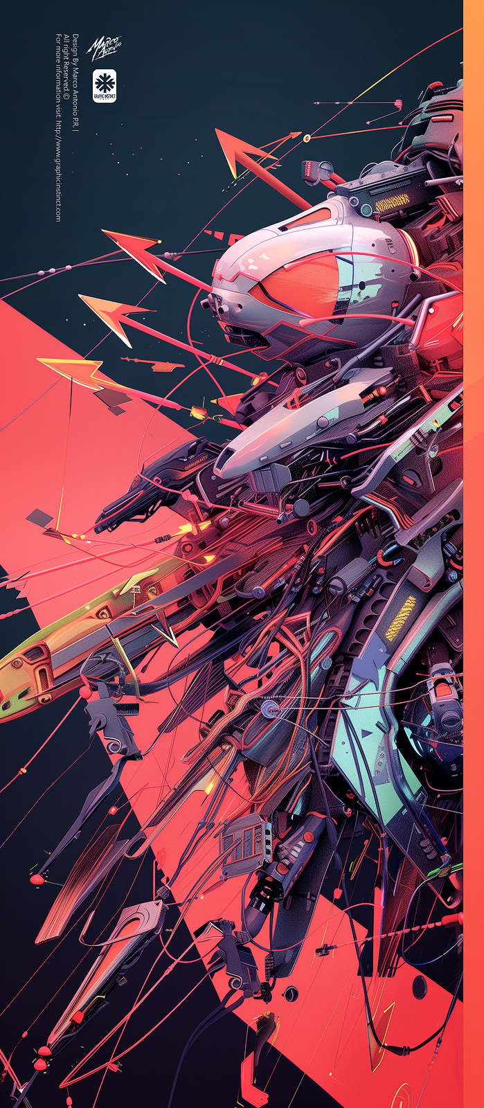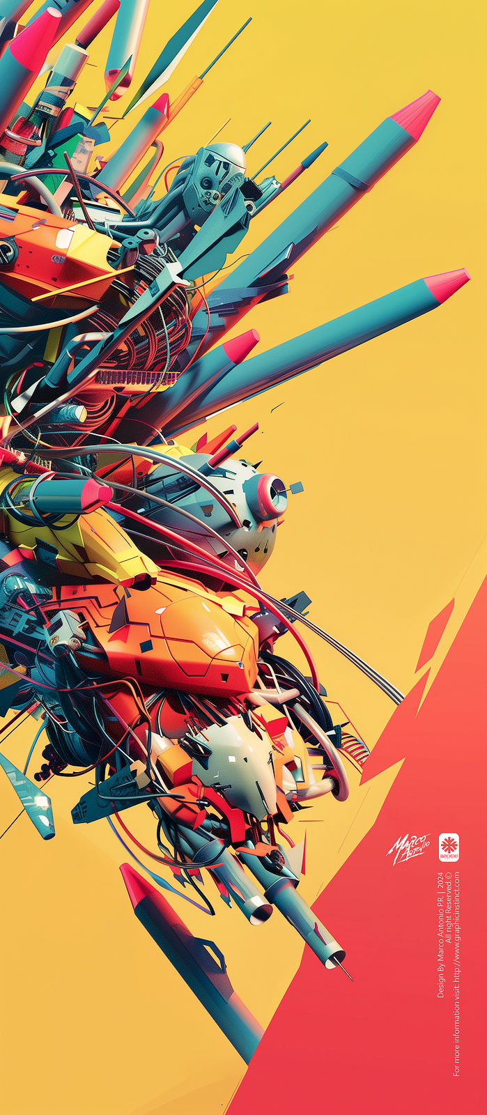 - Composition: The chaotic but harmonious arrangement of the forms is reminiscent of the futurist sculptures of Umberto Boccioni, while the fragmentation and dynamism echo the Russian Constructivist movement. The lines and cables that snake through the images are reminiscent of the mechanical structures of Giacomo Balla, with a clear influence of contemporary Cyberpunk.