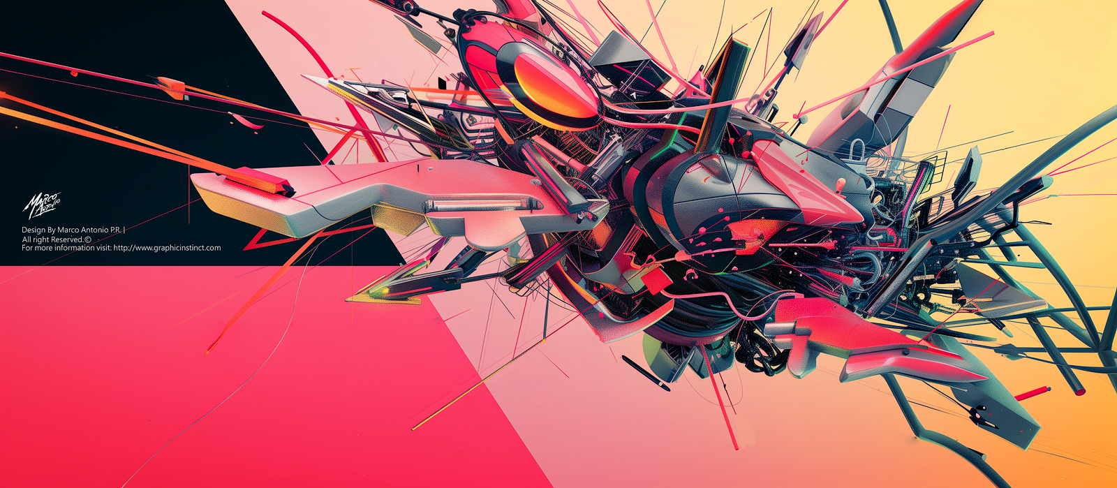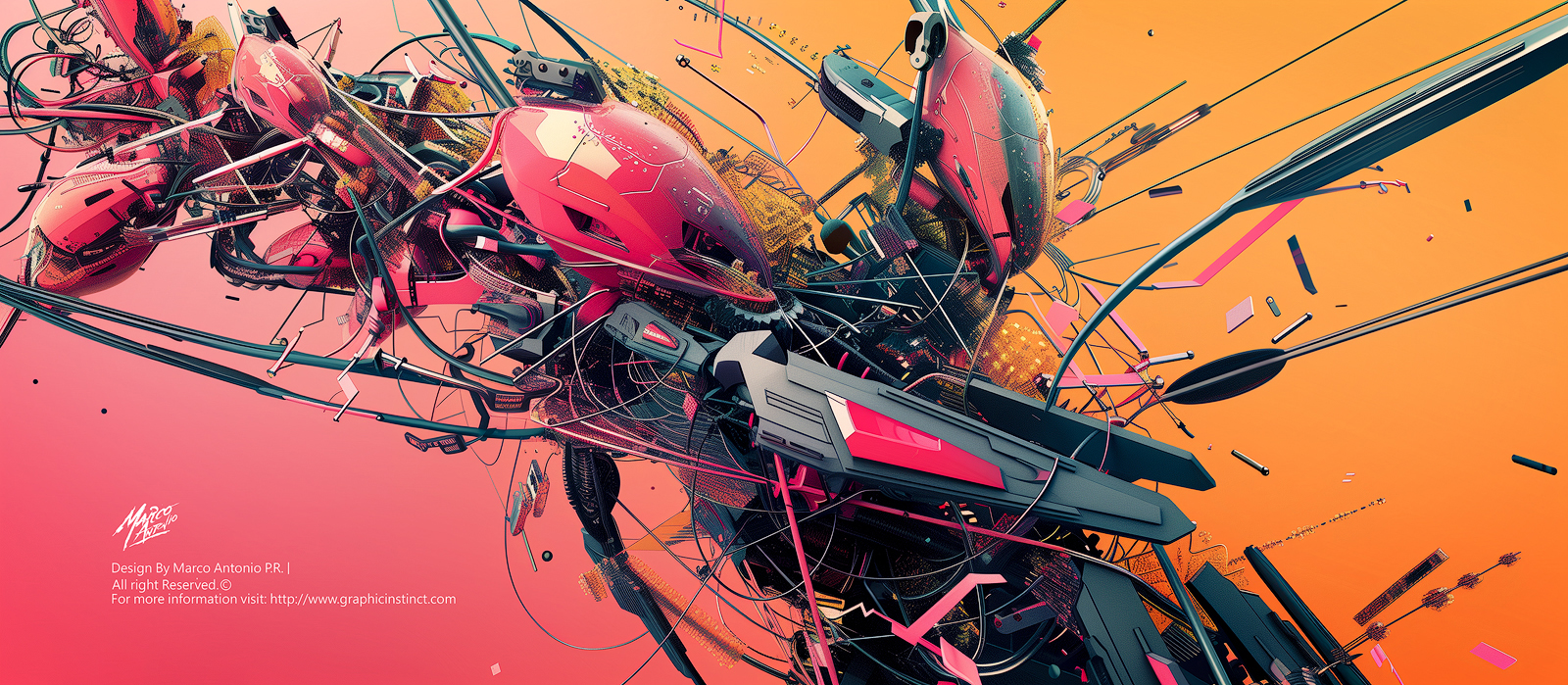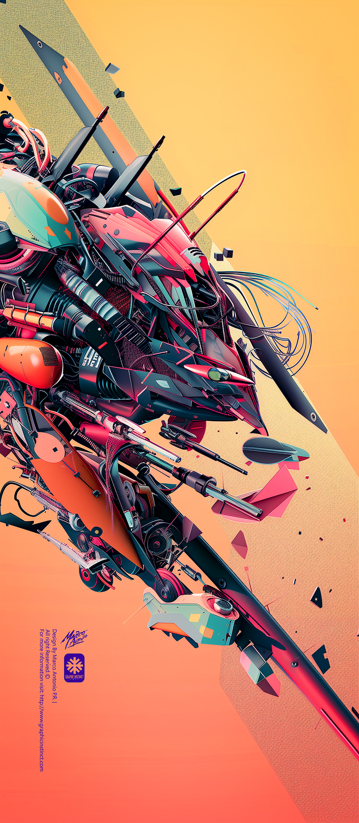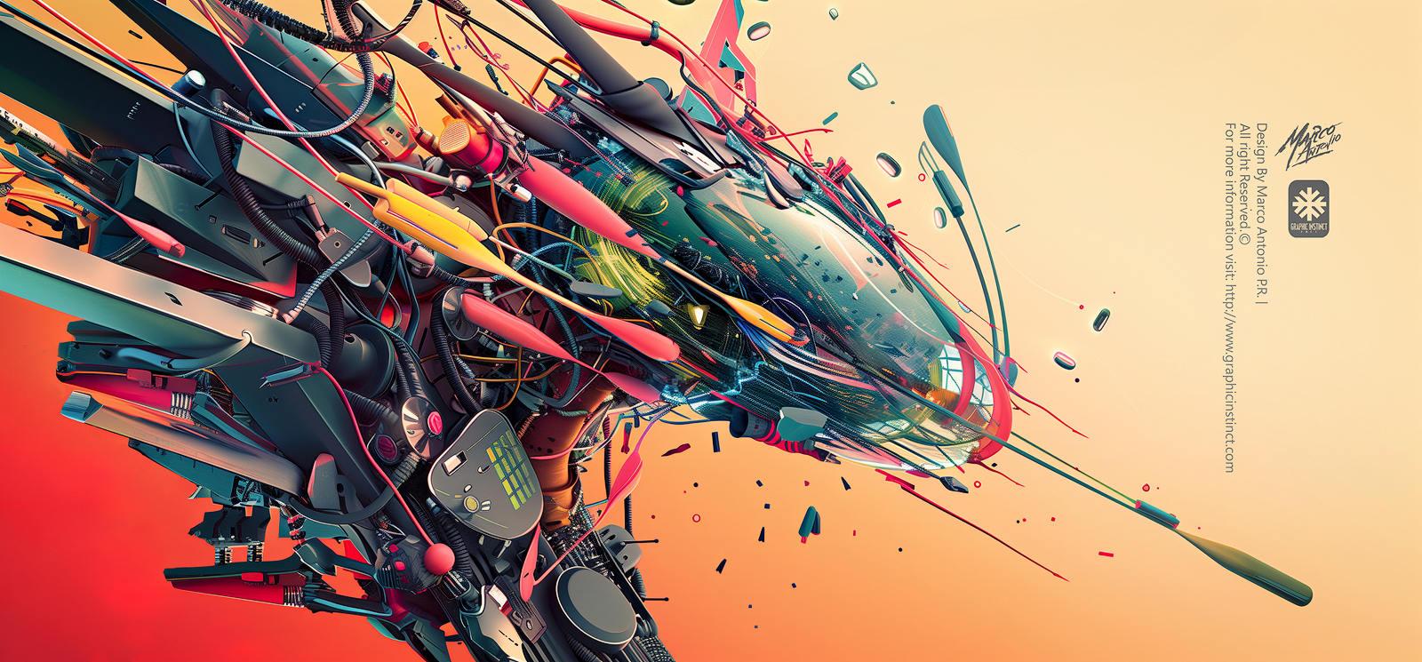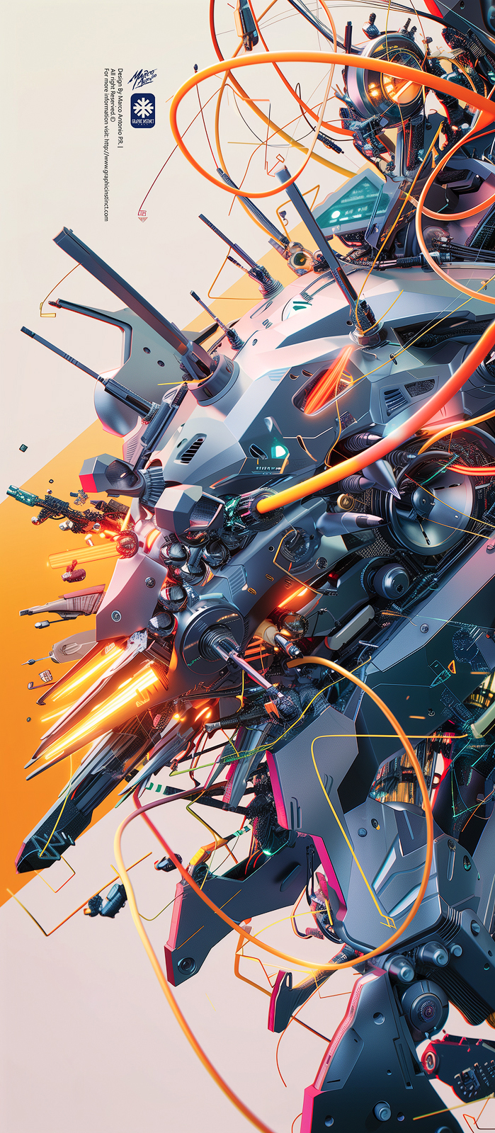 - Composition: The chaotic but harmonious arrangement of the forms is reminiscent of the futurist sculptures of Umberto Boccioni, while the fragmentation and dynamism echo the Russian Constructivist movement. The lines and cables that snake through the images are reminiscent of the mechanical structures of Giacomo Balla, with a clear influence of contemporary Cyberpunk.