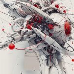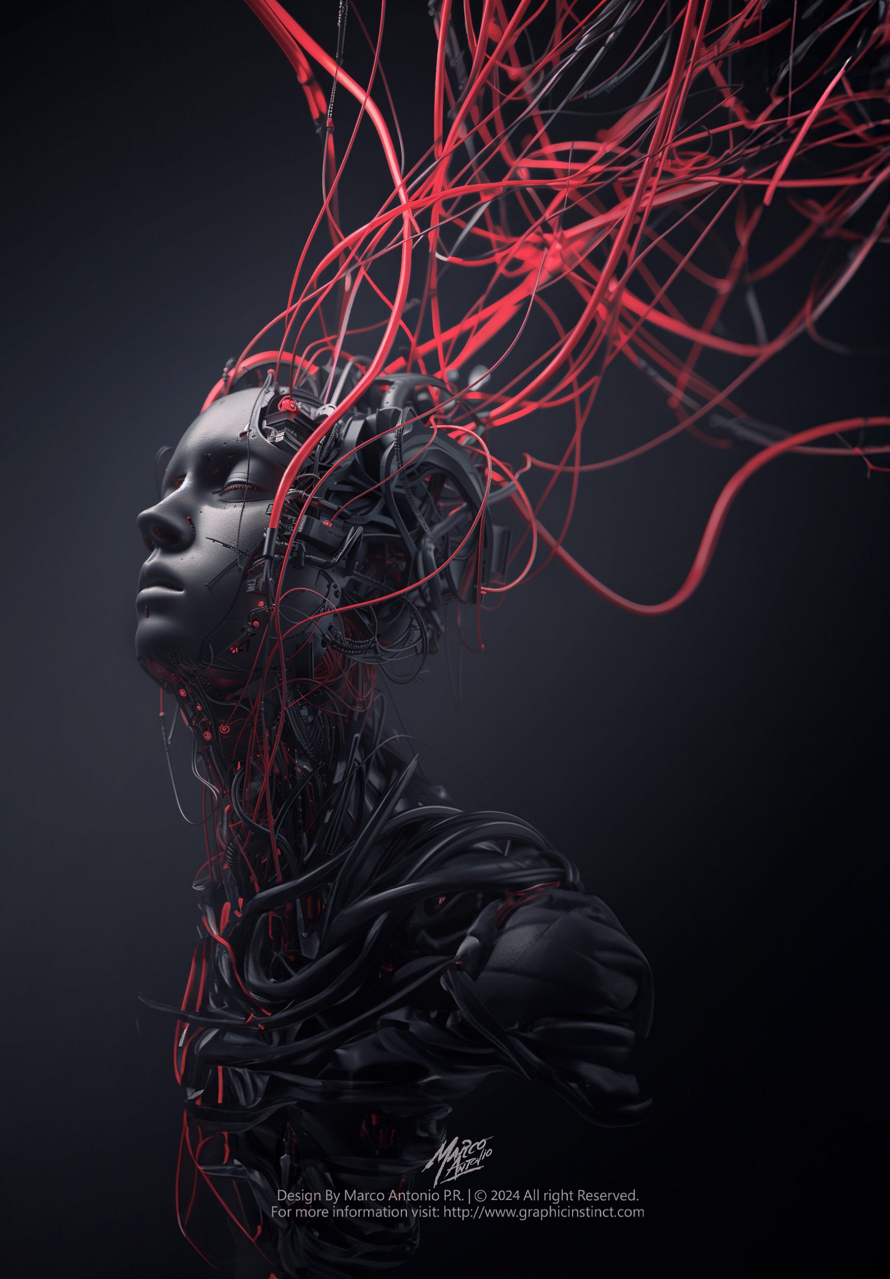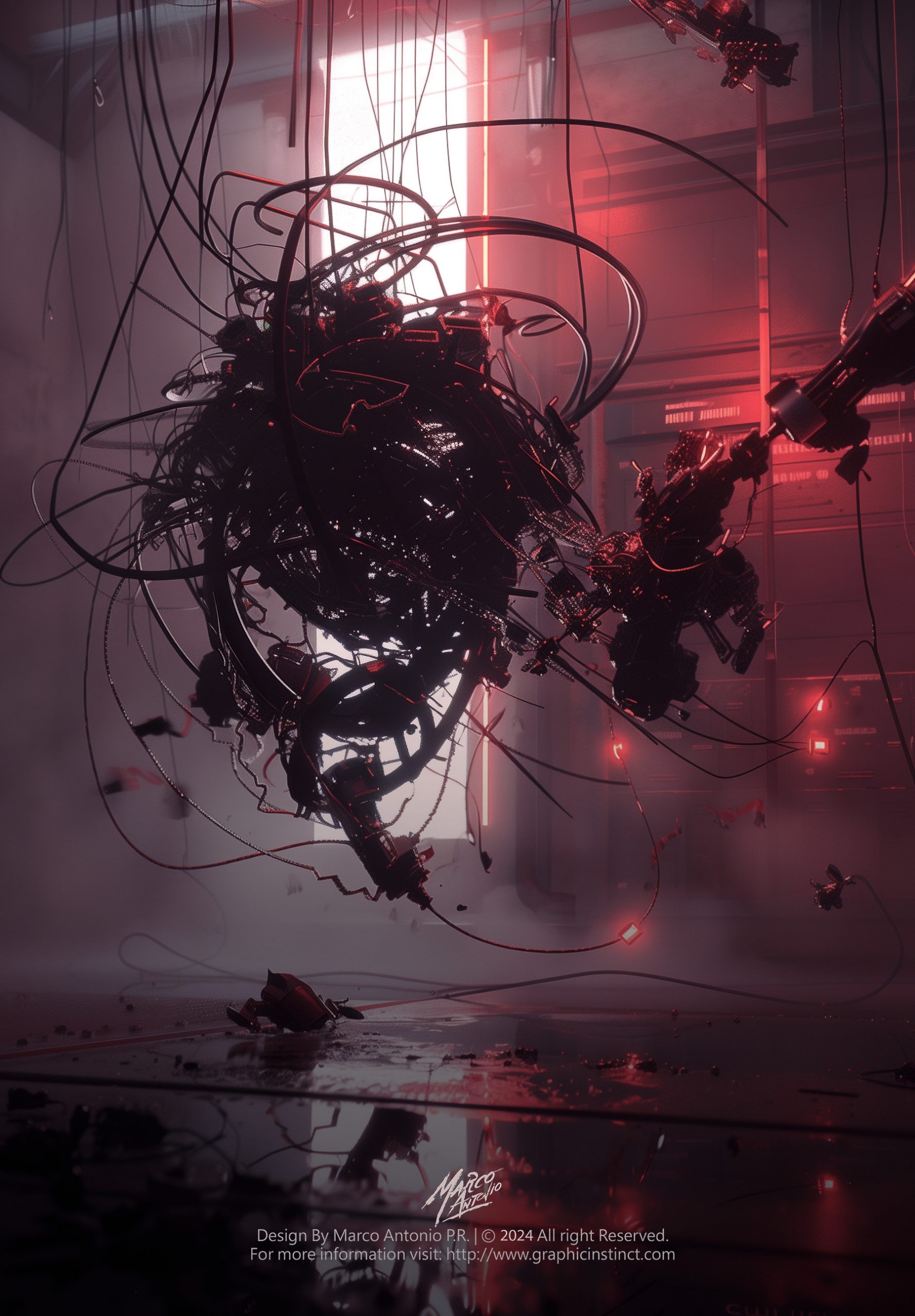 Description: This work sits at the intersection of contemporary digital art and cyberpunk aesthetics, with clear echoes of the dystopian science fiction tradition.The composition is reminiscent of the works of artists such as H.R. Giger, especially in the way the organic and the mechanical intertwine into an almost monstrous entity. The predominant red and black tones are evocative of expressionism, channelling an atmosphere of tension and conflict. The use of negative space around the central structure enhances the feeling of isolation and alienation, recurring concepts in the work of artists exploring themes of technology and dystopia, such as Zdzisław Beksiński. Furthermore, the dim light and deep shadows evoke an atmosphere of uncertainty, almost like a scene from a neo-noir sci-fi film, recalling Ridley Scott’s cinematic work in Blade Runner.