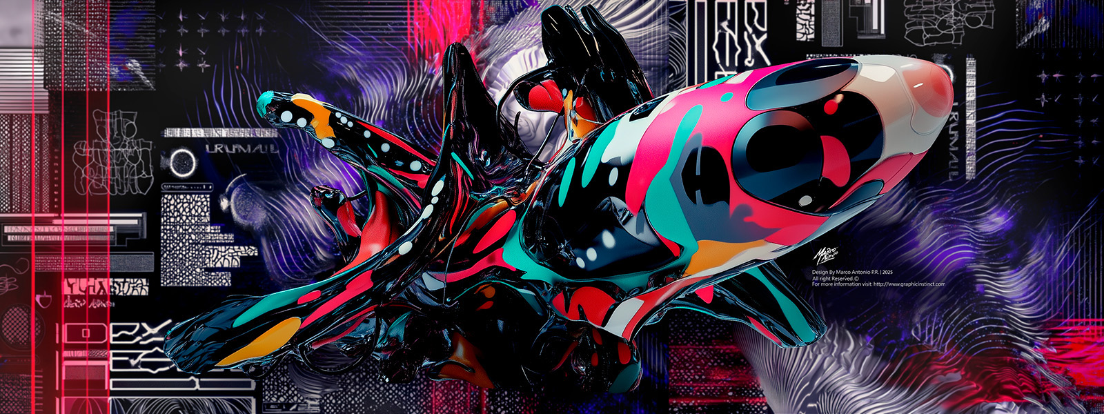 The second work, for its part, immerses us in an even more abstract dimension. The central form resembles a spaceship or a fragment of futuristic technology, but it is enveloped in a dance of abstract patterns and psychedelic colors reminiscent of Op Art by Victor Vasarely and Street Art of the 1980s, with references to the work of artists like Keith Haring and Jean-Michel Basquiat in their graffiti. The shiny surfaces and vibrant color palette reflect the influence of Pop Art, while the binary codes, diagrams, and digital textures glimpsed in the background connect us with cyberpunk aesthetics and digital post-modernism. In this work, the artist seems to ask what happens when technology becomes so omnipresent that it begins to mutate our own reality, creating a new kind of disorder, a digital “new world disorder”.