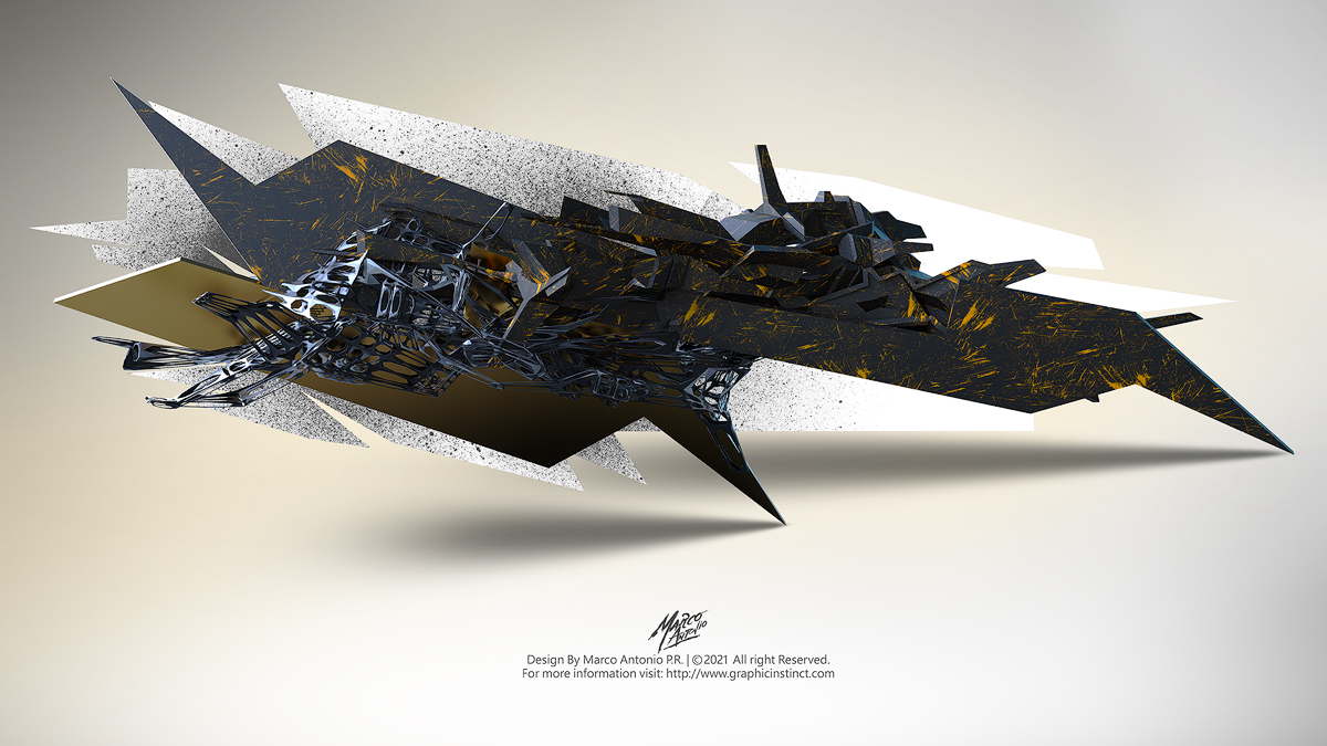 Description: Set of some digital 3d illustrations, abstract composition with geometric shapes modeled and rendered in blender, final adjustments with gimp.