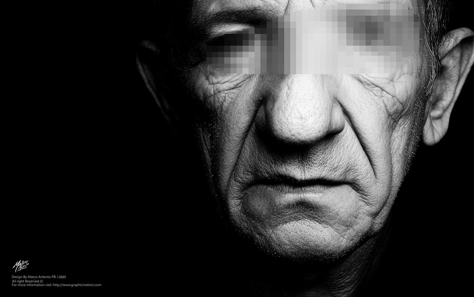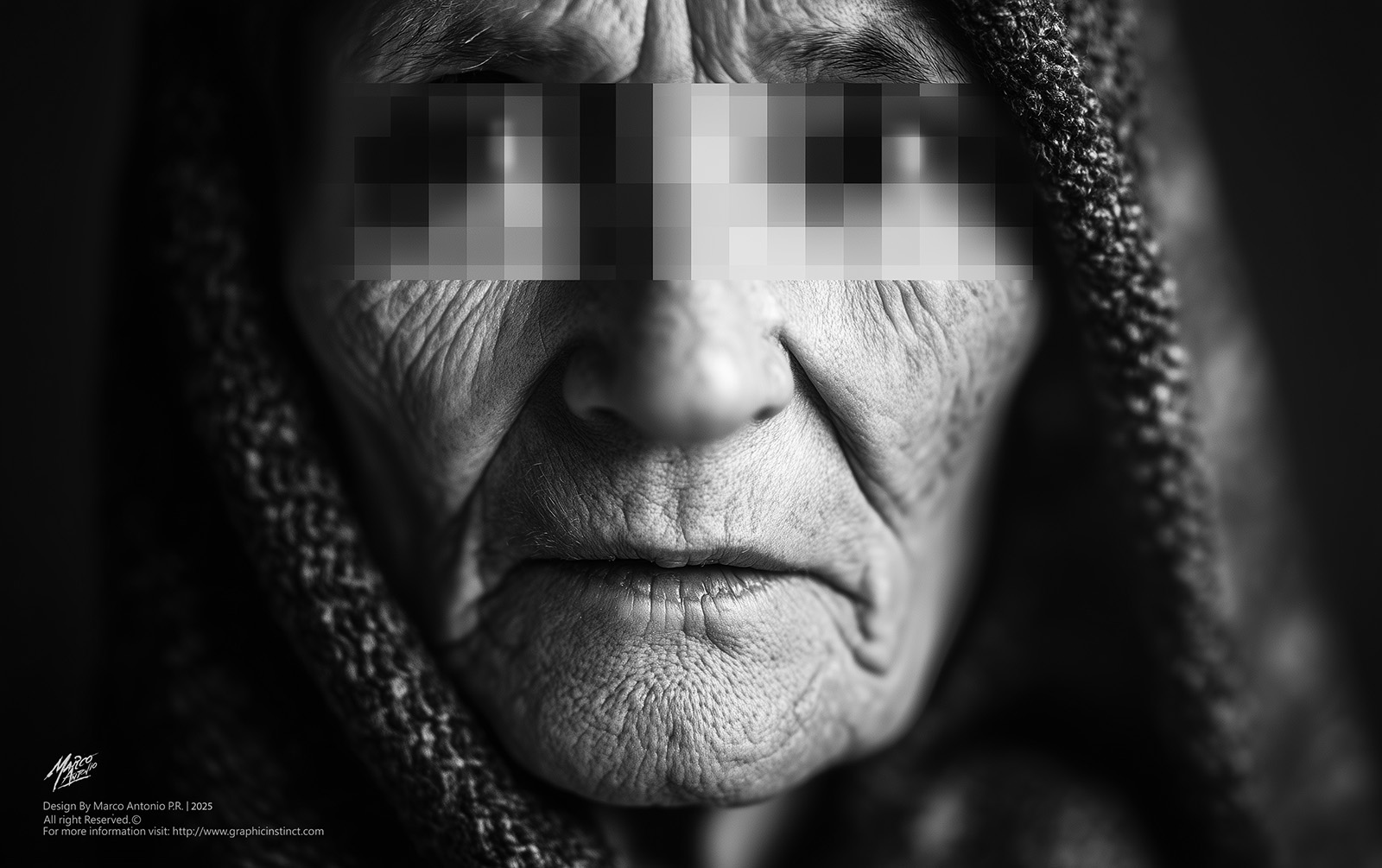 The work recovers the tradition of documentary portraiture—the meticulous attention to the body and its marks, inherited from 20th “century photography” and fuses it with a contemporary digital aestheticth at challenges the very technology of the image. The strong lighting and sculptural volumes evoke the heritage of Rembrandt’s chiaroscuro, while the expressive force of the aged face resonates with painters such as Lucian Freud, and the social portraiture of Dorothea Lange and August Sander. At the sametime, the intervention of pixelation and digital distortion anchors the piece in the lineage of Glitch Art and contemporary digital practices: technology not only records but also operates as metaphor “censorship, anonymity, error, orprotection” over identity. As a whole, the work dialogues with the history of portraiture (from classical painting to documentary photography) and with current debates about data, privacy, and human dignity in images. Figures like Diane Arbus or Cindy Sherman echo in the thematic background “the exploration of otherness, intimacy, and performativity” while pixelation situates the artwork within the technological questioning of contemporary vision.