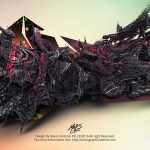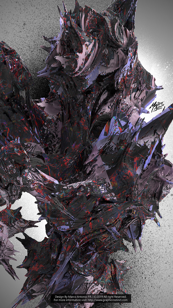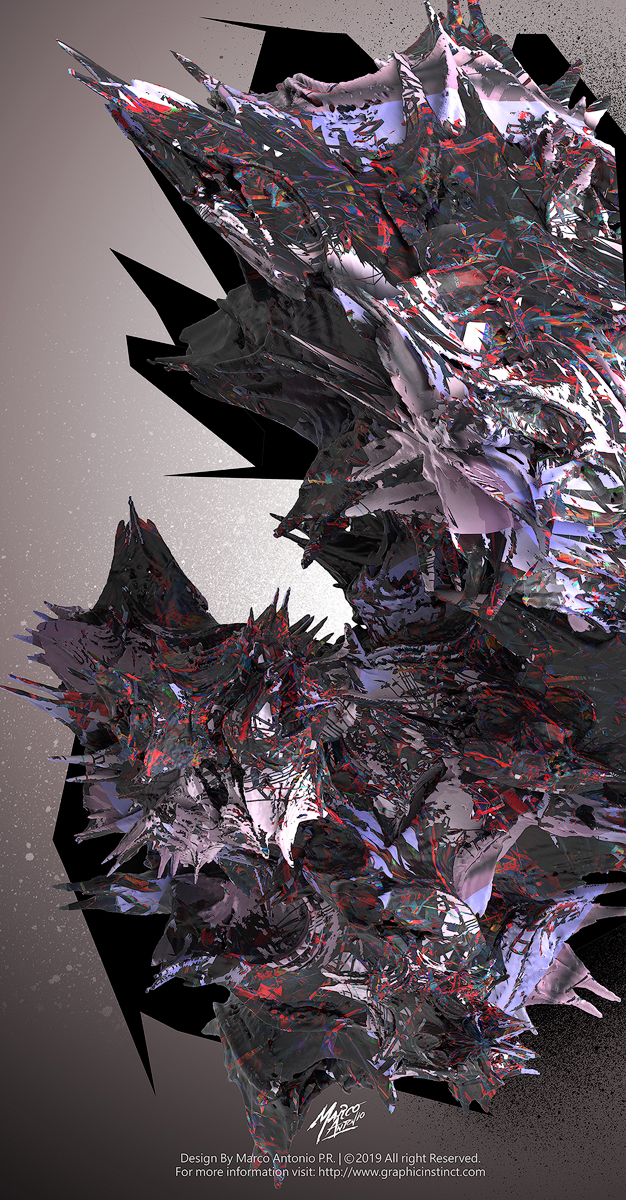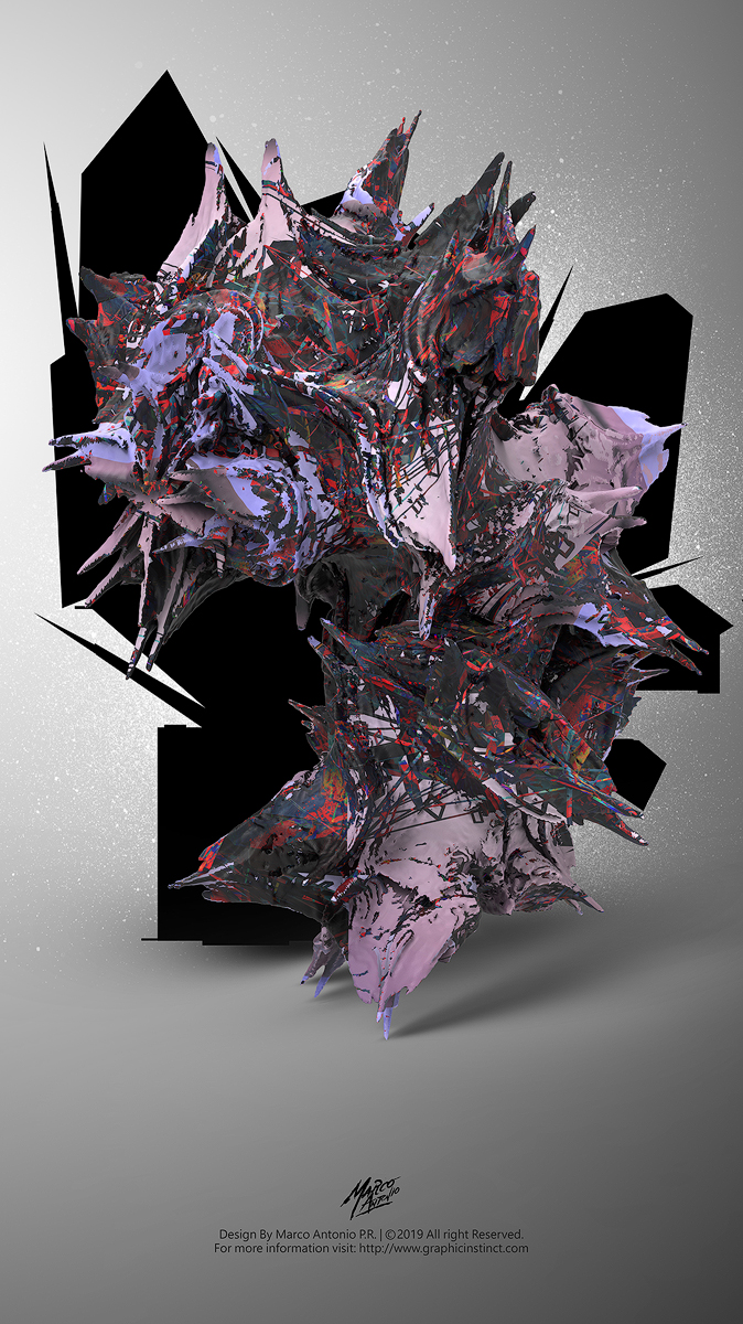 Description: Technically, the artwork appears to be a 3D render, likely created using Blender Software. The central object exhibits a high level of detail, with intricate textures and complex surface deformations. The lighting appears to be carefully considered, with a light source seemingly positioned to highlight the object’s contours and create dramatic shadows. The use of reflective materials further enhances the sense of realism and depth. The background consists of flat, black geometric shapes, which serve to isolate the central object and create a strong visual contrast. The overall composition is dynamic, with the object positioned slightly off-center, contributing to a sense of movement and energy. The image also seems to have some post-processing applied, possibly including adjustments to contrast, saturation, and sharpness. The texture used on the object appears to be a noise or displacement map, creating the irregular and organic look.