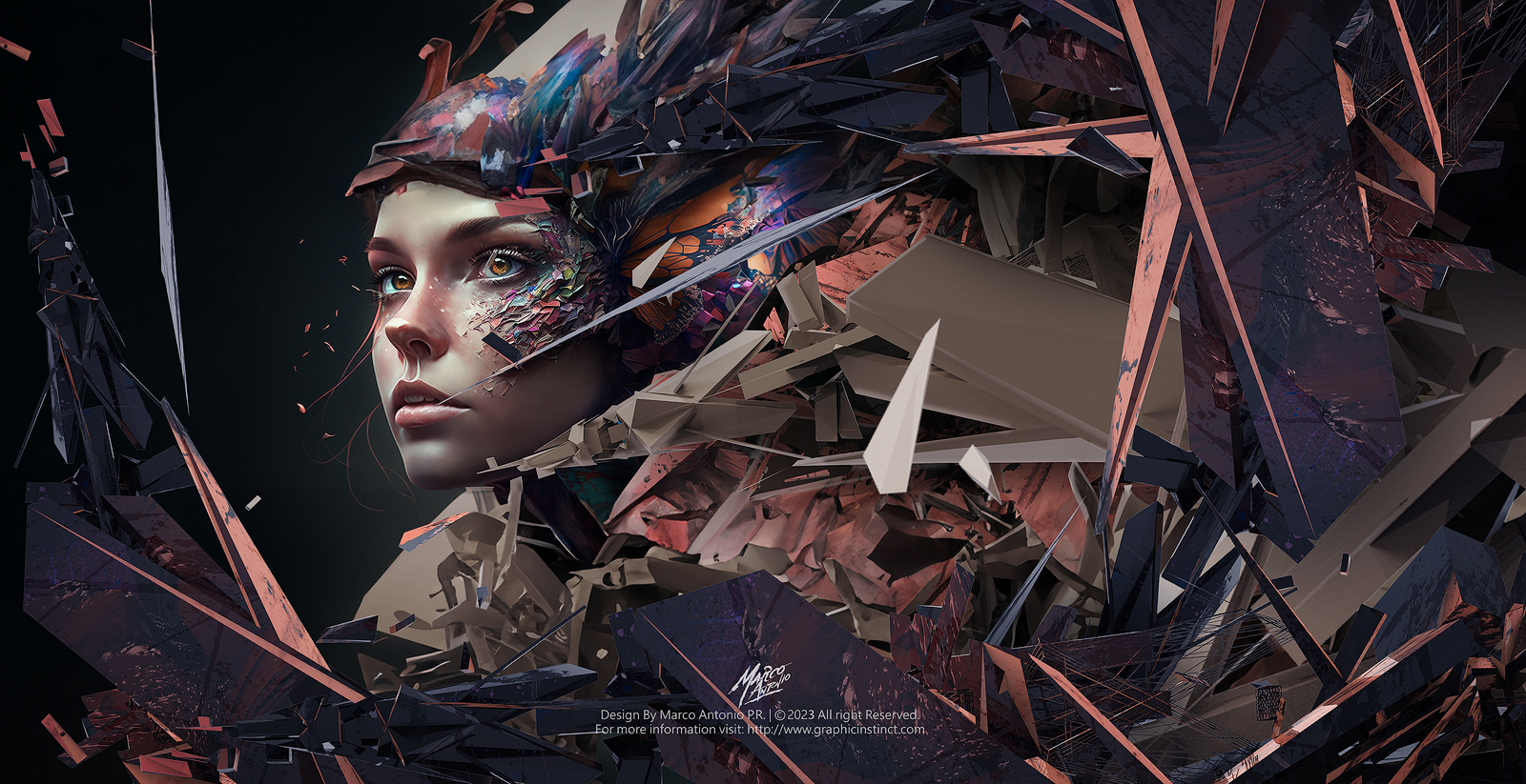 Description: Digital illustration modeled, composed and rendered in blender. Background rendered in midjourney and edit with gimp. Composition and adjustments made with gimp.