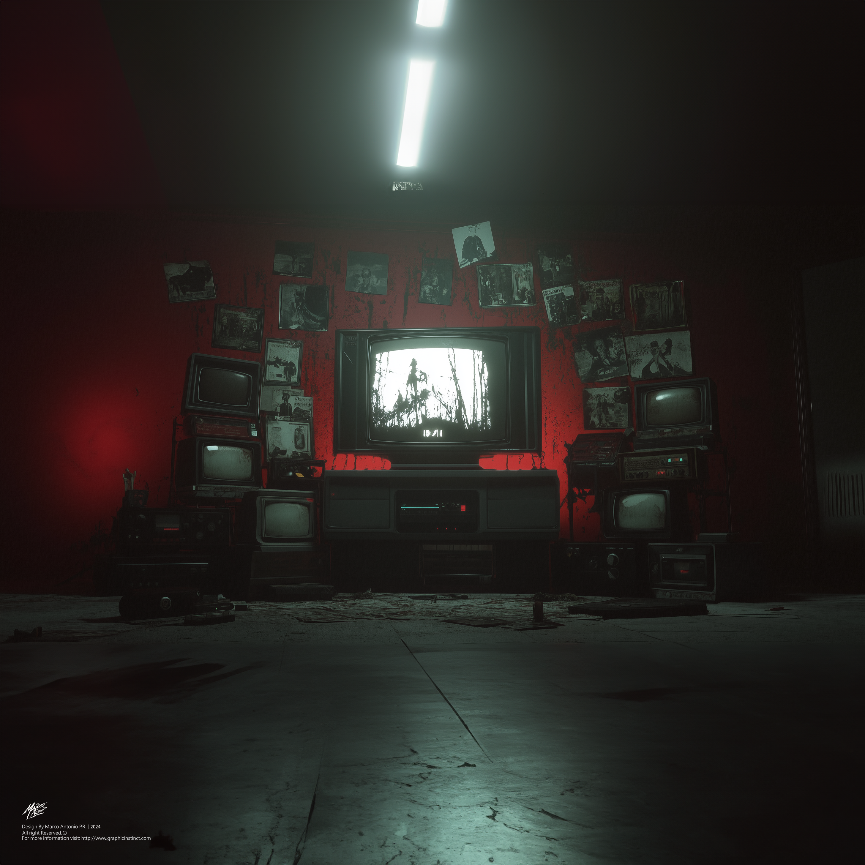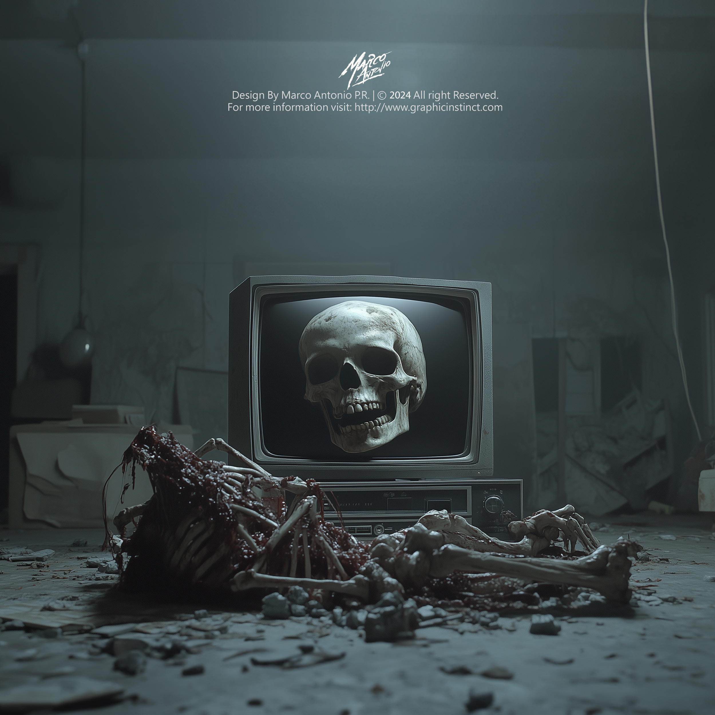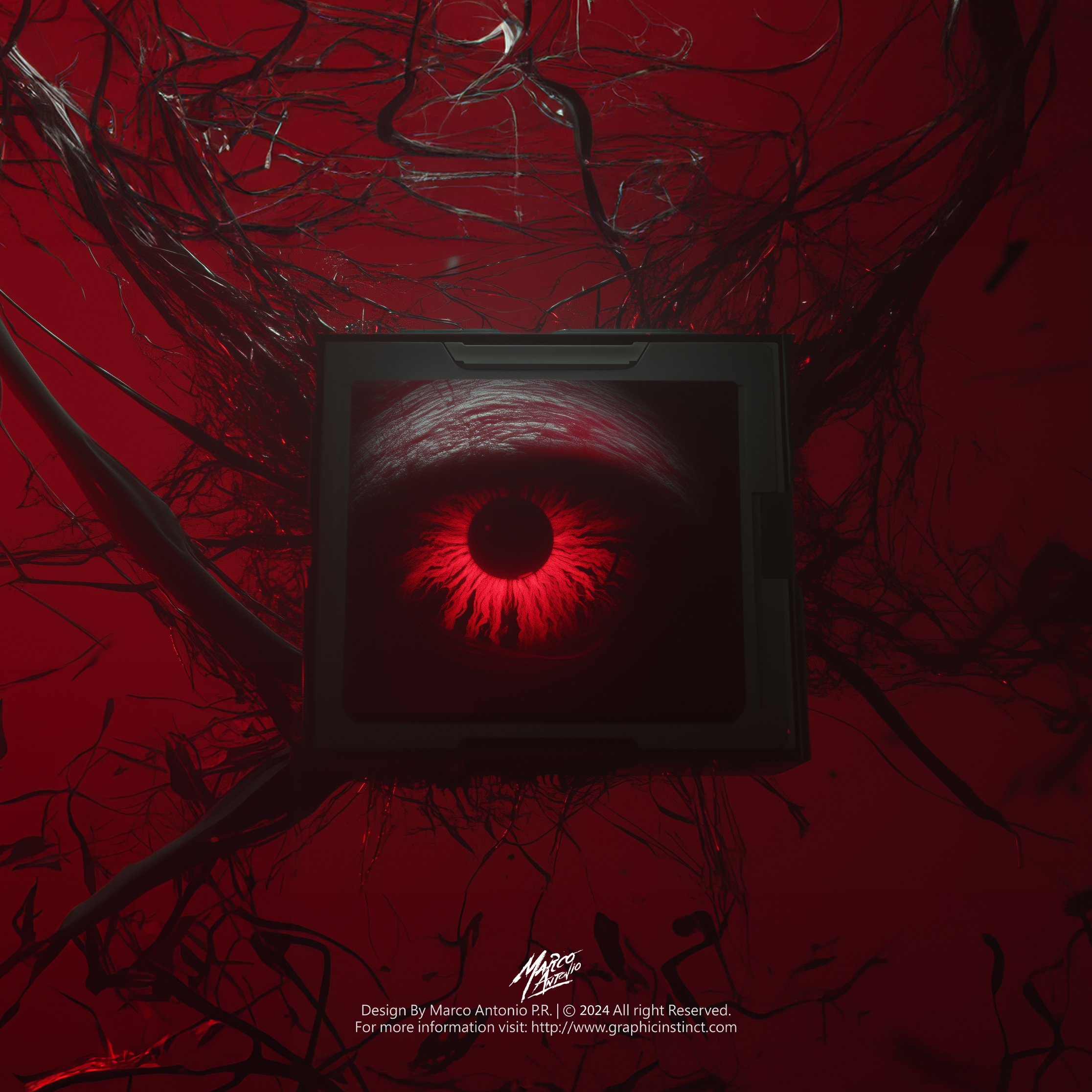 The use of cold lights and dark backgrounds reinforces a somber atmosphere, contrasted by the graphic violence of the exposed skeleton in one of the images, which could refer to the invisible horrors of the 21st century: wars, environmental destruction, and the consequences of technological overload. Other images in this series, in a cleaner and more minimalist tone on a deep red background, recall 20th-century propaganda posters, playing with symbolic colours of passion and death, with possible allusions to artists such as Francis Bacon, who explored the flesh and human decay.