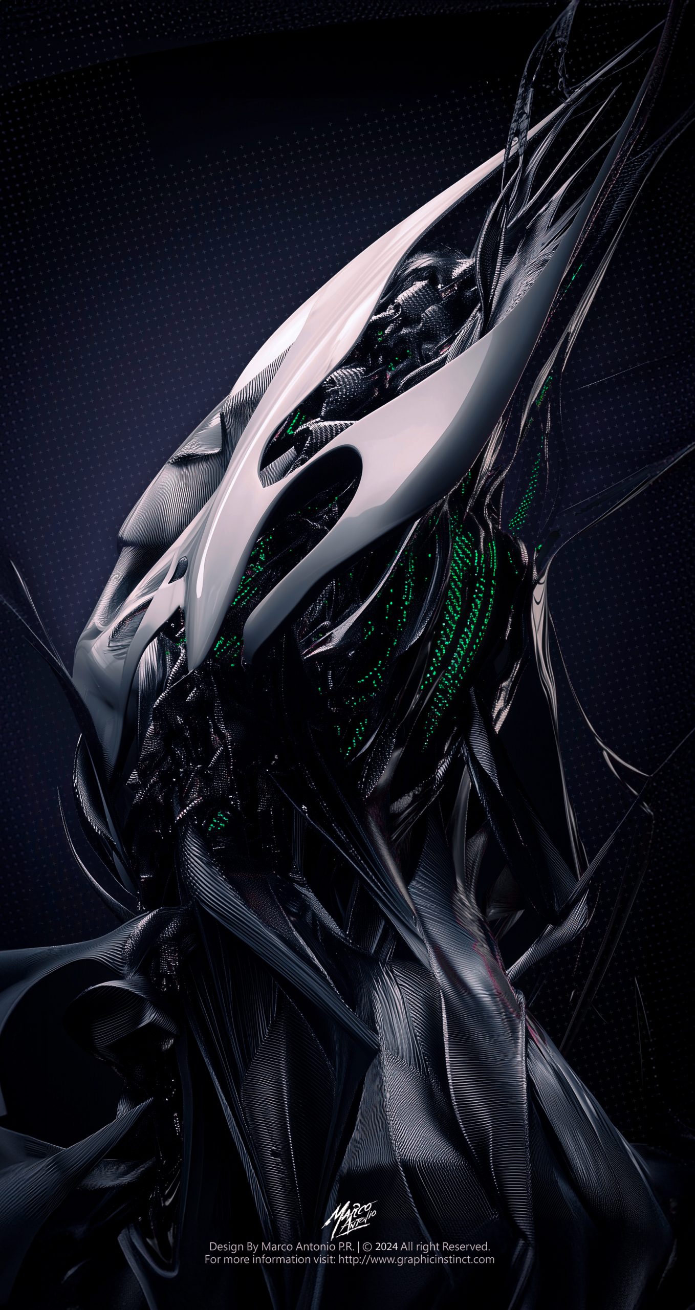 Technical analysis: The piece uses a sophisticated combination of organic and mechanical forms, evoking the biotechnological visions of H.R. Giger and Zaha Hadid, where fluidity and structure coexist in harmonious tension. Dark, shimmering textures, along with luminous green accents, suggest an influence from cyberpunk art, specifically the visual aesthetics of films such as Blade Runner, where the fusion of the biological with the mechanical is a central theme.
