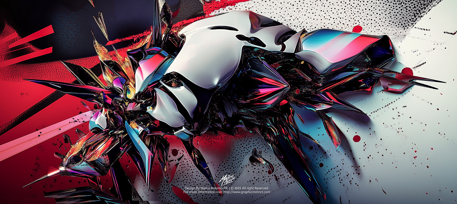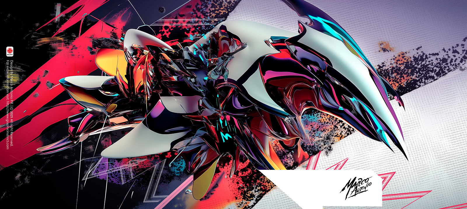 “Quantum Bloom” showcases a masterful command of digital rendering techniques, demonstrating sophisticated use of 3D modeling software and procedural generation. The textures suggest a combination of highly polished, almost metallic surfaces and more organic, fluid elements, achieved through advanced shading and lighting algorithms. The chaotic yet harmonious composition draws parallels to the Futurist movement, particularly the dynamic and fragmented forms seen in works by Umberto Boccioni such as Unique Forms of Continuity in Space, which sought to capture motion and speed. There’s also a clear influence of biomorphic abstraction, reminiscent of artists like Jean Arp or later, H.R. Giger in its fusion of biological and mechanical forms, though presented here with a far more vibrant and less overtly dark aesthetic. The color palette, with its bold contrasts and neon accents, hints at synthwave aesthetics and the hyper-realism often found in concept art for sci-fi video games. The subtle textural details and light reflections indicate a high level of fidelity, possibly achieved through ray tracing or path tracing techniques, lending a tangible quality to the otherwise fantastical subject matter. The overall effect is a highly detailed and visually complex piece that pushes the boundaries of digital art as a medium for both aesthetic beauty and profound conceptual exploration.