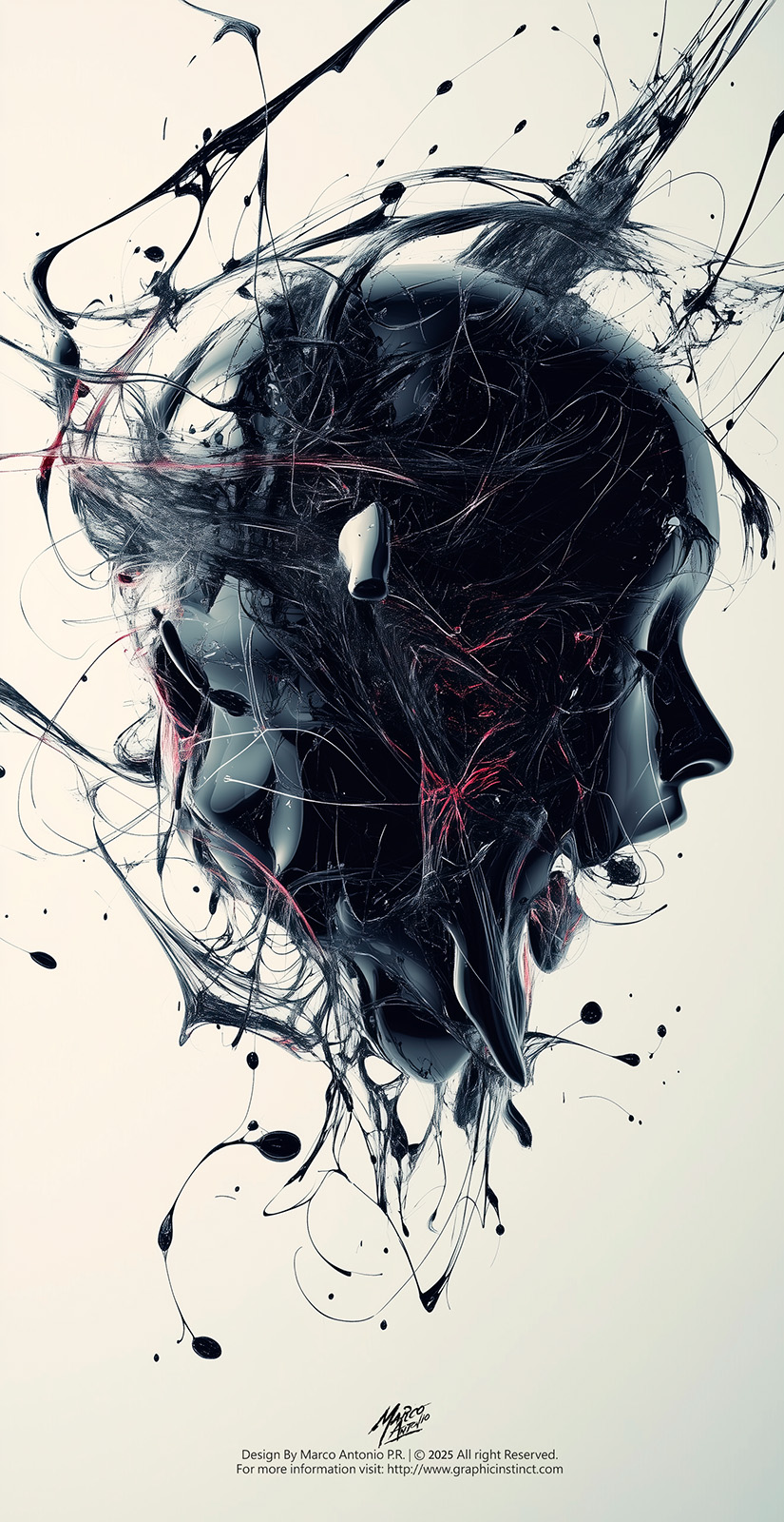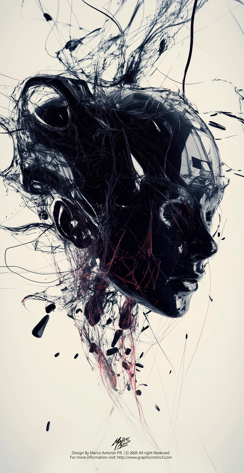 Technical Analysis: The three images share a limited but impactful color palette, where deep black contrasts with the bone white of the background and touches of red, creating a sense of drama and mystery. The technique used is digital image manipulation, combining photographic elements with abstract graphics and textures, achieving an effect of dynamism and fragmentation.