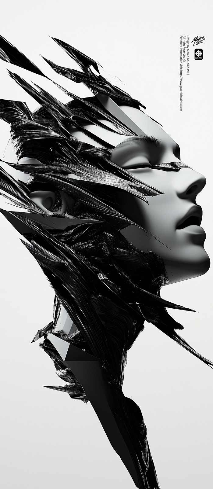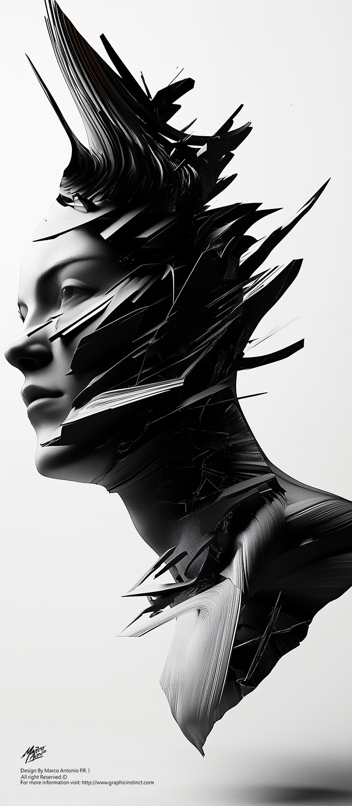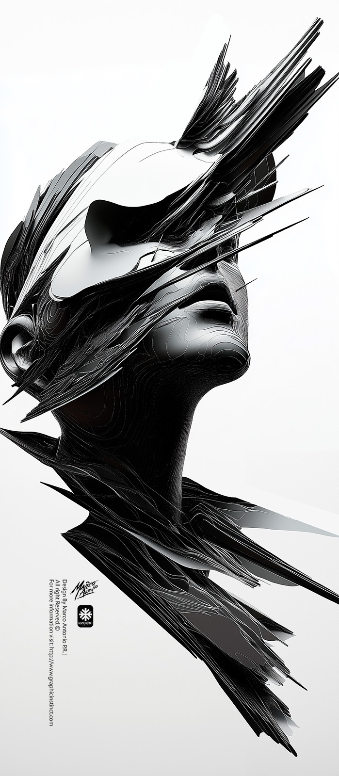 Description: The piece is a striking example of digital surrealism, blending 3D rendering with abstract expressionism. The artist employs a monochromatic palette, emphasizing the stark contrast between light and shadow to sculpt the form. The sweeping, almost violent lines create a sense of movement, while the fragmented, crystalline textures add depth and dimension. The sharp, angular structures juxtaposed with organic curves recall the works of H.R. Giger and Zaha Hadid, while the blurred edges invoke the dynamism of Futurism.