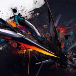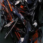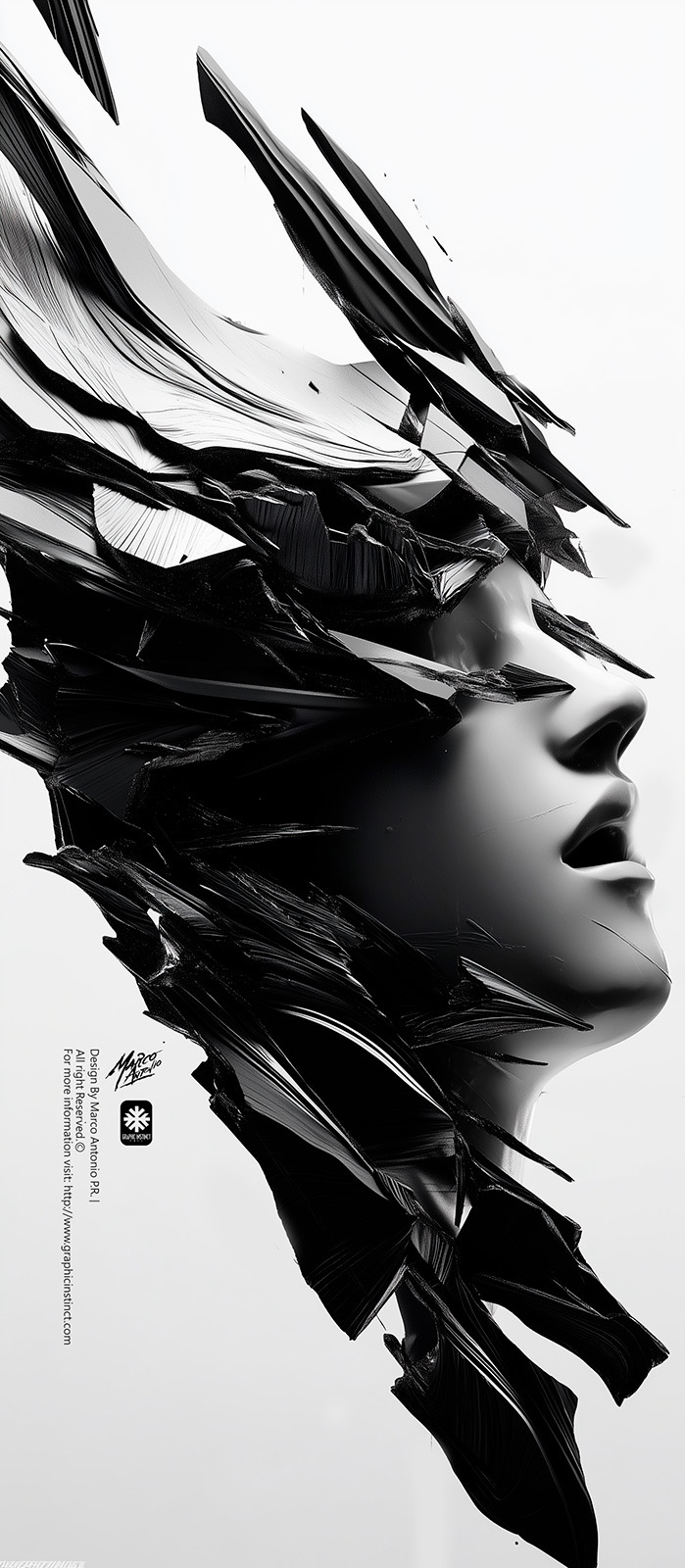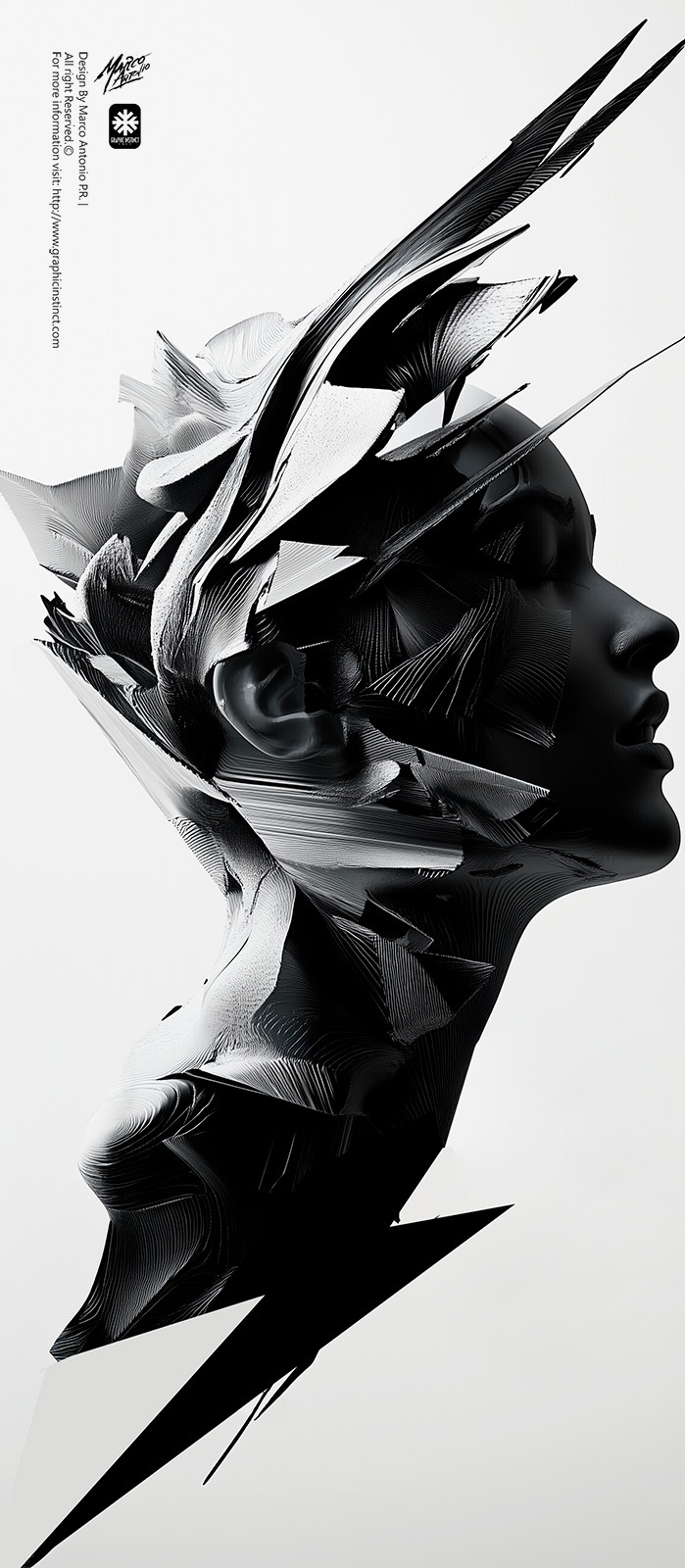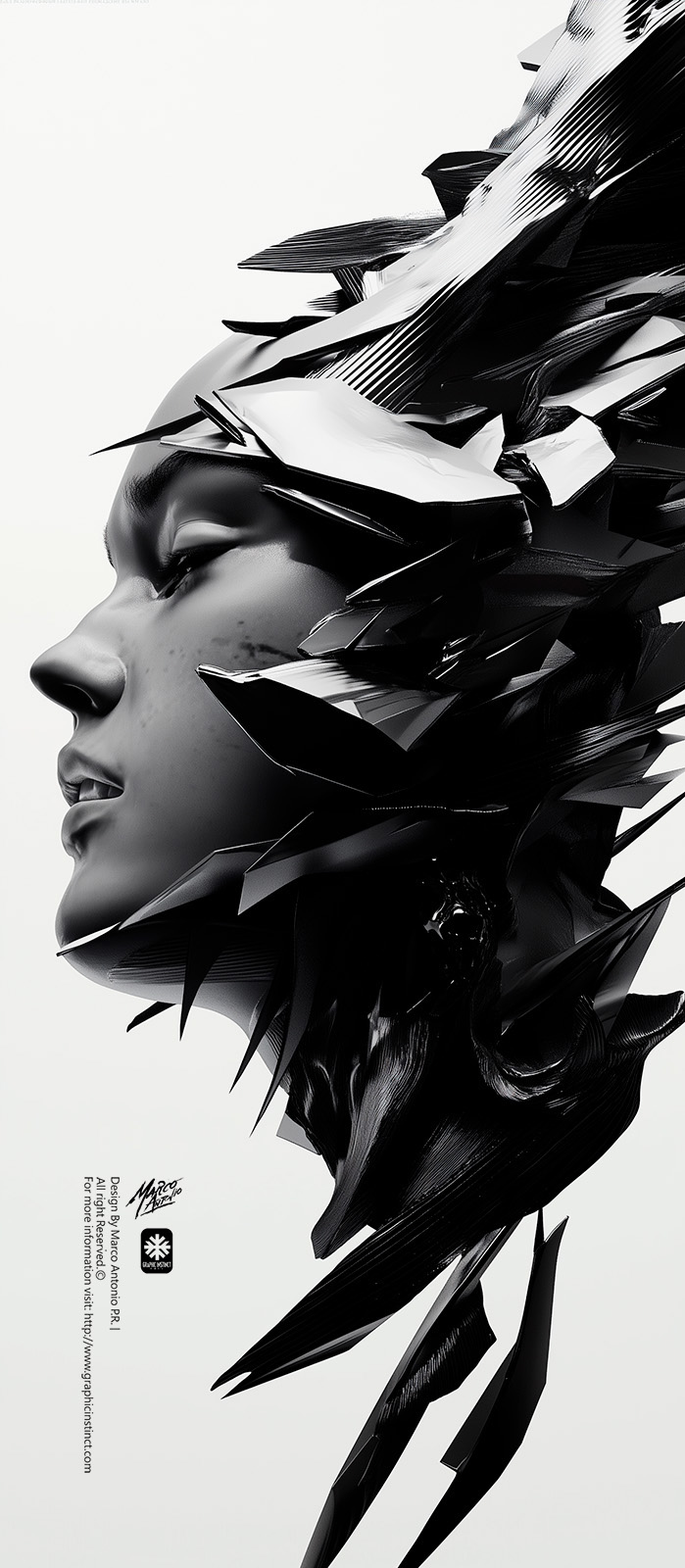 Description: The piece is a striking example of digital surrealism, blending 3D rendering with abstract expressionism. The artist employs a monochromatic palette, emphasizing the stark contrast between light and shadow to sculpt the form. The sweeping, almost violent lines create a sense of movement, while the fragmented, crystalline textures add depth and dimension. The sharp, angular structures juxtaposed with organic curves recall the works of H.R. Giger and Zaha Hadid, while the blurred edges invoke the dynamism of Futurism.