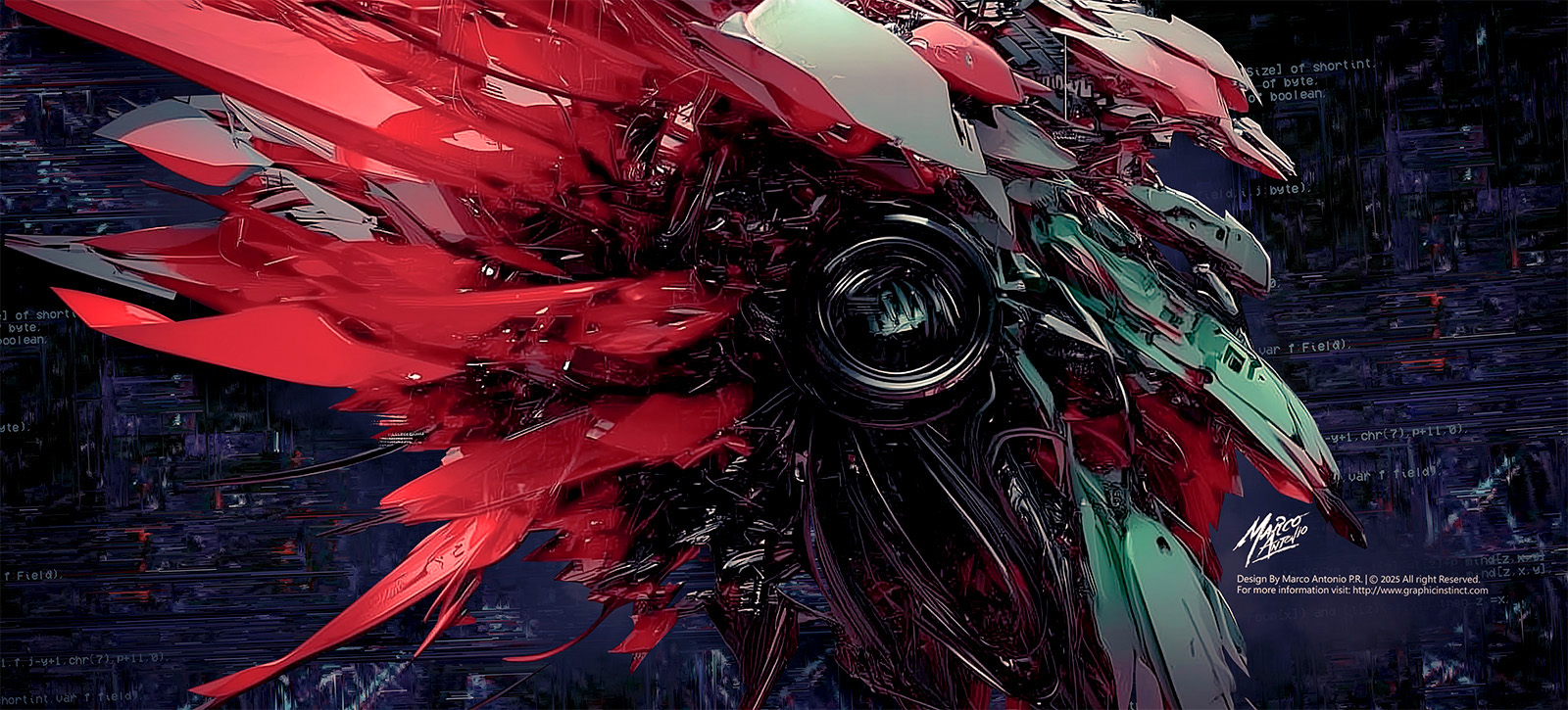 Its wings are not feathers but fragments of code and steel, and its heart beats in invisible frequencies that pierce through matter.