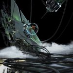 Foreground structures are built using techniques echoing parametric design and procedural geometry, resulting in alien, quasi-organic formations. The visual noise in the background mimics ASCII art and fragmented barcode language, invoking the aesthetic of early computer systems, akin to Matrix-inspired symbolism.