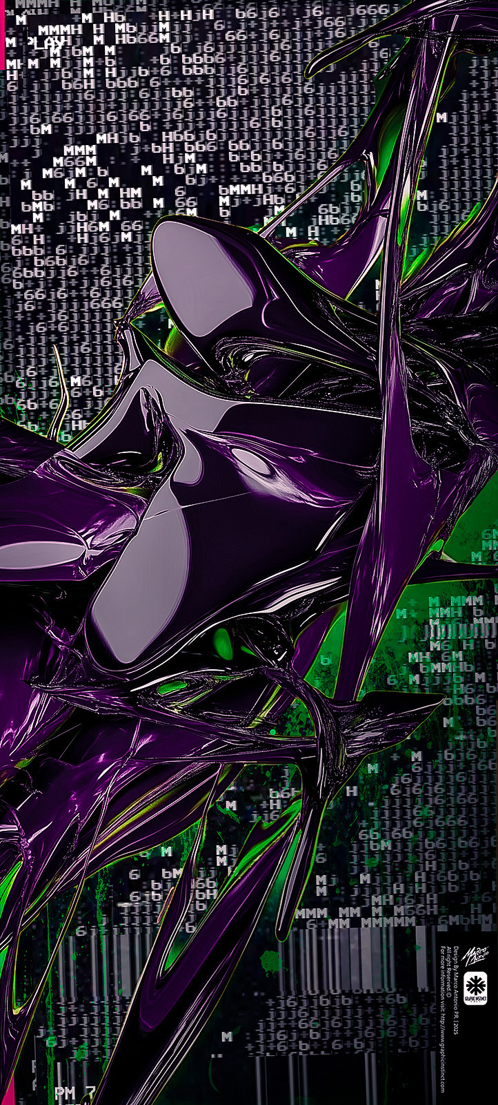 The contrasting color palette—deep purples and radioactive greens—enhances the tension between synthetic elegance and corrupted data. Stylistically, the piece merges the abstraction of Deconstructivism with the digital consciousness of Neo-Futurist Art.