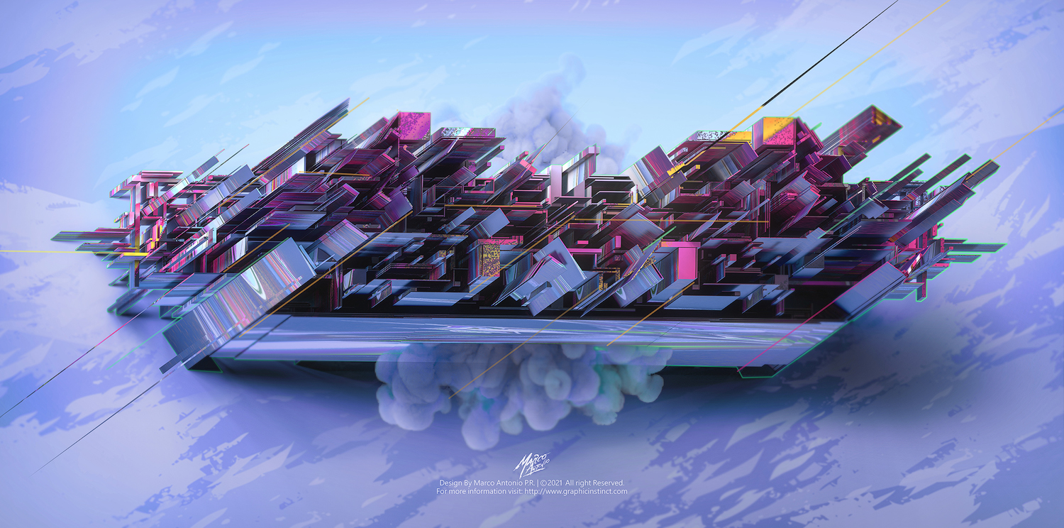 The presented image evokes a sense of fragmented urban complexity, a digital landscape that unfolds before our eyes like a constantly evolving metropolis. In the context of current digital art, this work dialogues with the tradition of geometric abstraction and constructivism, but with a clear technological imprint. A tension between order and chaos, structure and dissolution, can be observed, reflecting the very contradictions of the digital age.