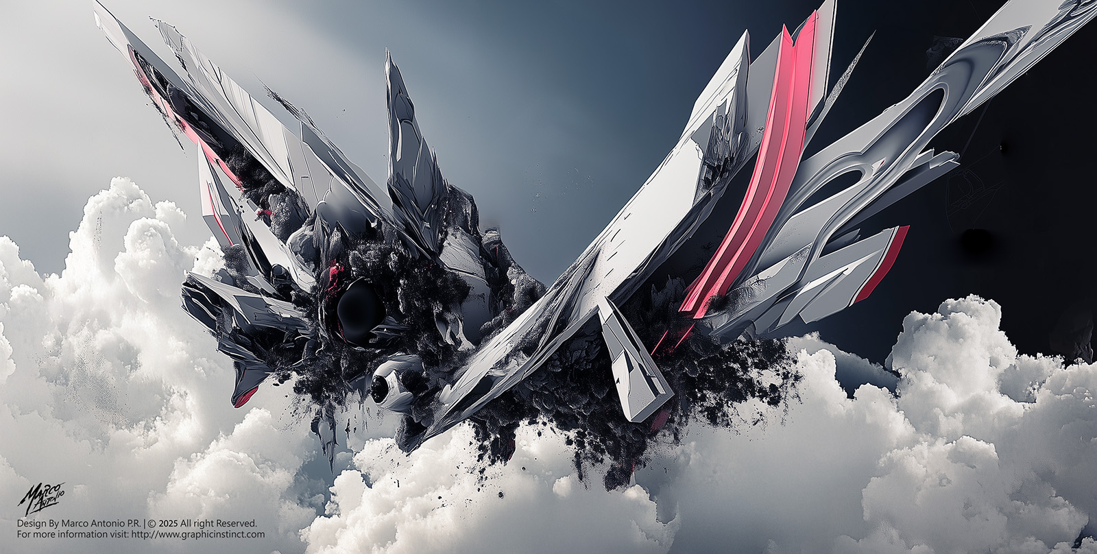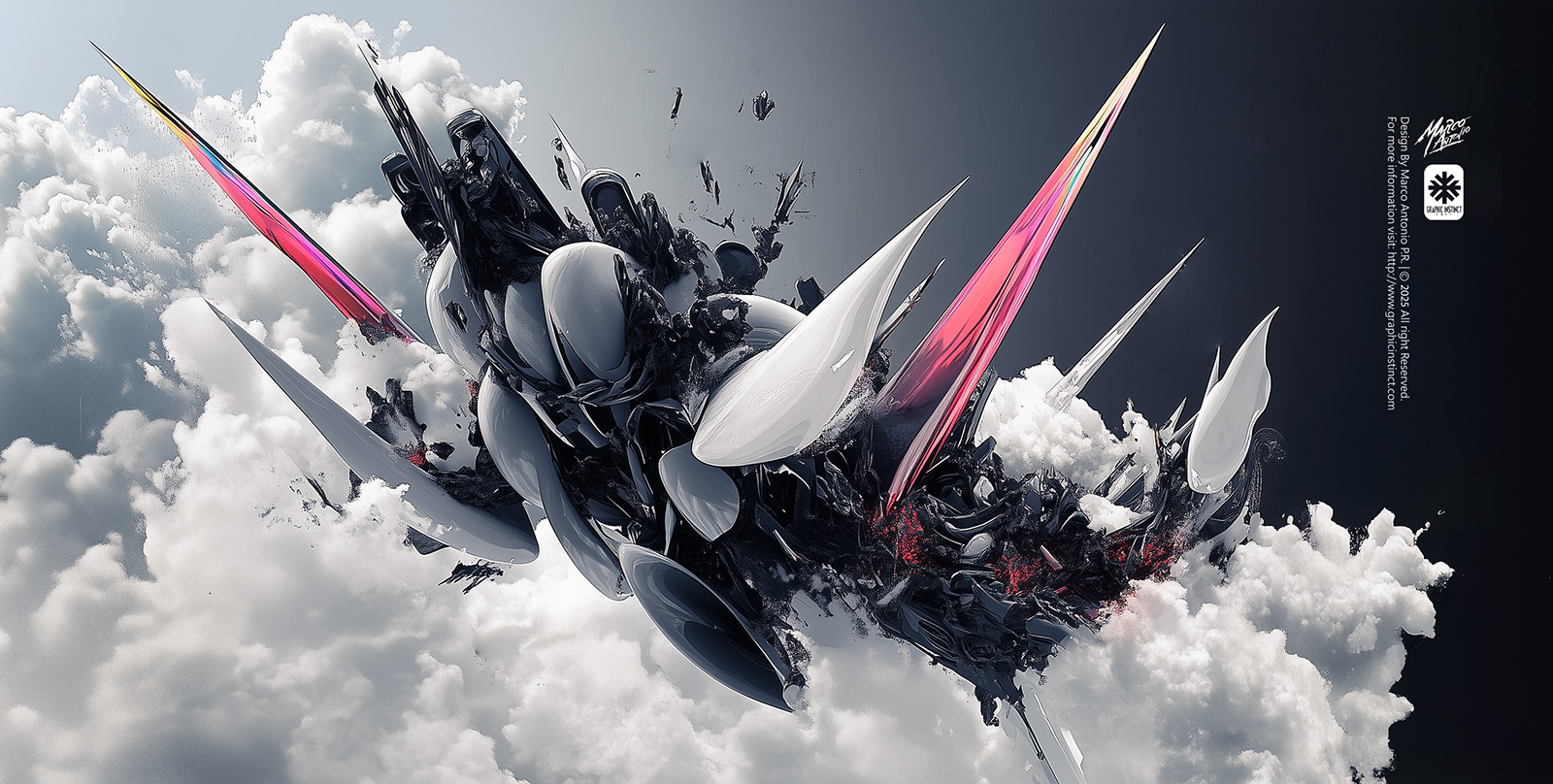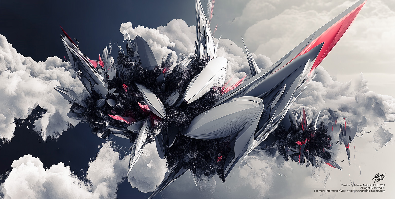 Technical Description: The image shows an abstract composition with complex geometric shapes that seem to float or explode in an undefined space. Dark tones predominate, with contrasts of white and touches of red that add dynamism to the image. The shapes appear to be constructed from angular fragments, as if they were remnants of an explosion. The background is composed of white clouds that contrast with the dark shapes, creating a sense of depth and atmosphere. The image has a high resolution and a great level of detail, which suggests the use of advanced 3D rendering techniques. The composition is dynamic and asymmetrical, which contributes to the feeling of movement and energy.
