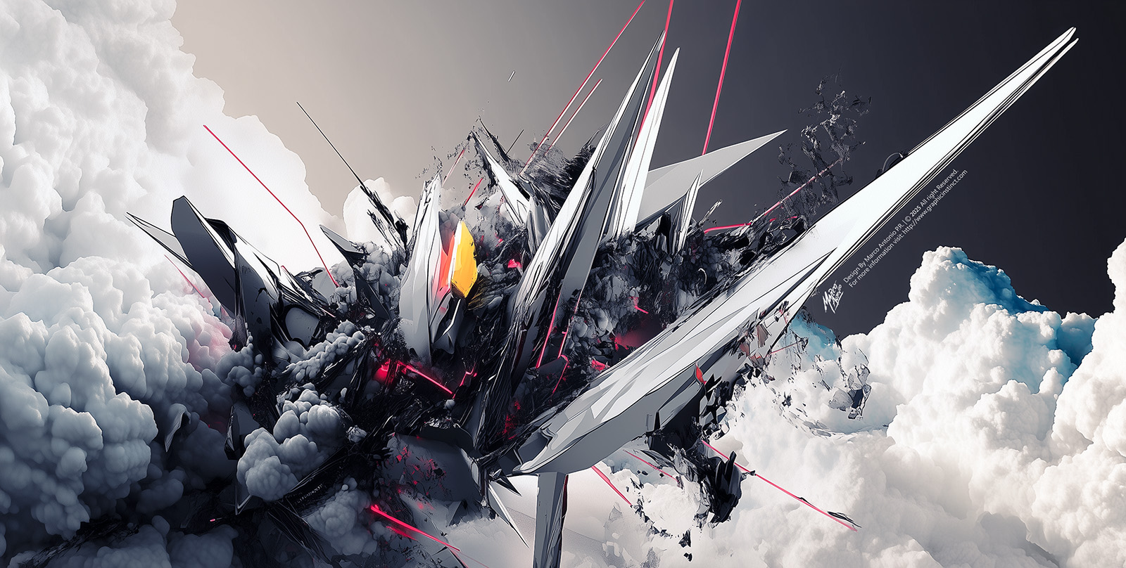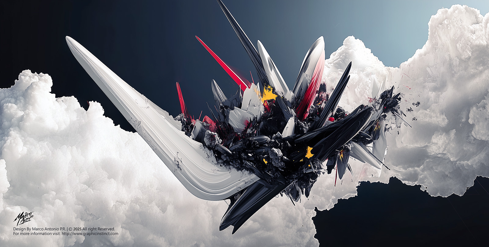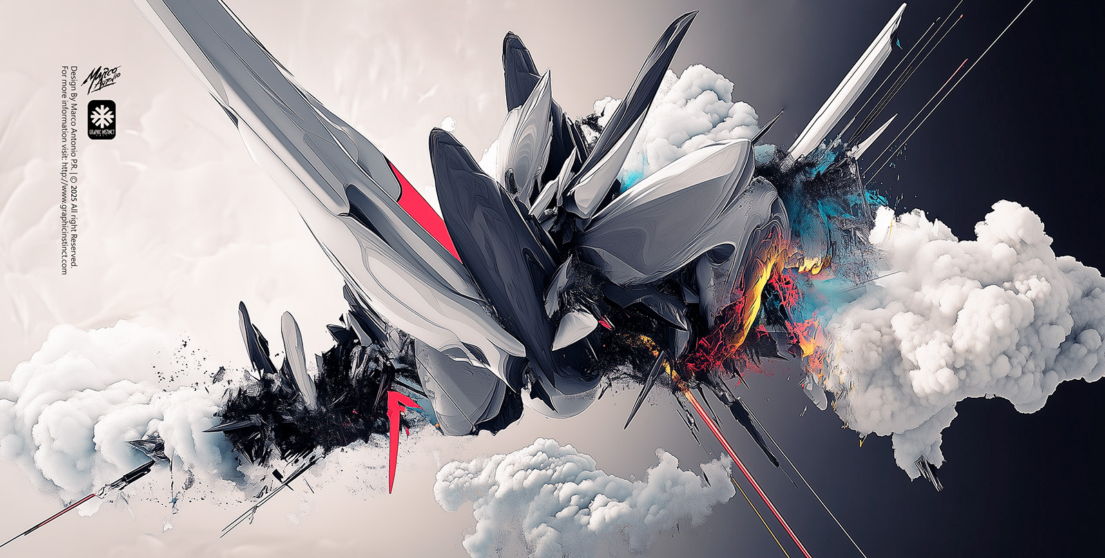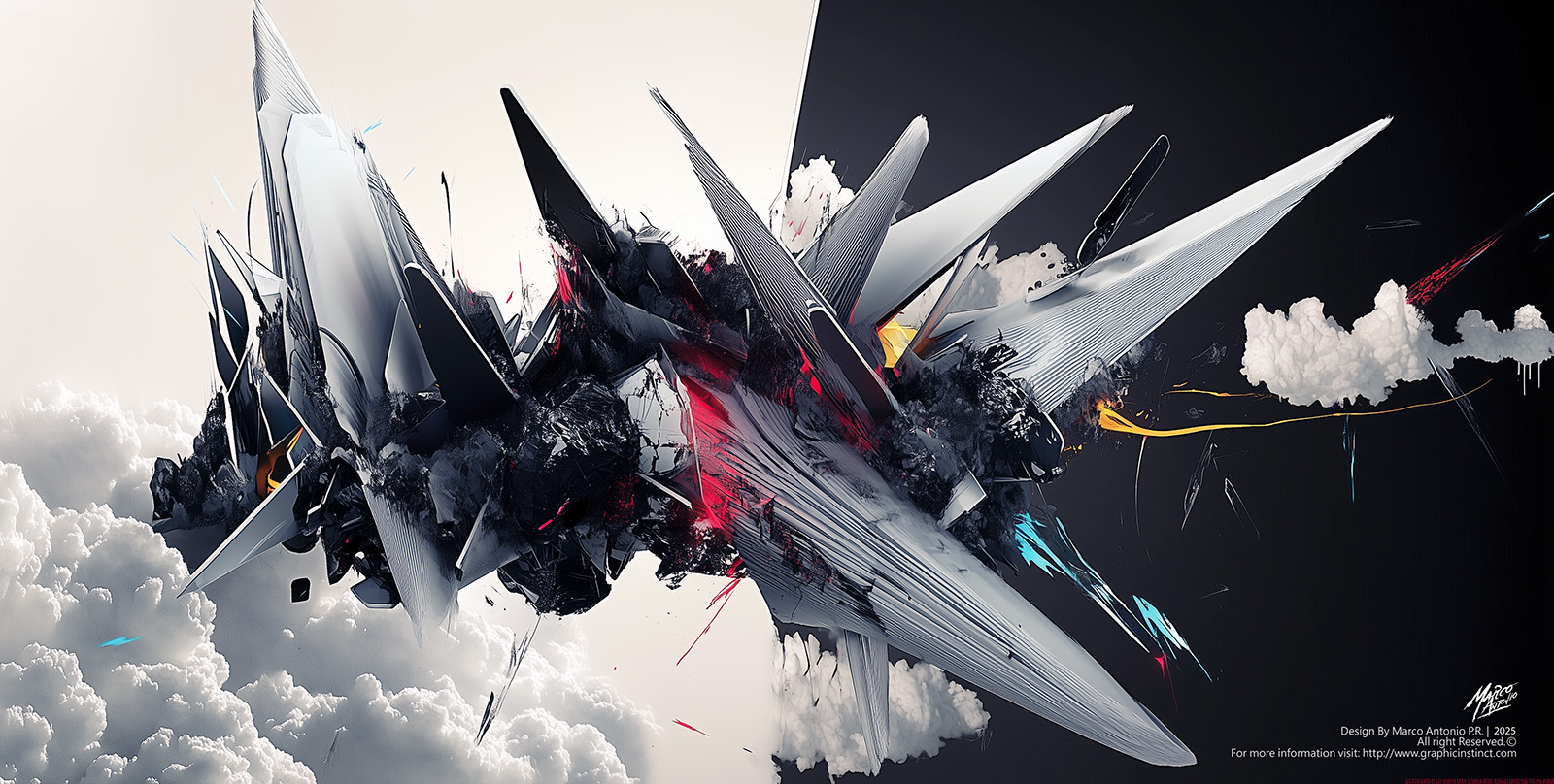 Technical Description: The image shows an abstract composition with complex geometric shapes that seem to float or explode in an undefined space. Dark tones predominate, with contrasts of white and touches of red that add dynamism to the image. The shapes appear to be constructed from angular fragments, as if they were remnants of an explosion. The background is composed of white clouds that contrast with the dark shapes, creating a sense of depth and atmosphere. The image has a high resolution and a great level of detail, which suggests the use of advanced 3D rendering techniques. The composition is dynamic and asymmetrical, which contributes to the feeling of movement and energy.