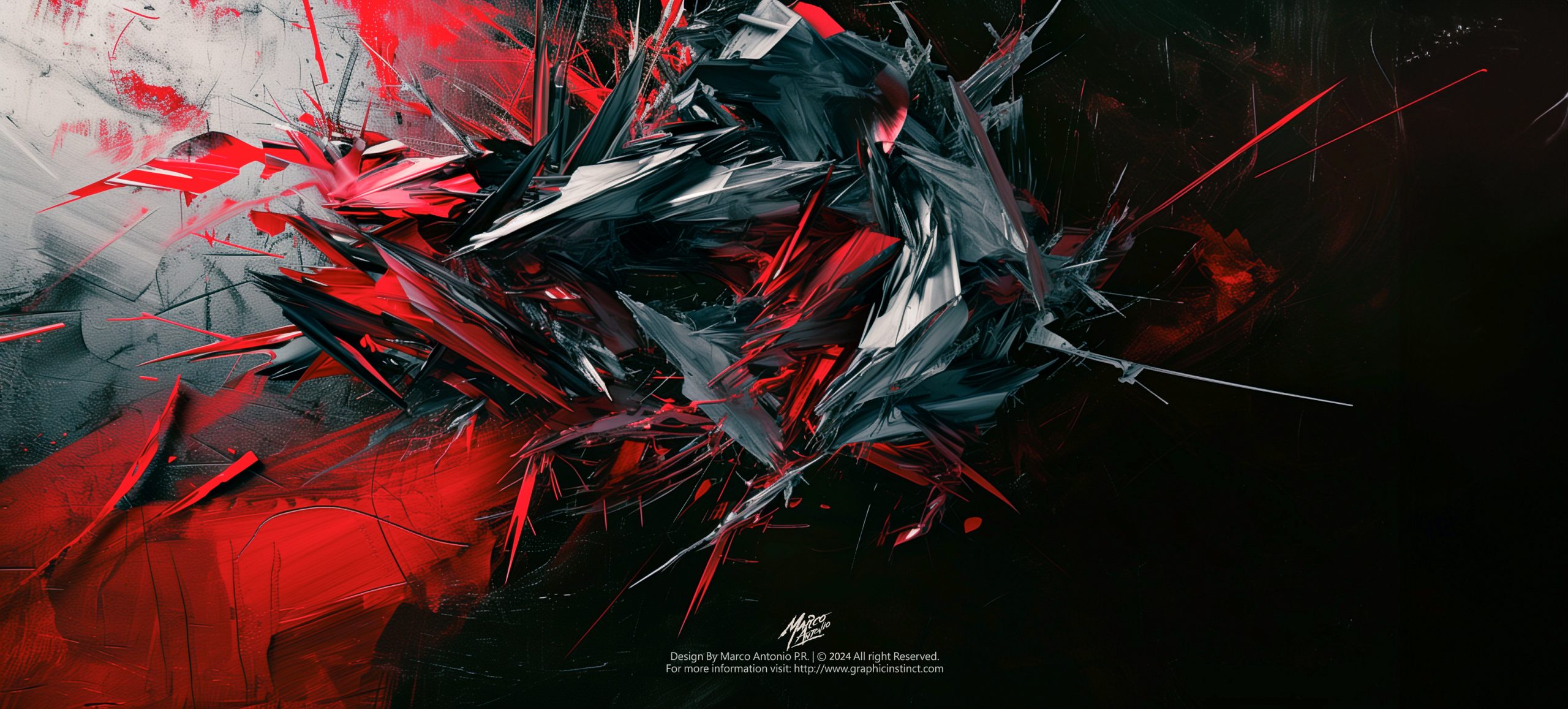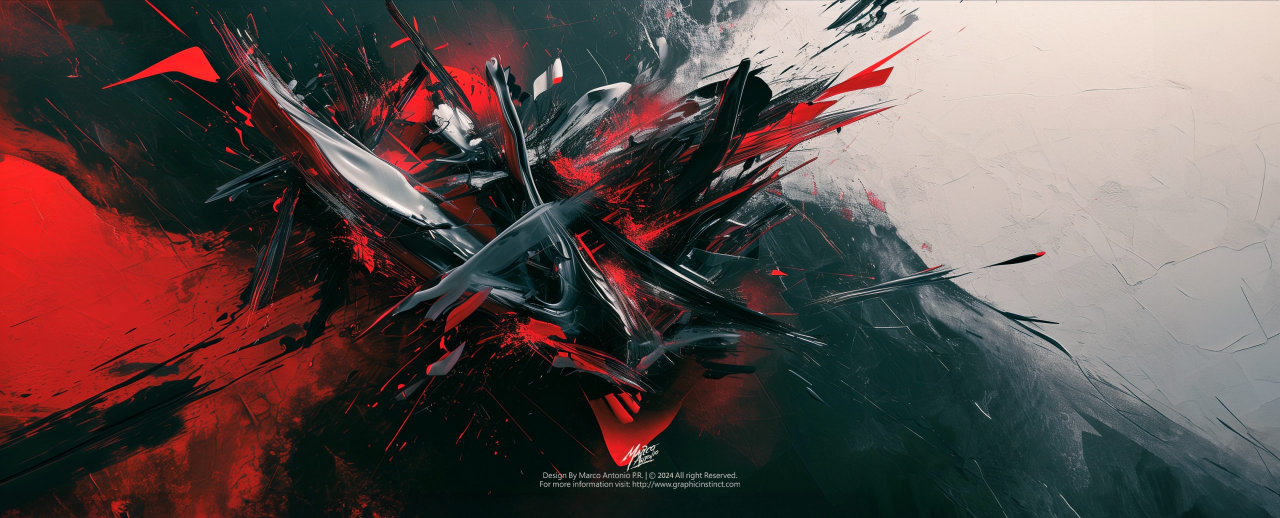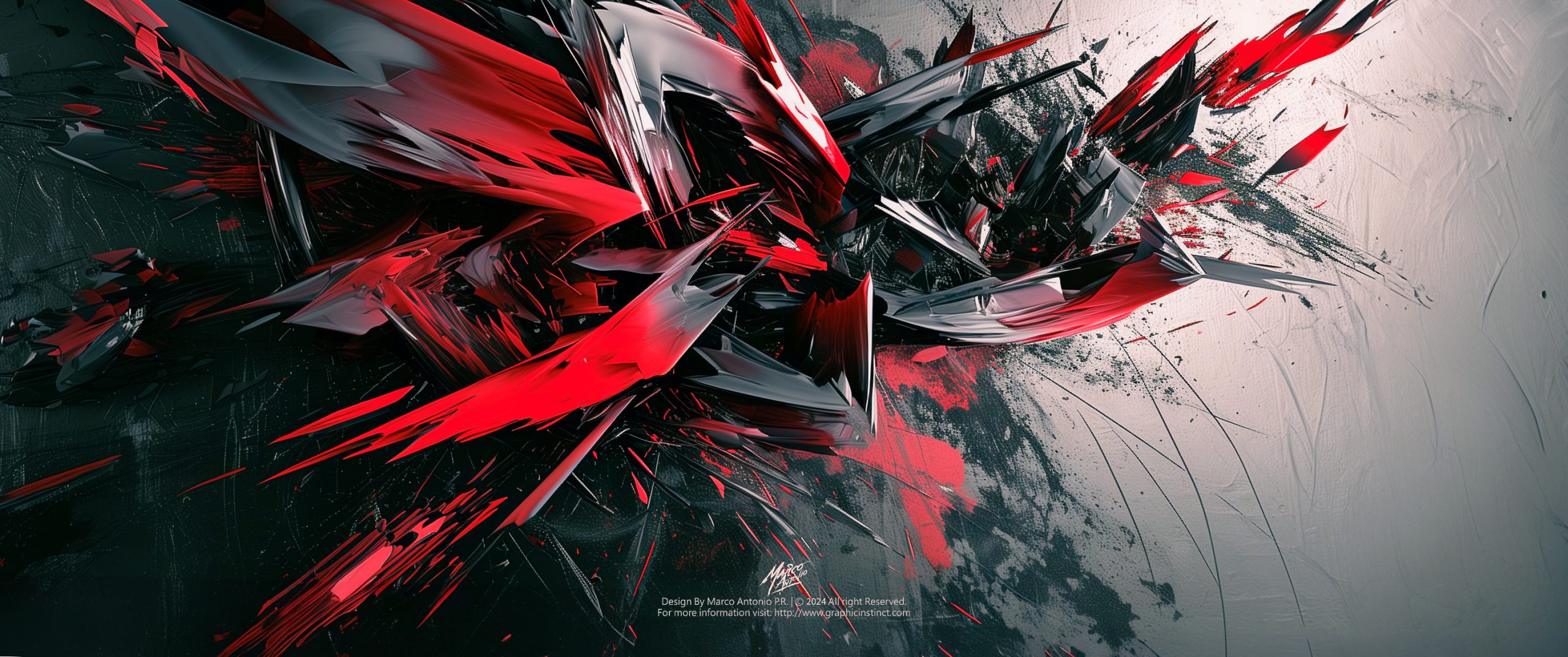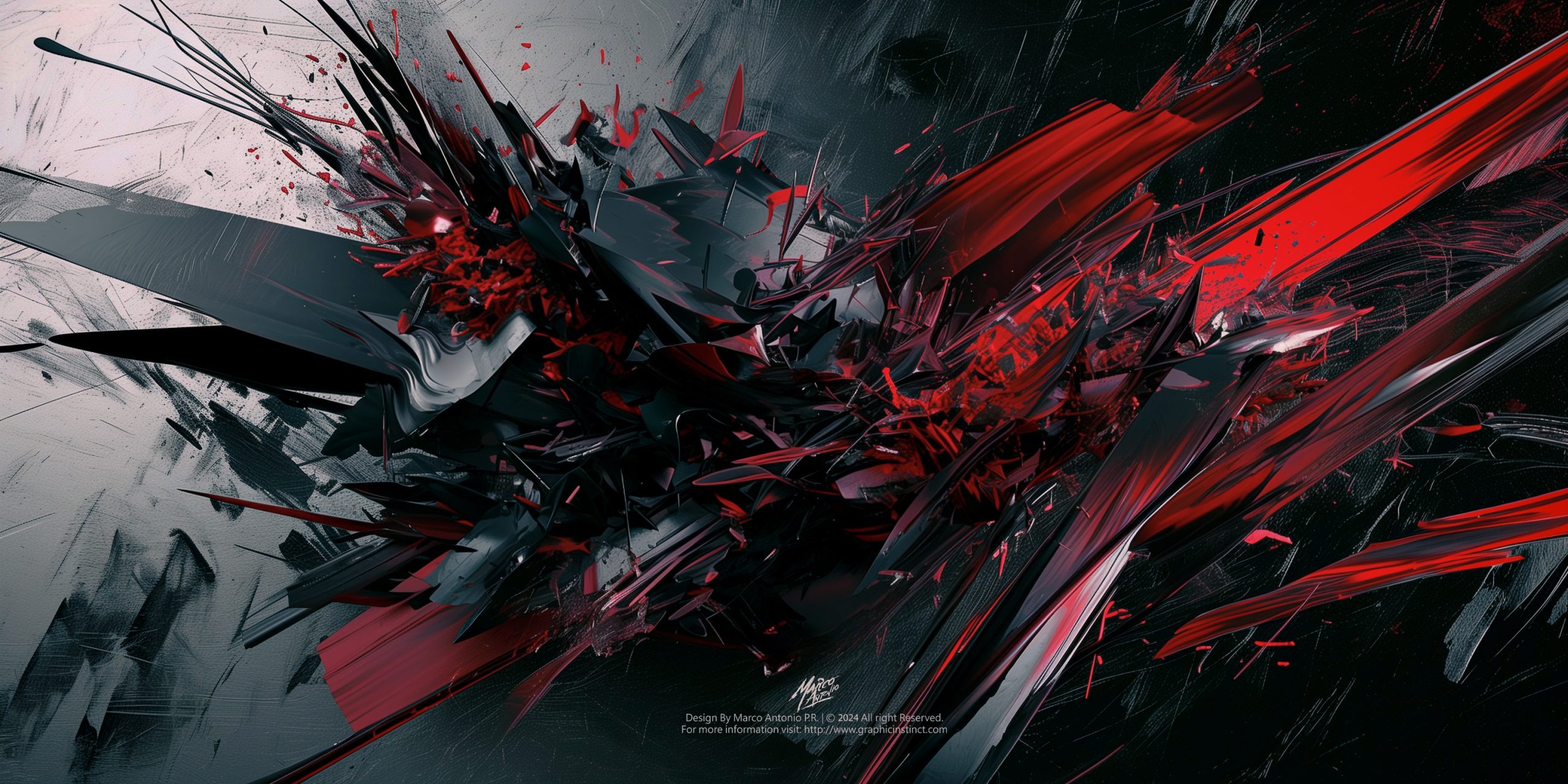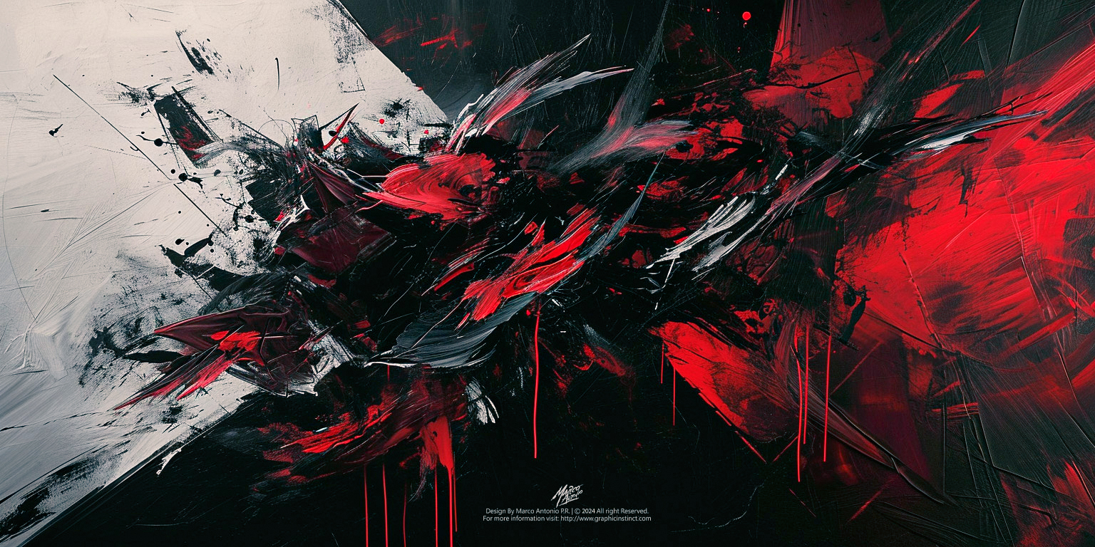 The composition employs a dynamic interplay of sharp, jagged forms, creating a sense of violent movement and disarray. The contrasting palette of black, red, and muted whites amplifies the visual tension, evoking the aesthetics of Abstract Expressionism, particularly reminiscent of Jackson Pollock’s action paintings but with a more digital, modern reinterpretation.