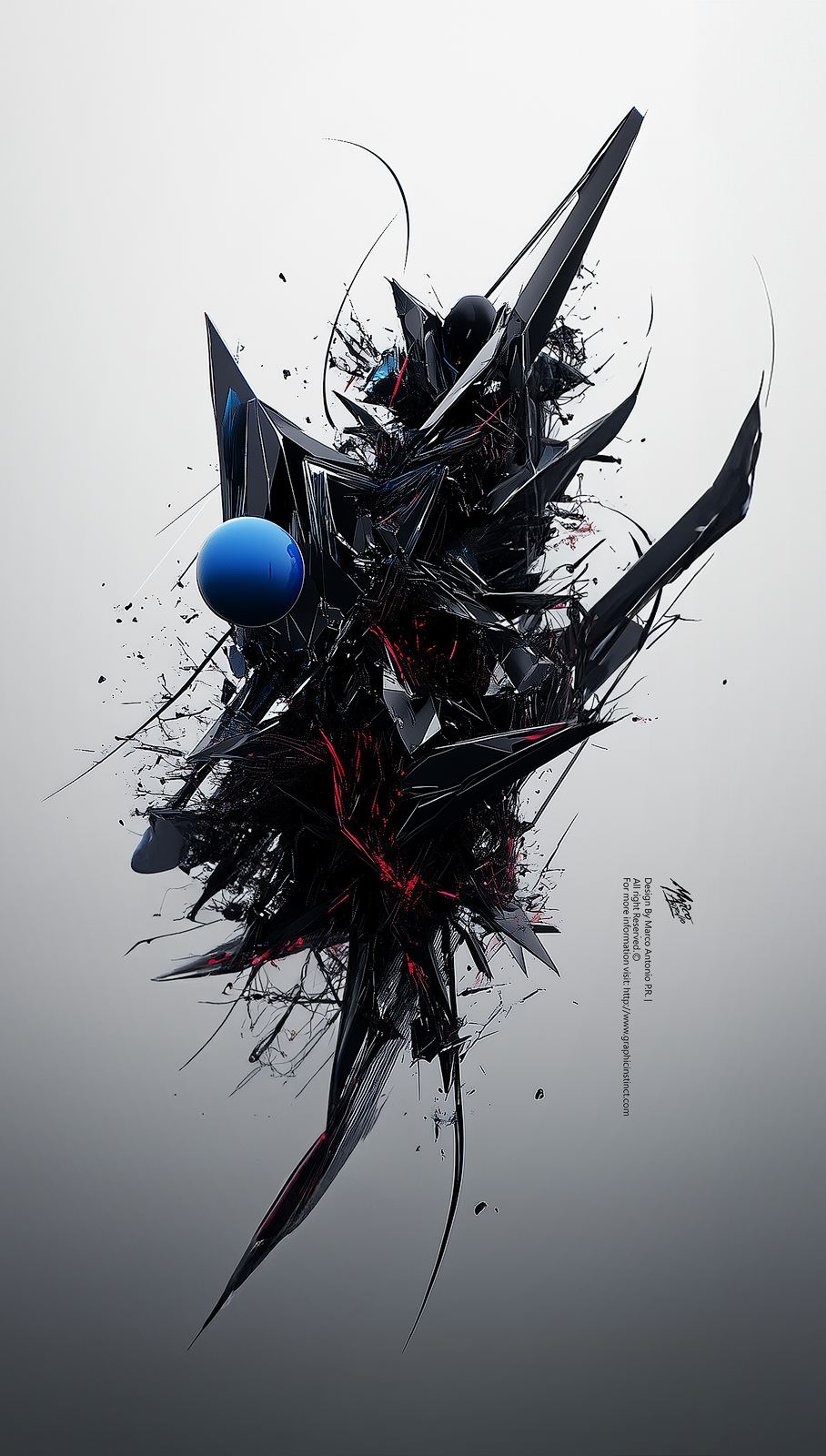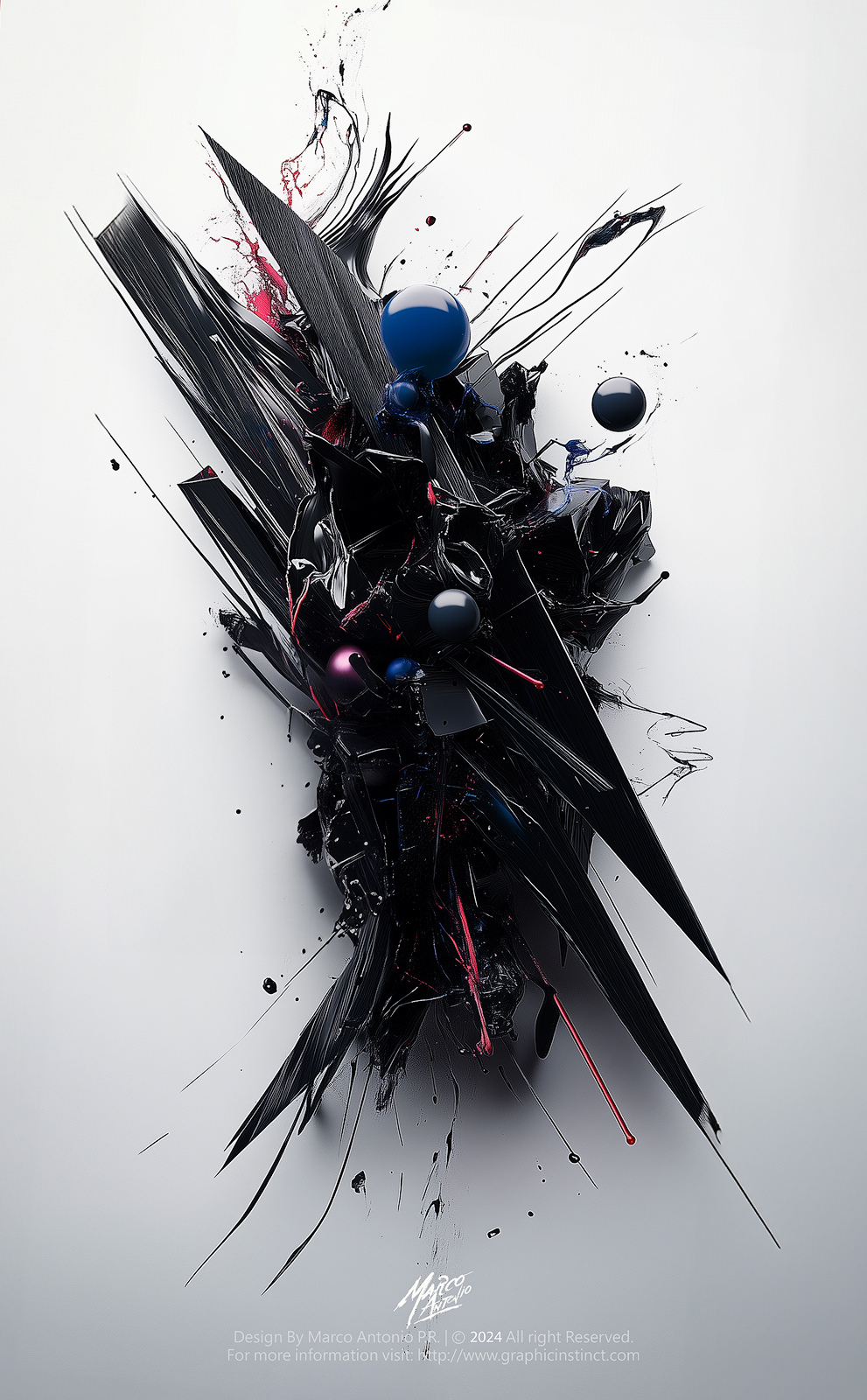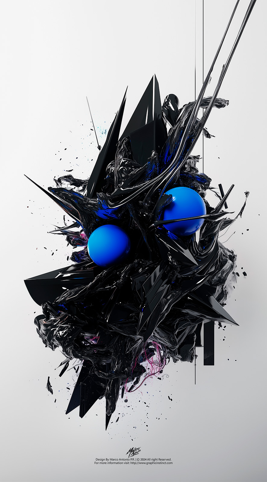 Technical analysis: The composition is rooted in abstract expressionism, evoking a chaotic arrangement reminiscent of Jackson Pollock’s vigorous energy and spontaneity. The black, glossy textures, combined with harsh, angular shapes, draw inspiration from cubism and the fragmented planes often found in Picasso’s work. Meanwhile, the deep blue spheres act as focal points, a striking contrast that recalls the essence of minimalist design, imbuing the piece with a sense of depth and tension. The dynamic lines and piercing angles evoke the futuristic aesthetics of constructivism, while the fluidity in some elements brings a hint of biomechanical surrealism similar to Giger’s work. The balance between the stark black and the vivid blue suggests an homage to Yves Klein and his exploration of color intensity.