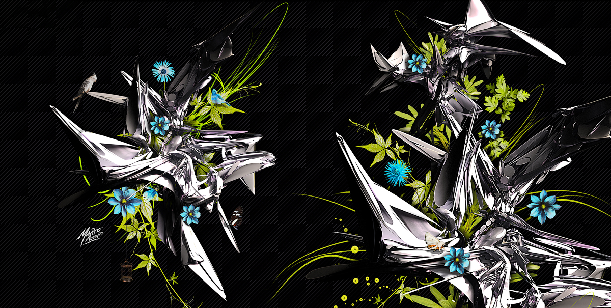 Chromatic Genesis of Metallic Flora 3D Abstract Backgrund Blue CGI Darck Digital Green Visuals Wallpaper